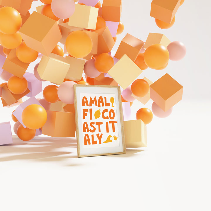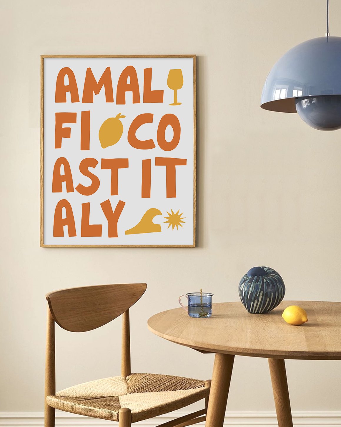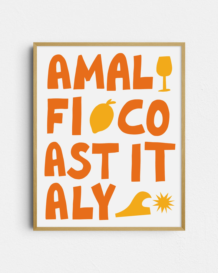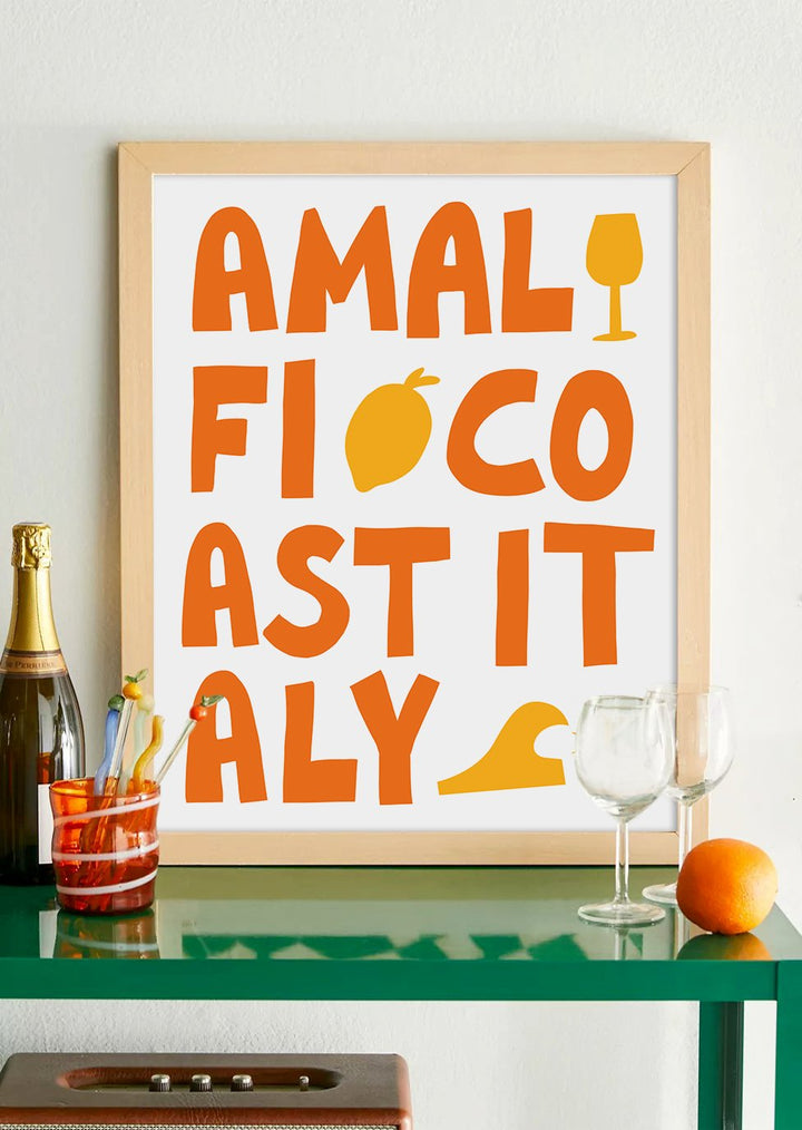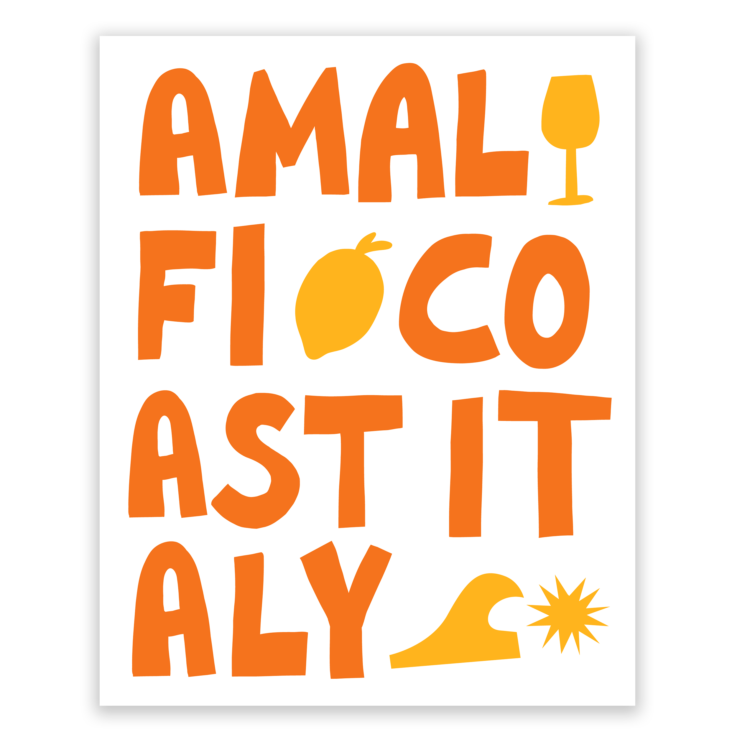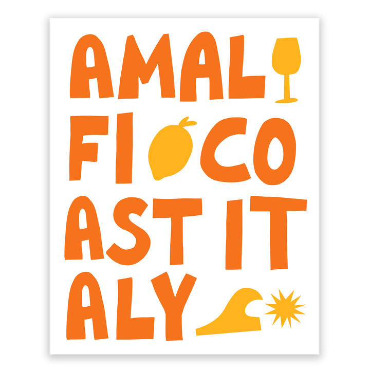 Represent the sunny southern coast of Italy with this bold and colorful typography art print. The warm striking colors and playful graphic icon illustrations of lemons, wine, and the waves of the Mediterranean sea perfectly capture the essence of the Amalfi coast. Bring la dolce vita home with this vibrant and eye-catching wall art!