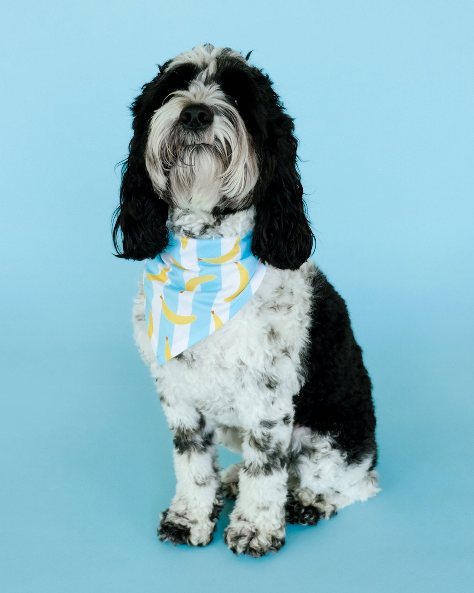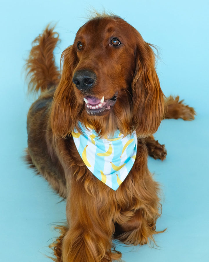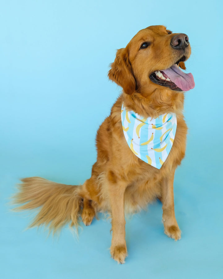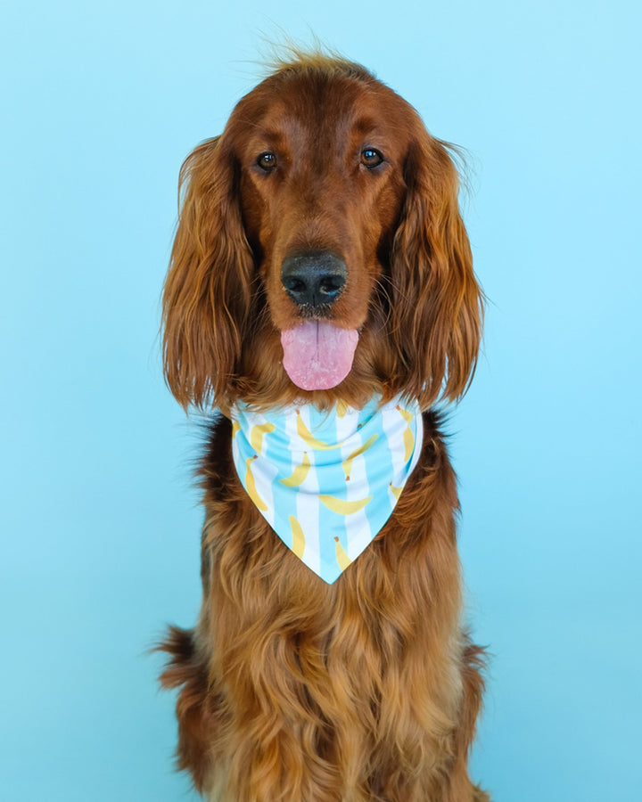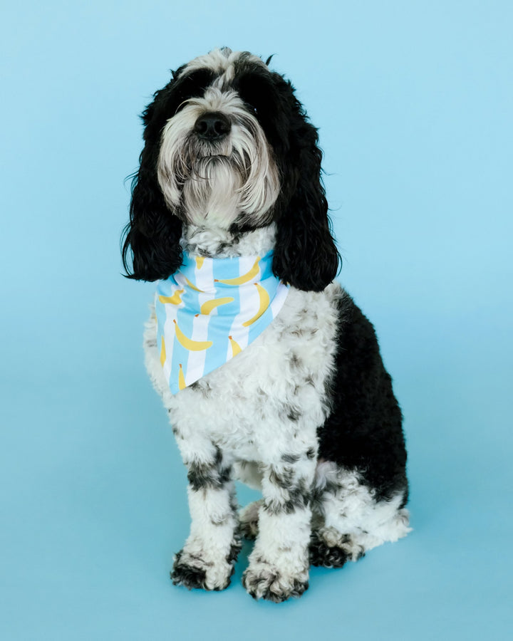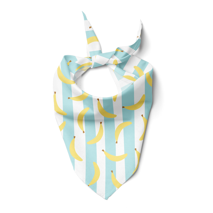 Spoil your high-energy furball with this whimsical banana-striped bandana and watch them become the most adorably trendy doggo at the park. It's the perfect accessory for the dog that never seems to run out of zoomies and always brings the party. Adorned with a charming banana print set against cool blue and white stripes, this bandana is sure to match your pup's lively spirit and turn heads during your fun-filled escapades. It’s not just a bandana; it’s a badge of honor for the playfully spirited and endlessly loving good boy/good girl in your life.