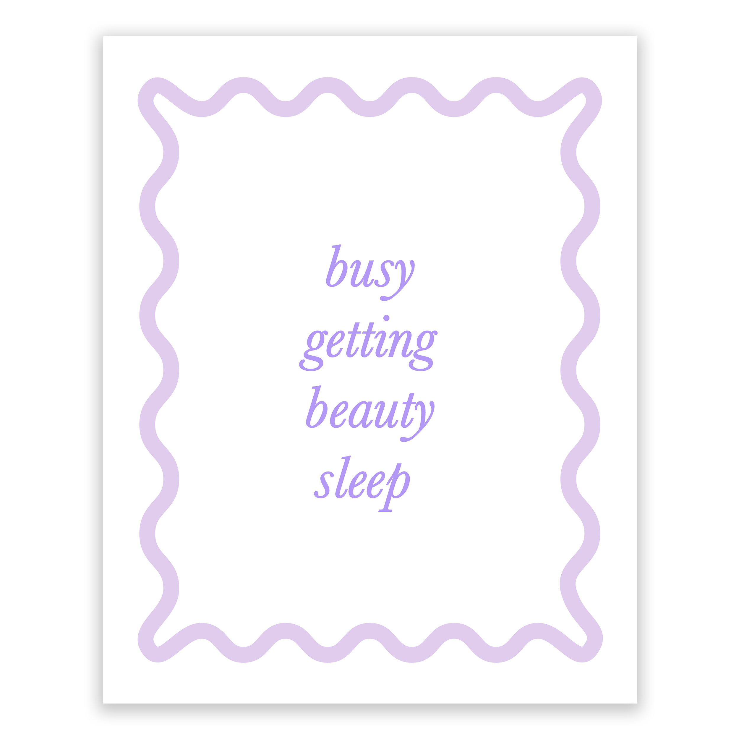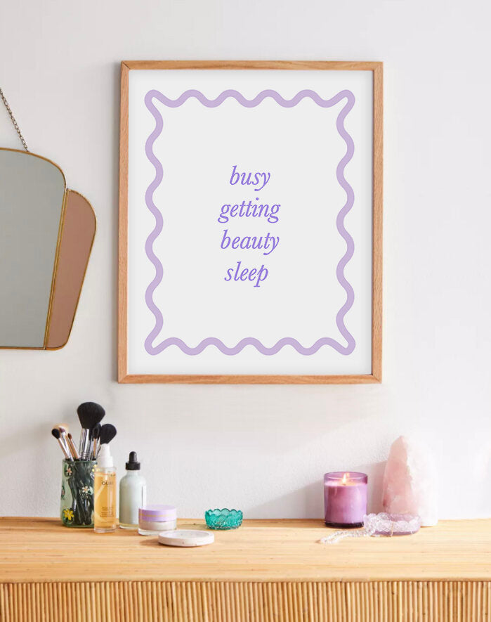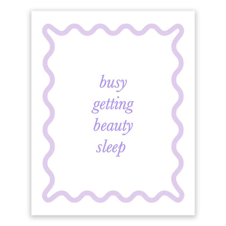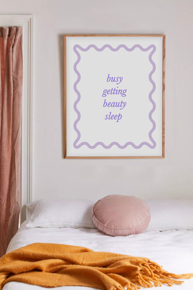 This charming art print, bordered with a lilac squiggle, boasts the playful phrase "busy getting beauty sleep," making it an adorable addition to any bedroom decor. It's the ideal wall art for the girlies who cherish their beauty rest, adding a touch of whimsy and color above the bed. Perfect for anyone who loves a combination of cute aesthetics and the joy of a good night's sleep, this piece is a must-have for creating a cozy and stylish sleep sanctuary.