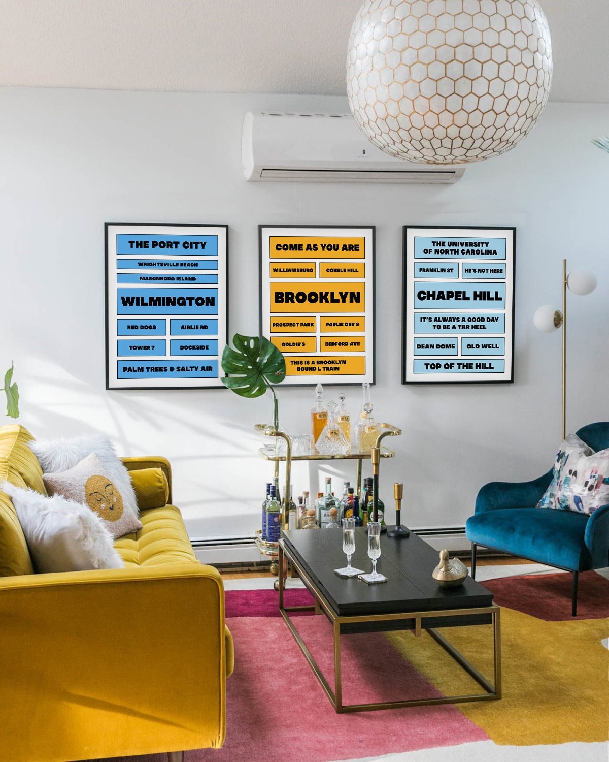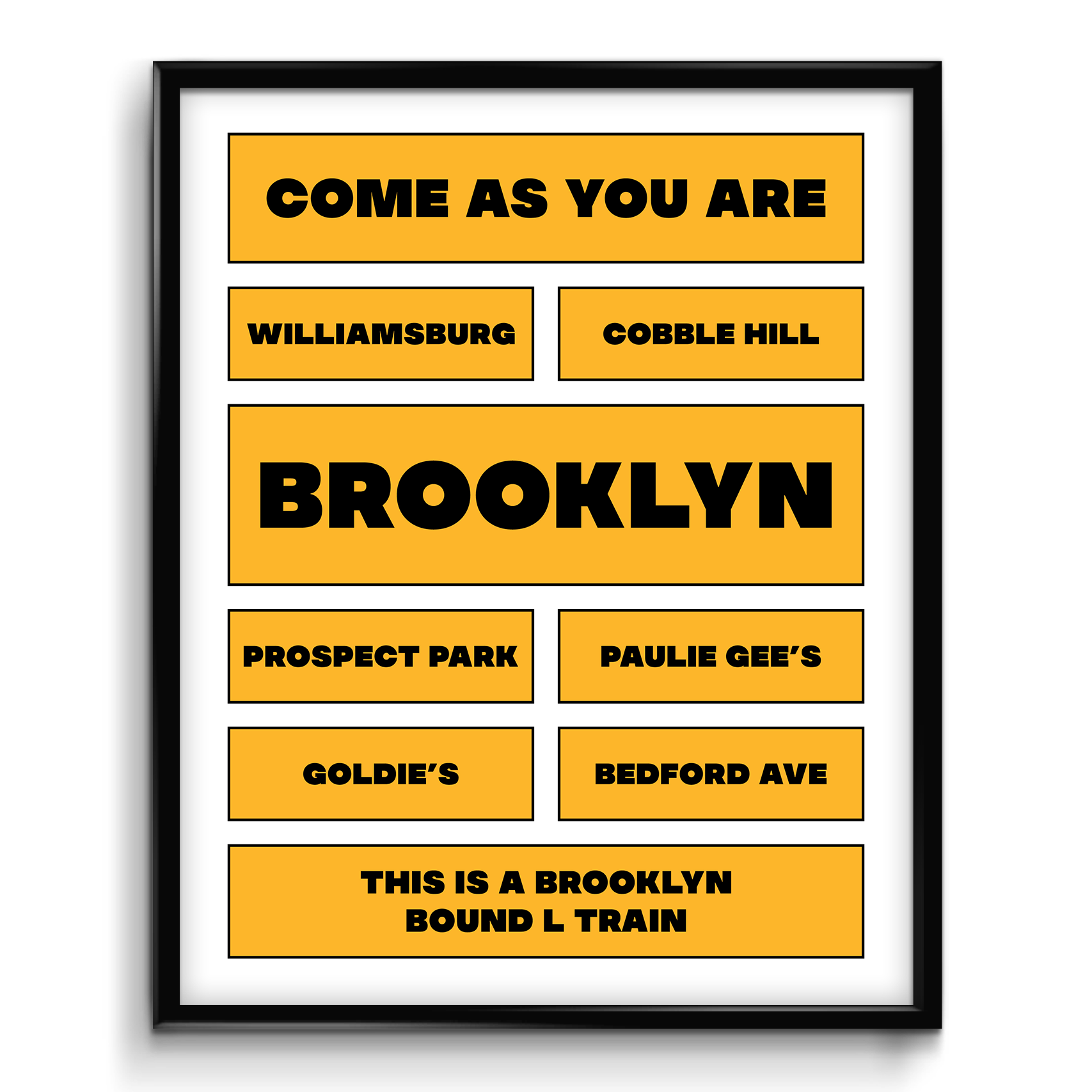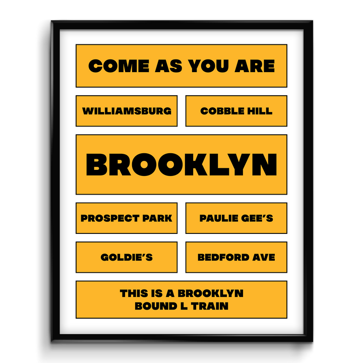 Inspired by retro concert posters, this graphic “Brooklyn City Poster” artwork pays homage to the boroughs most iconic and beloved spots. From trendy Williamsburg to the charming streets of Cobble Hill, this piece captures the essence of urban living in Brooklyn. Highlights include: Propspect Park, Paulie Gee’s, Goldies, Bedford Ave, the iconic subway announcement from Manhattan to Brooklyn stating, “This is a Brooklyn Bound L Train.”