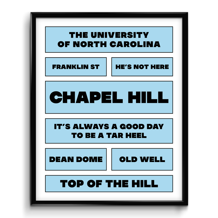 Inspired by retro concert posters, this Carolina Blue graphic artwork pays homage to Chapel Hill’s most iconic and beloved spots around the University of North Carolina at Chapel Hill. This is the perfect piece of art for dorm rooms or Tar Heel grads looking to commemorate their glory days at UNC! Highlights include: Franklin Street, He’s Not Here, the Dean Dome, the Old Well, Top of the Hill, and the classic UNC phrase “It’s always a good day to be a Tar Heel!” #GDTBATH