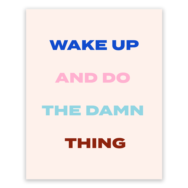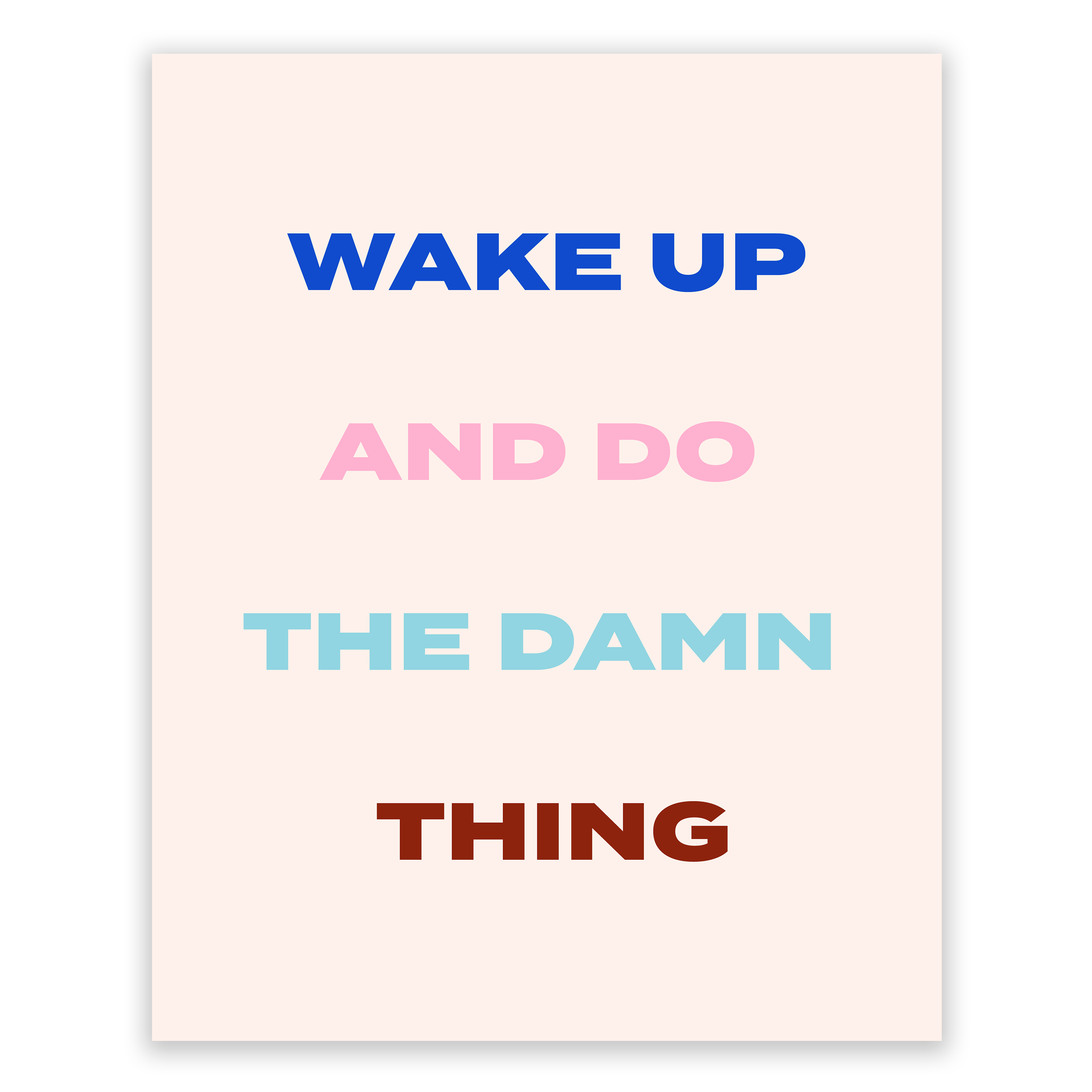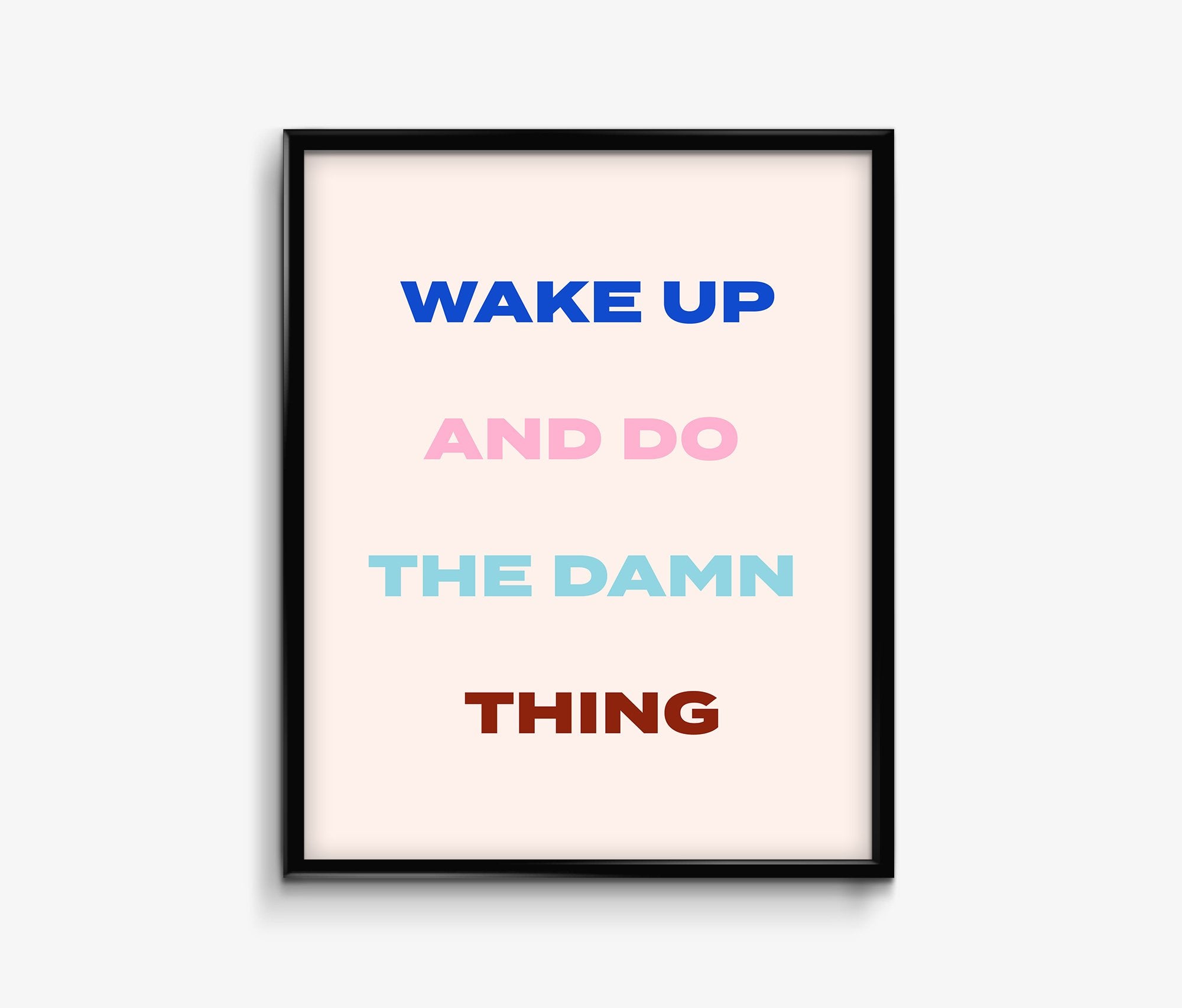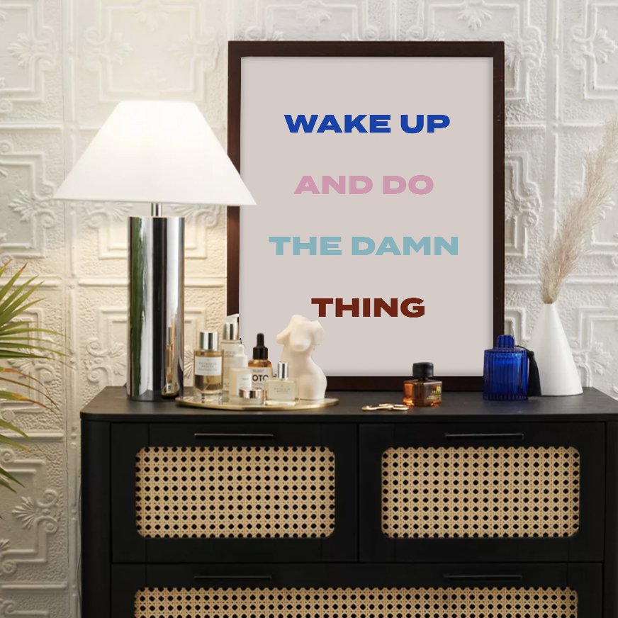 Kickstart your day with this bold typography art print that commands attention and action. With the phrase "Wake Up and Do The Damn Thing" set against a soft pastel background, it's the perfect blend of encouragement and modern design. Ideal for anyone needing an extra push, this print is a top pick for colorful home decor, making it a vibrant addition to any workspace or living area. Its energetic message and clean aesthetic make it a trendy choice for those looking to infuse their homes with positivity and style.