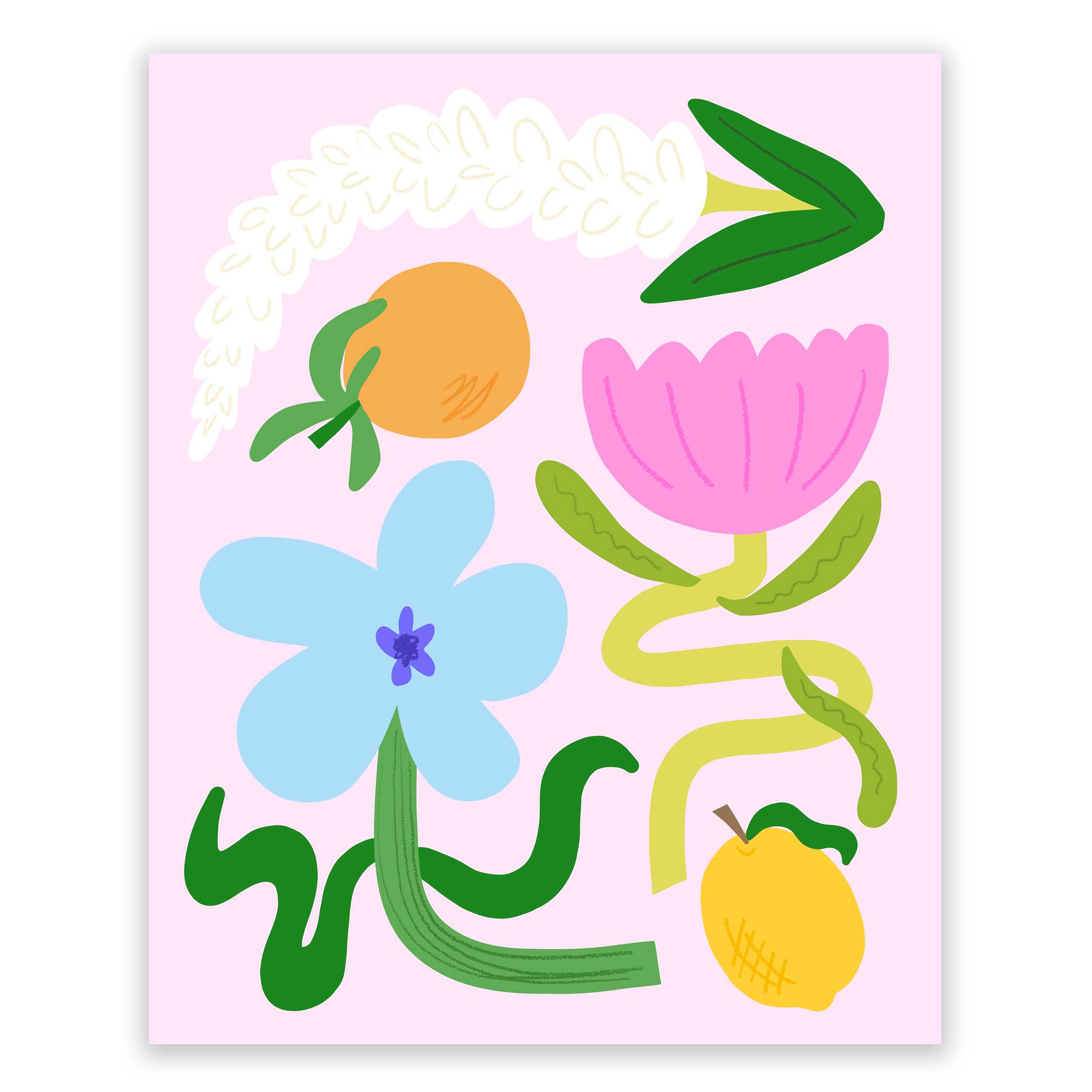 This art print is a delightful celebration of nature's sweetness, featuring a playful array of flowers and fruit set against a soft pink backdrop that radiates joy. The whimsical composition combines vibrant colors and simple shapes, bringing a burst of freshness and contemporary style to any room. It's an ideal choice for anyone looking to infuse their space with the cheerful essence of a blooming garden and the zest of sun-ripened produce. Perfect for modern home decor, this piece adds a charming touch to any room it’s displayed in.