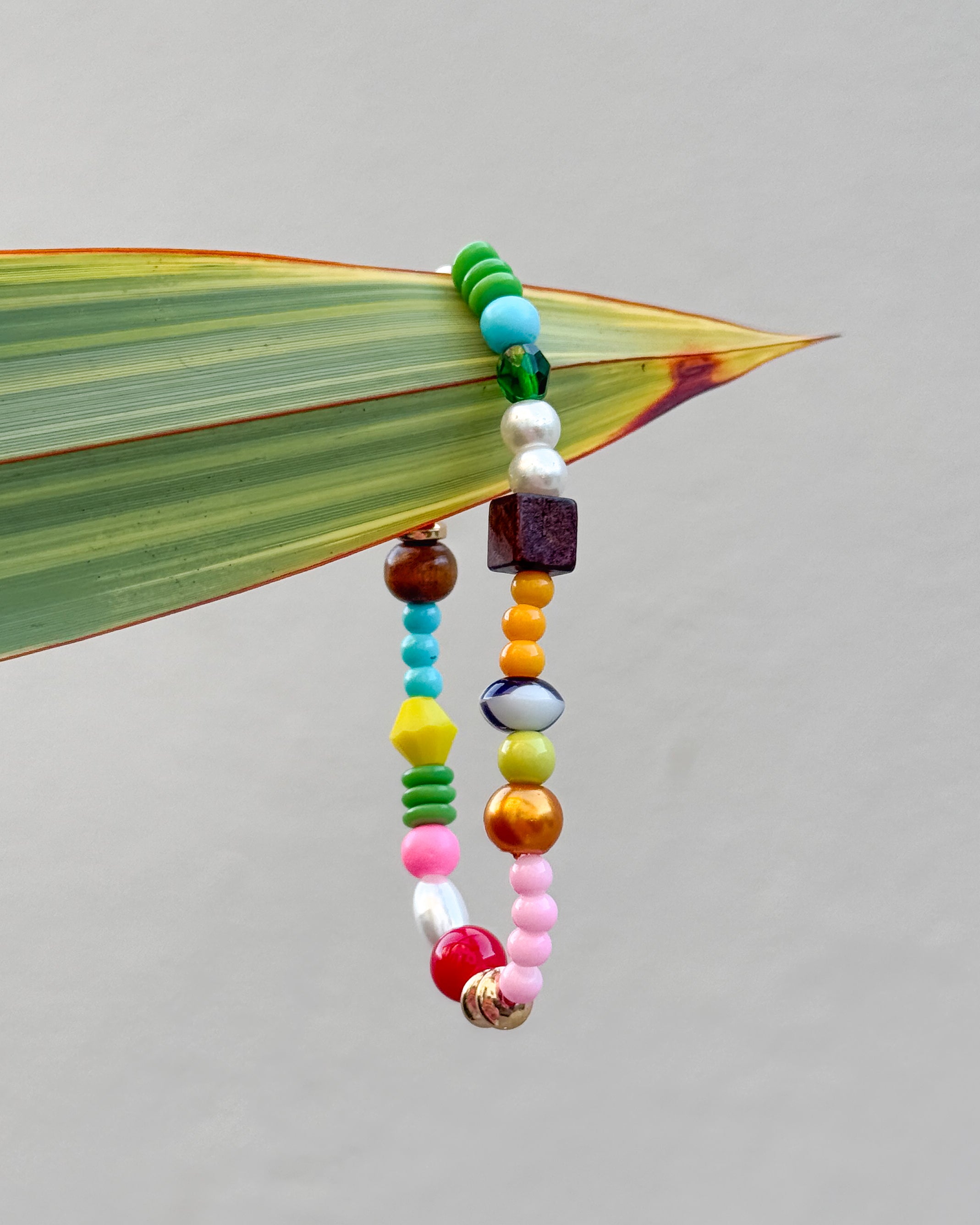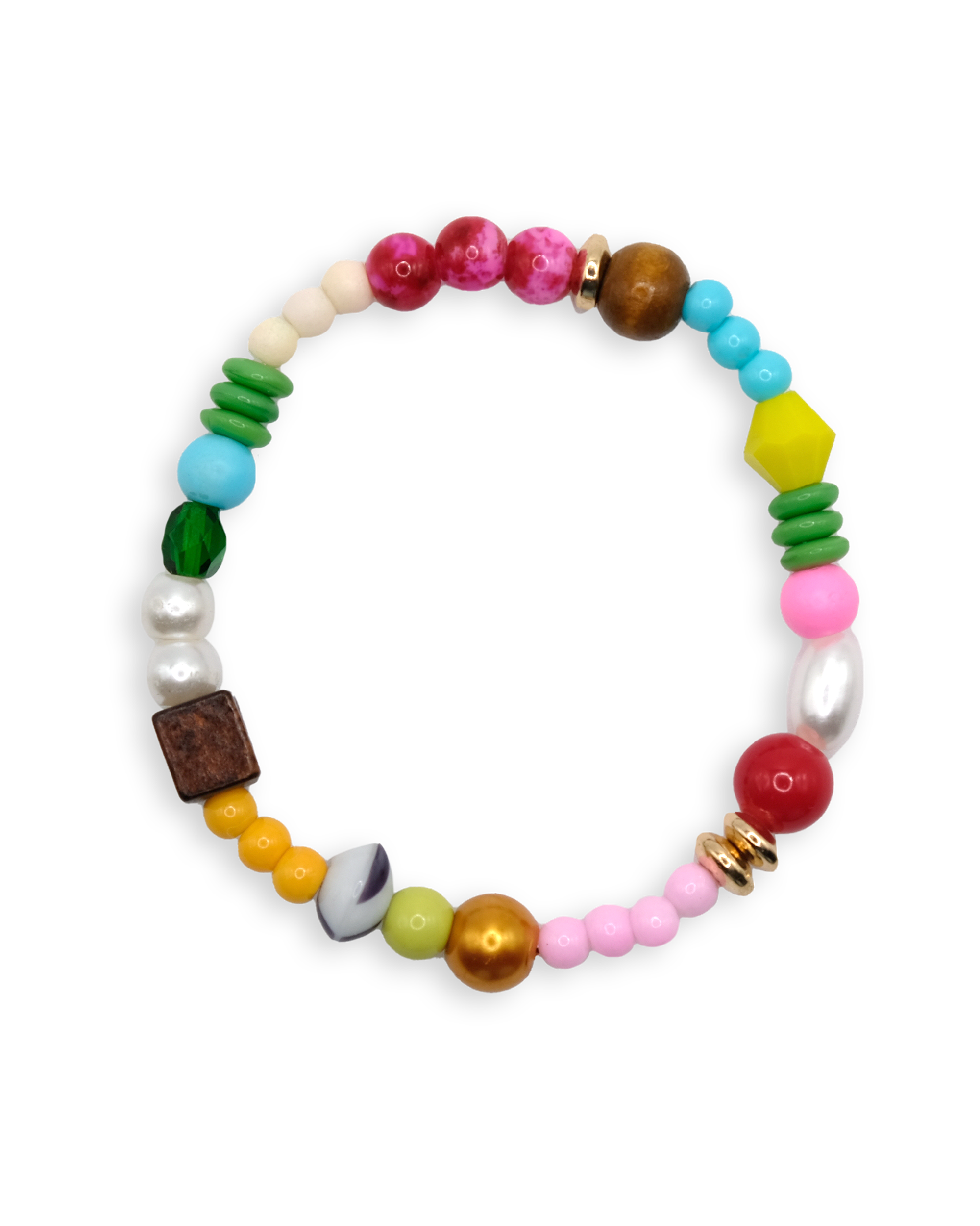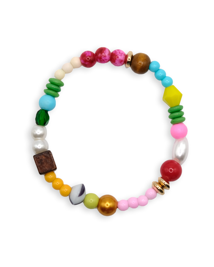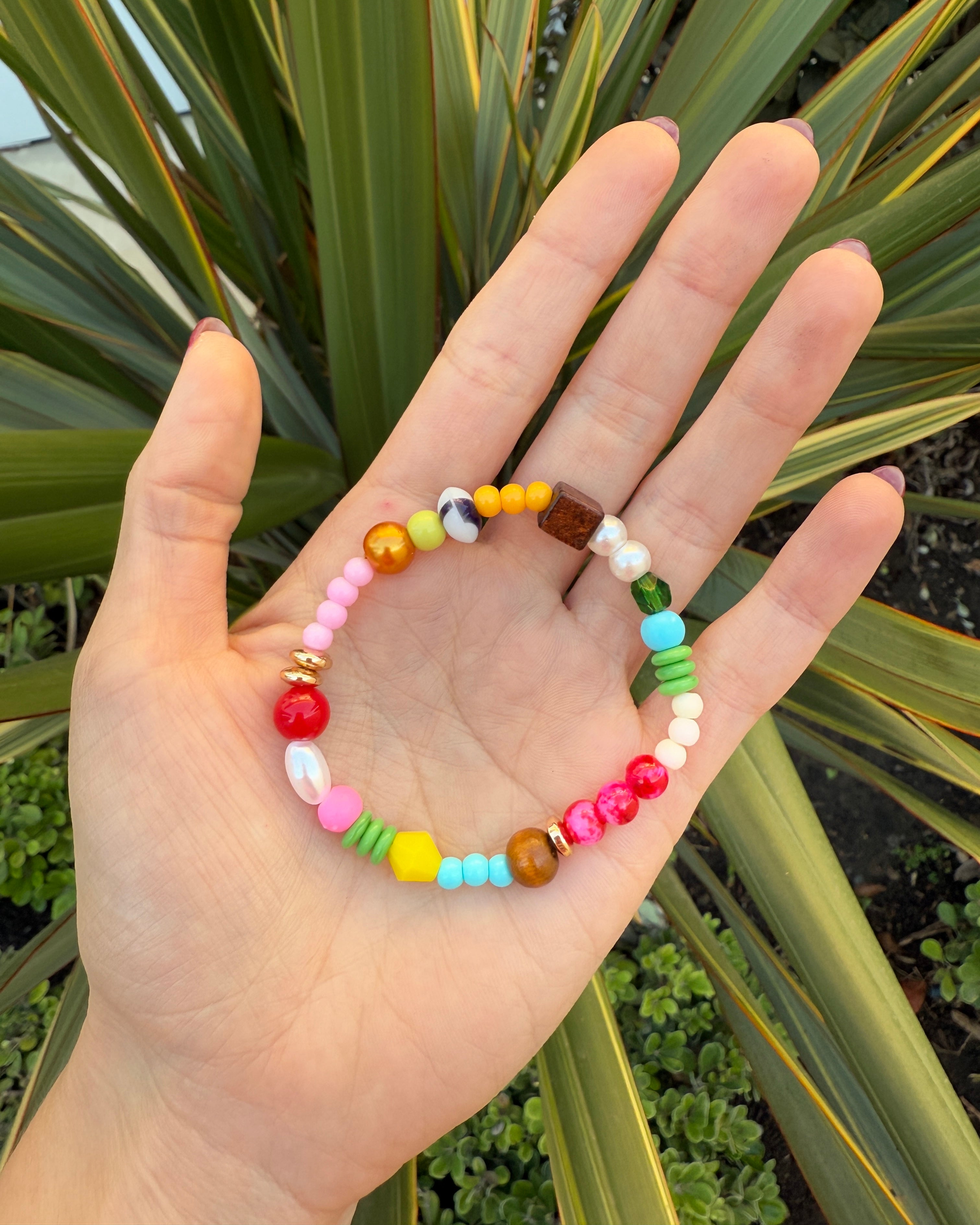 A whimsical, playful bracelet inspired by the charm of girl dinners and their endless assortment of snacks. Looks adorable worn solo as a statement piece, or stacked with other bracelets. This colorful bracelet adds some fun to any outfit.