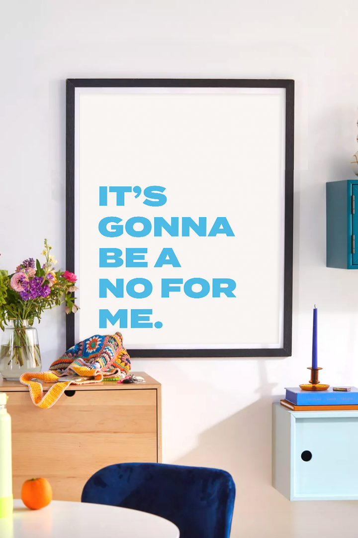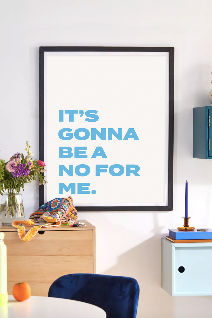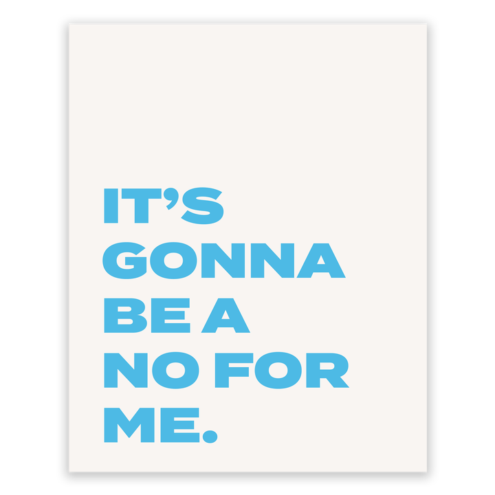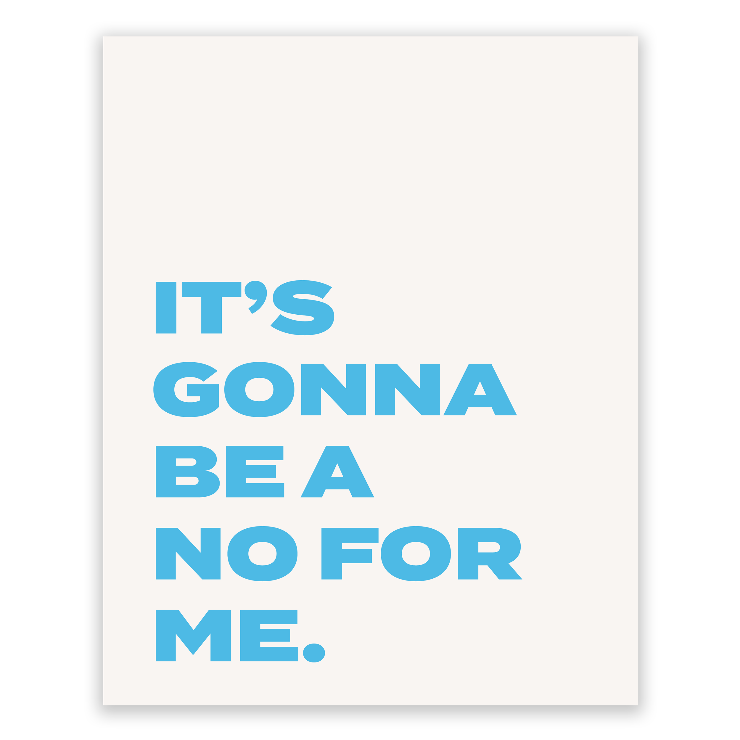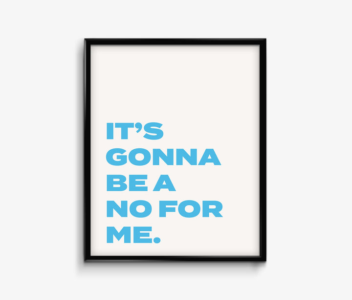 Add a touch of wry wit to your walls with this typographic art print that boldly states, "It's Gonna Be A No For Me." Its minimalist design and vibrant blue lettering make it a cool, comical addition to any room looking for a dash of personality. Perfect for those with a love for dry humor and a penchant for stylish quote art, this poster is poised to be a conversation starter in your home office or living space.