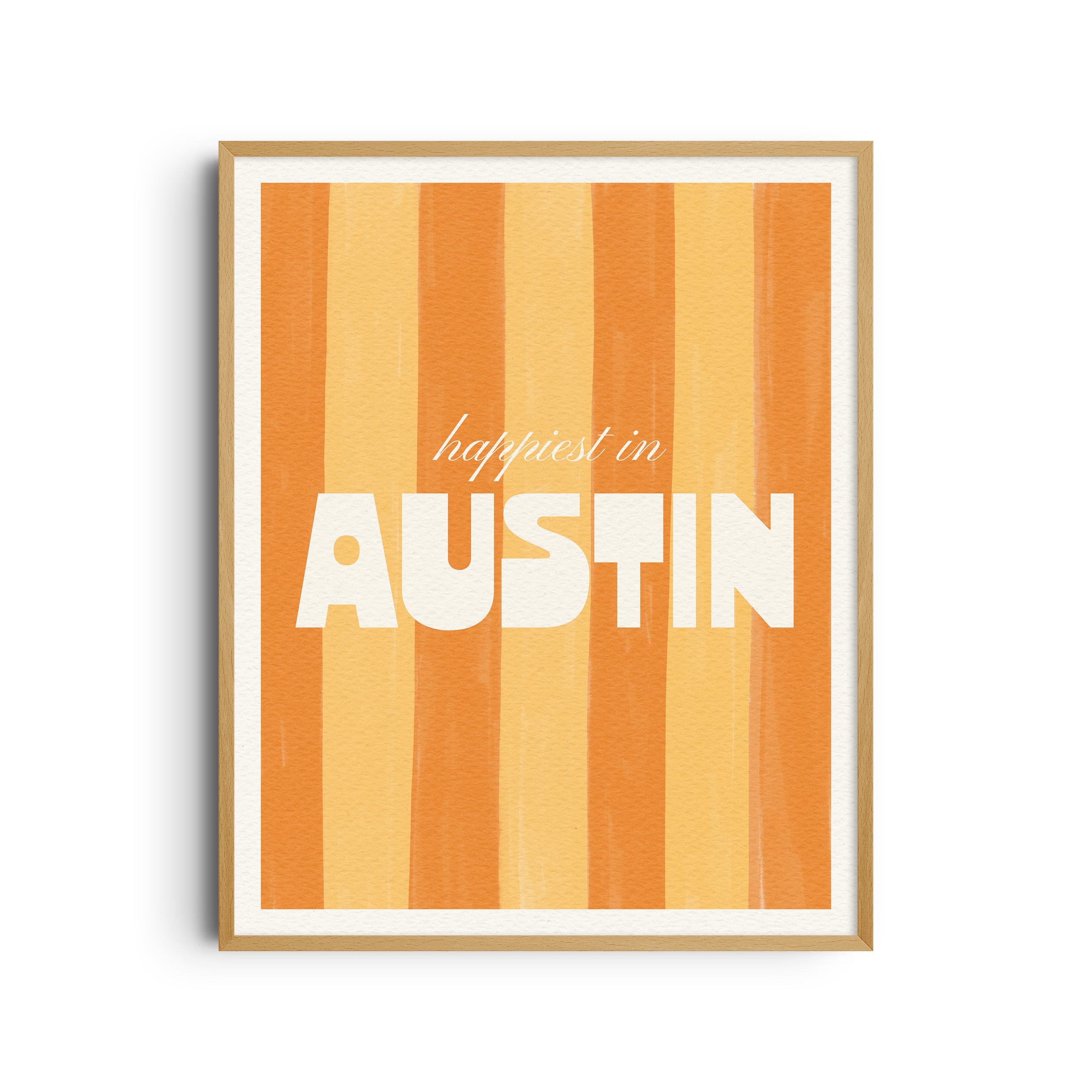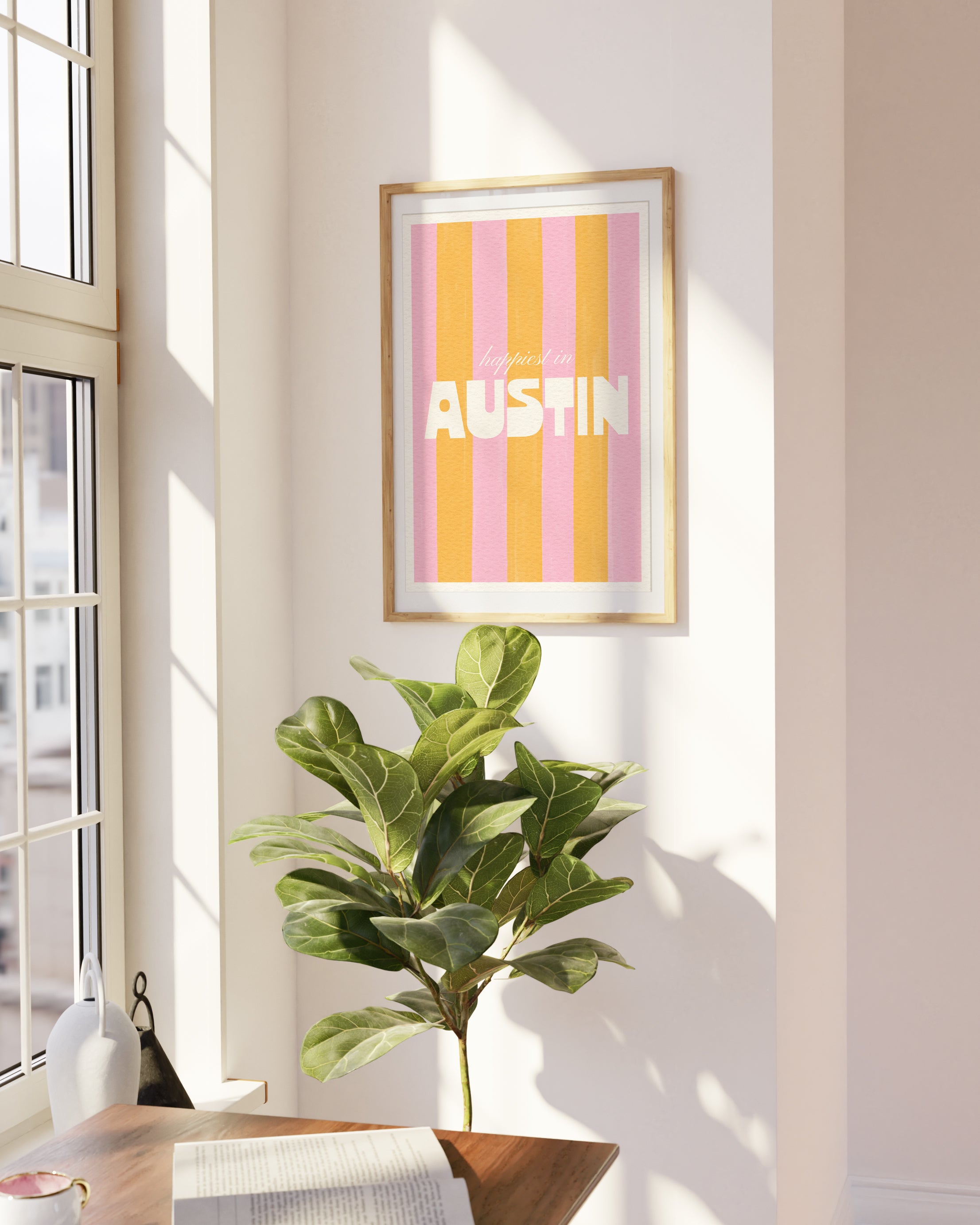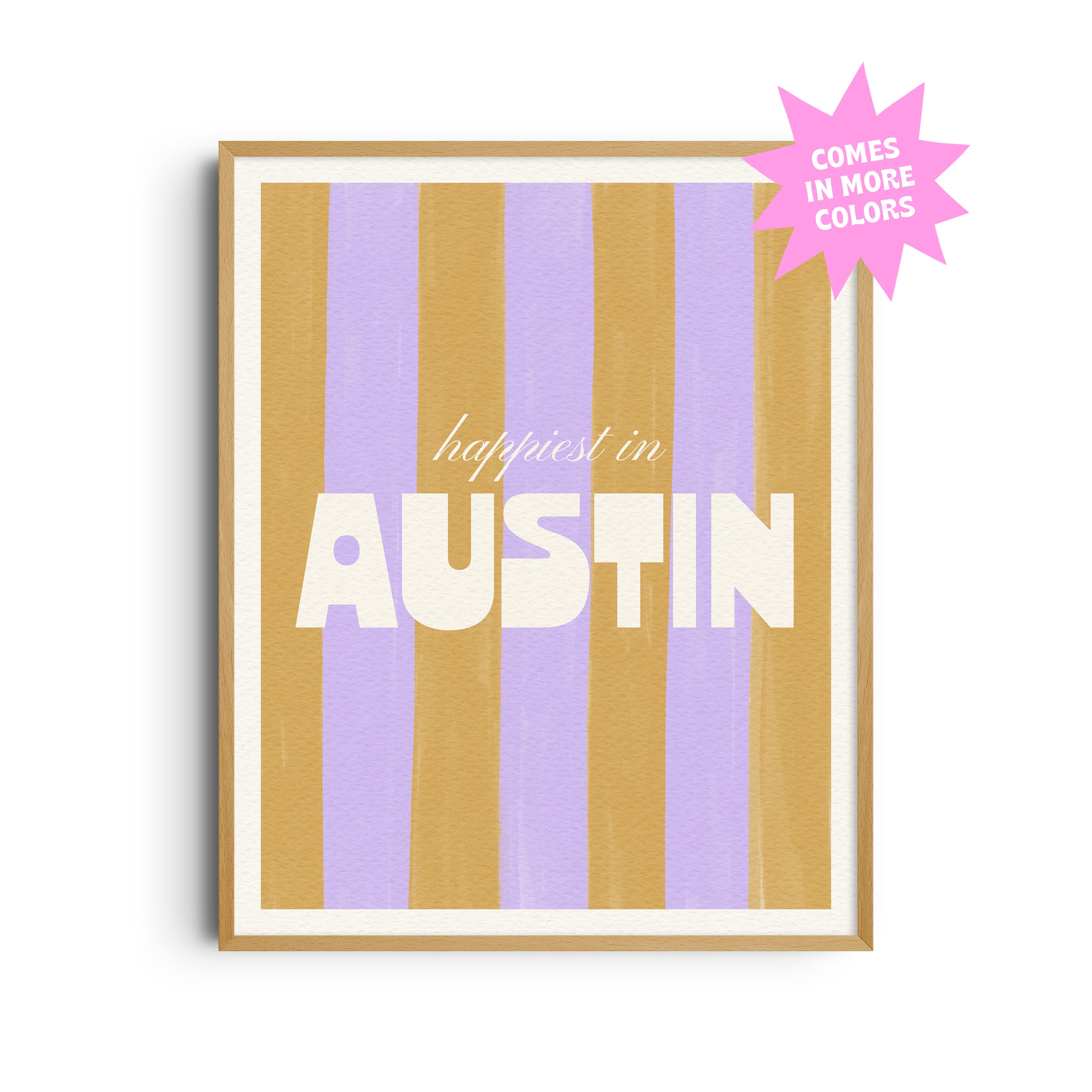 A retro bold striped art print perfect for anyone who's happy place is cowboy boots, country music, and tacos in Austin, Texas. Yeehaw!
