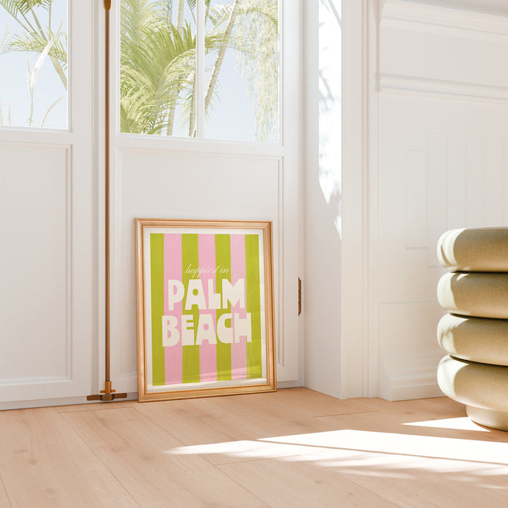 A retro bold striped art print perfect for anyone who's happy place is colorful beach houses, palm trees, golf, and wearing kaftans in Palm Beach, Florida. This fabulous wall art features the quintessential preppy pink and green colors found all over Palm Beach (most iconically at the Colony Hotel).
