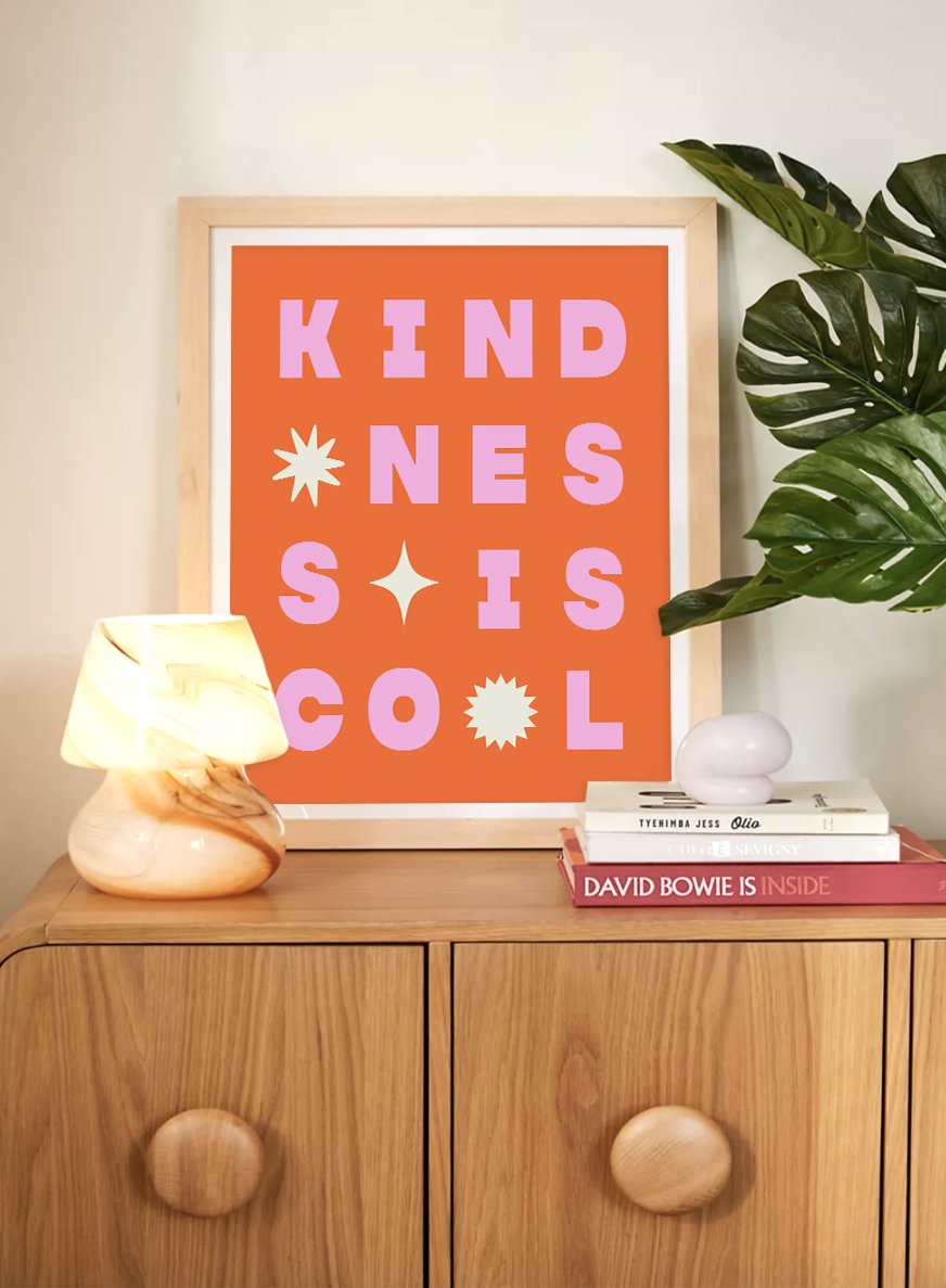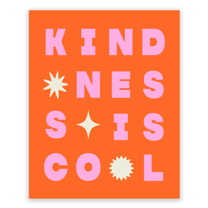 Bring a pop of positivity to your walls with this vibrant and uplifting best-selling art print. The piece features bold pink letters and funky star shapes that stand out against a vivid burnt orange background. Perfect for anyone who loves a touch of playfulness in their decor, it serves as a daily reminder that kindness never goes out of style. “Kindness is Cool” is the ideal blend of modern design and feel-good vibes for your home!