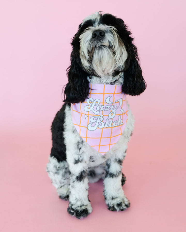 For the diva pup who loves their naps as much as they love their style, this sassy “Lazy Bitch” dog bandana is the perfect accessory. Its trendy pastel pink grid pattern adds a pop of color and a dash of whimsy to any female dog’s ensemble. Ideal for Instagram-worthy moments or just lounging around the house, this bandana is an essential for any pet parent looking to boost their dog's wardrobe with some cheeky charm. Easy to tie on and comfortable to wear, it's the go-to for adding a splash of sass and humor to your dog's daily look.