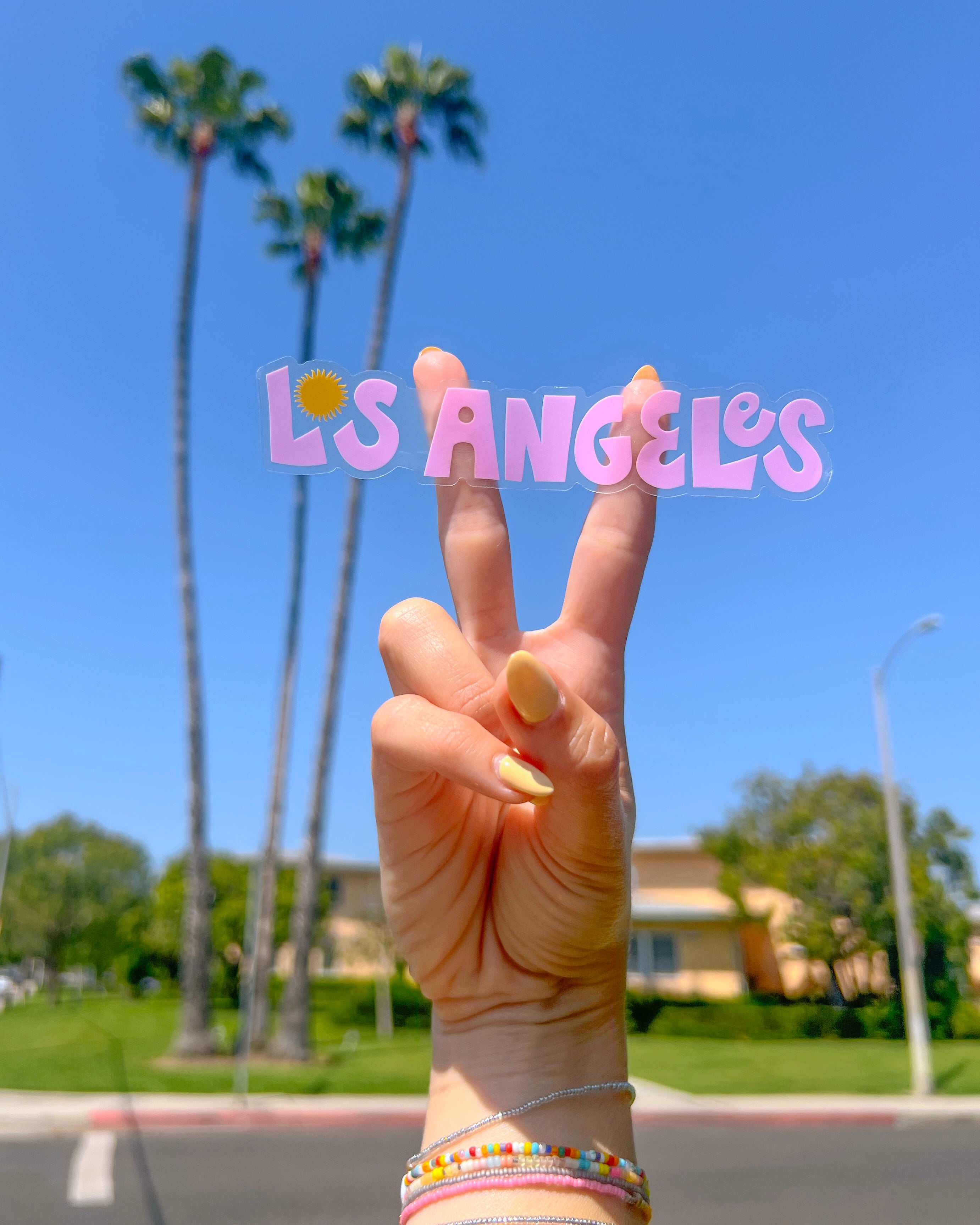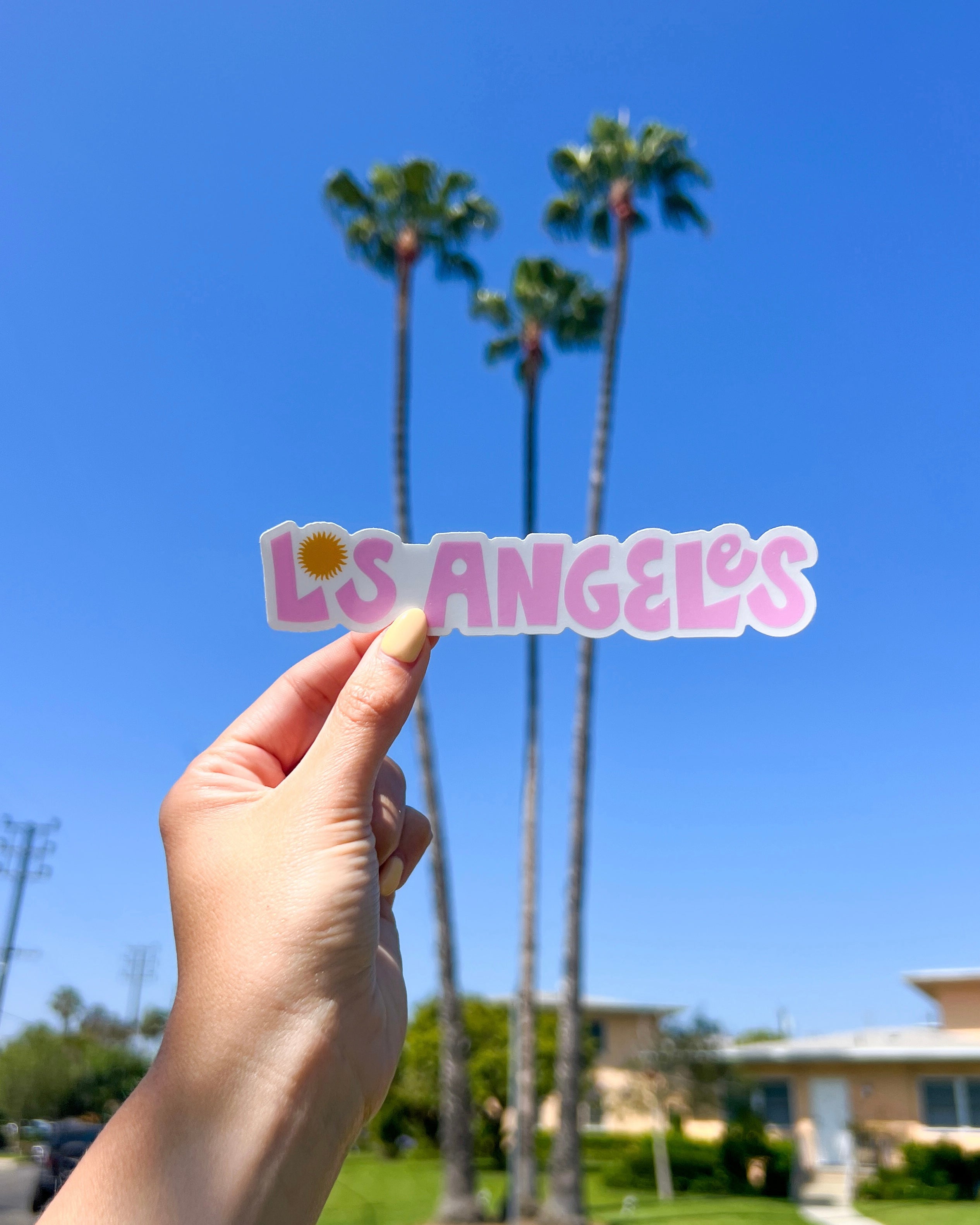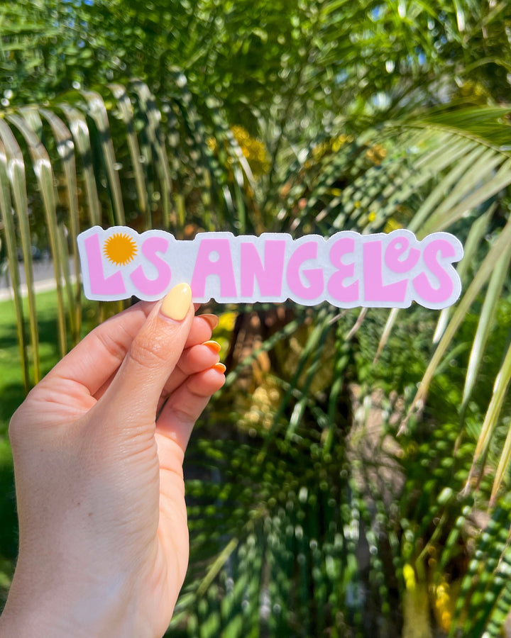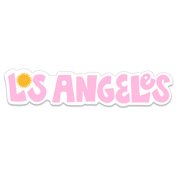 A funky hand-lettered sticker to represent the lovely sunny city of Los Angeles! Bright pink chunky letters with a cheerful yellow sun as the "o". Sticker backing is transparent.