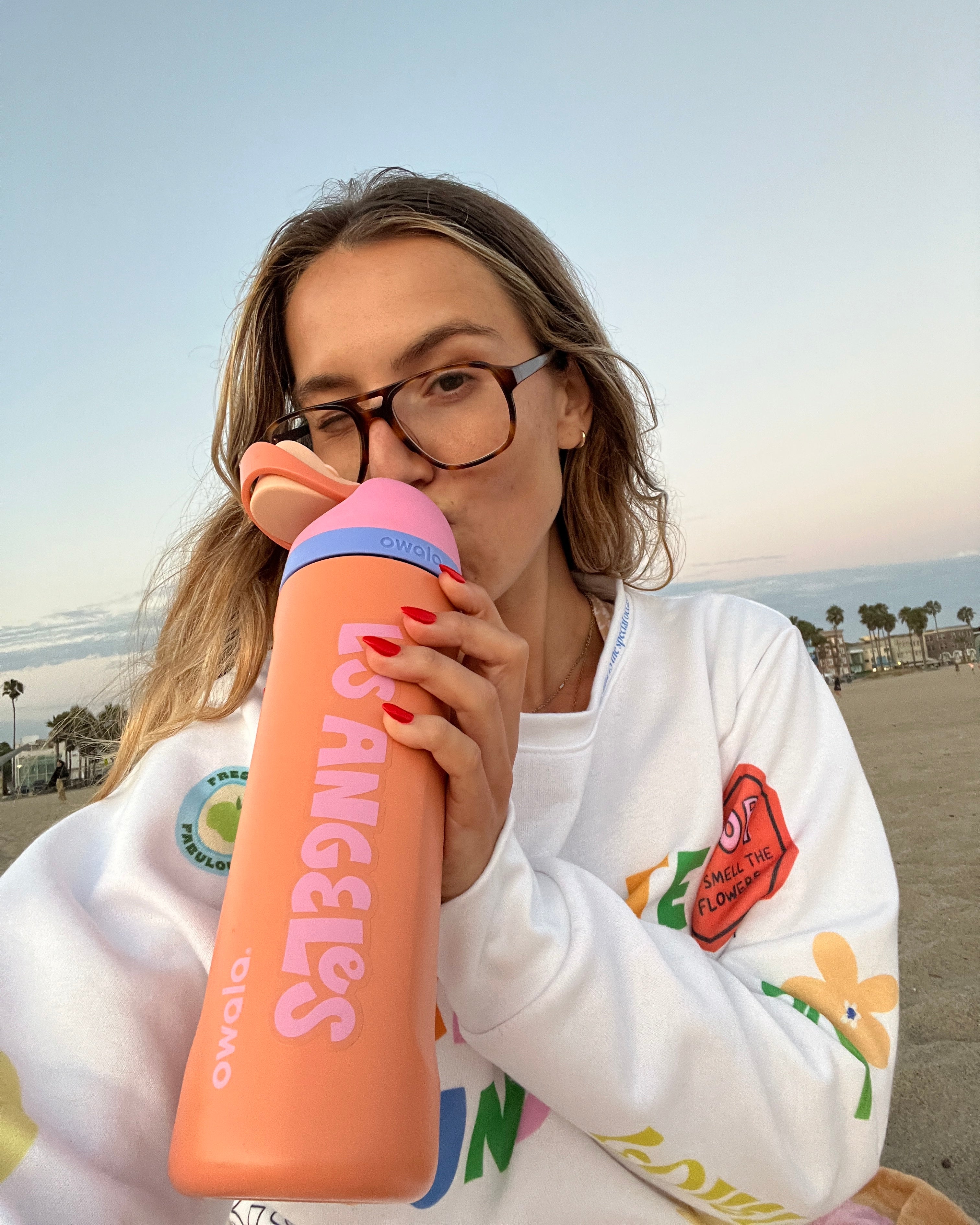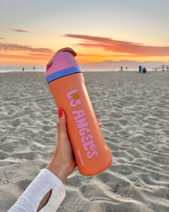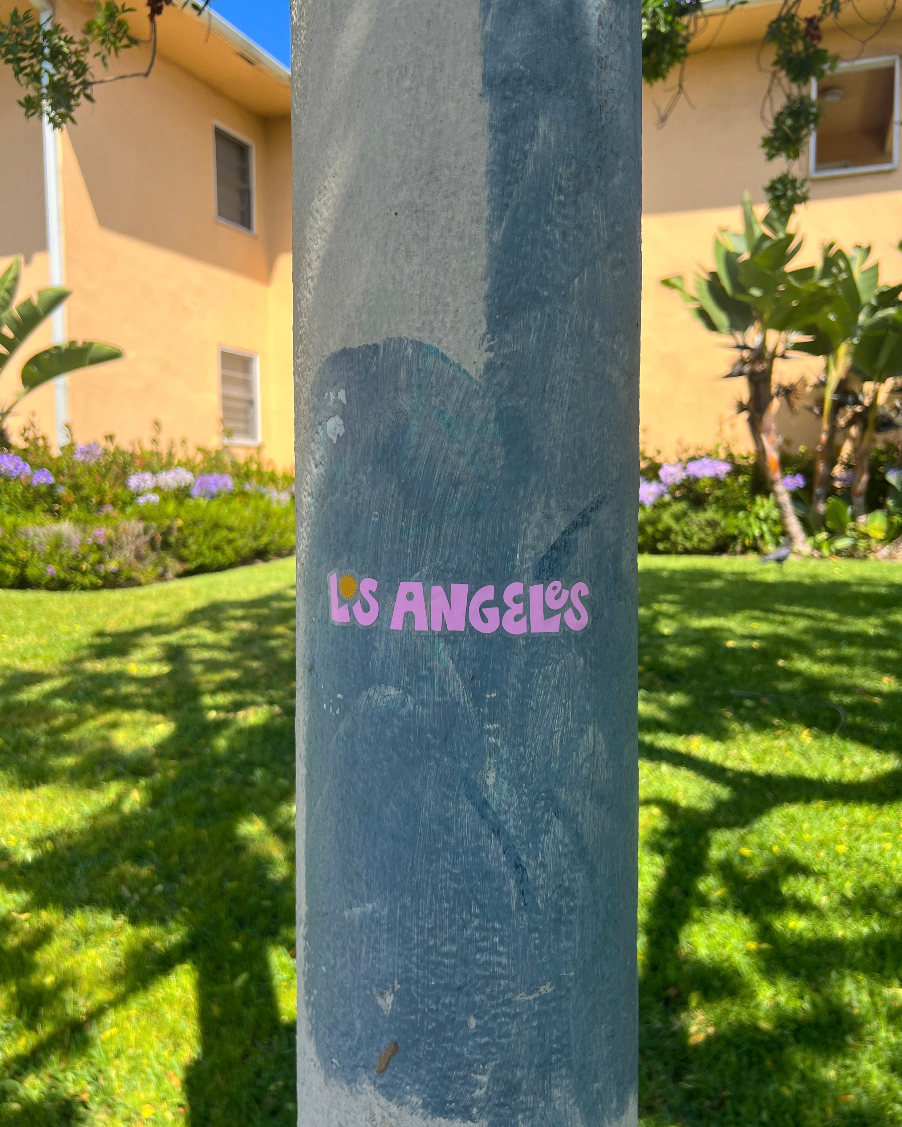 A funky hand-lettered sticker to represent the lovely sunny city of Los Angeles! Bright pink chunky letters with a cheerful yellow sun as the "o". Sticker backing is transparent.