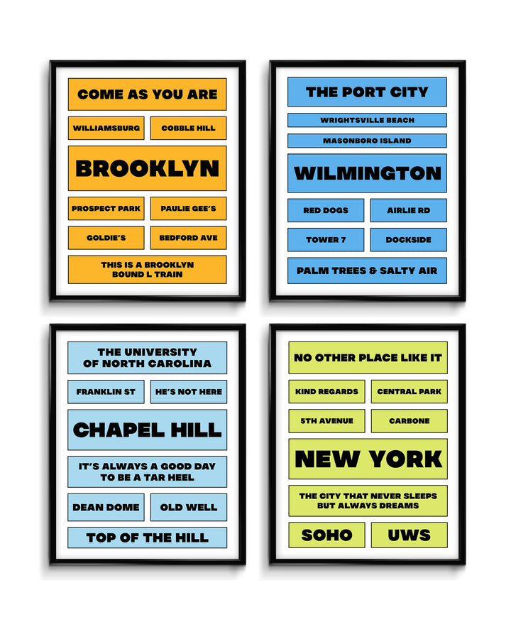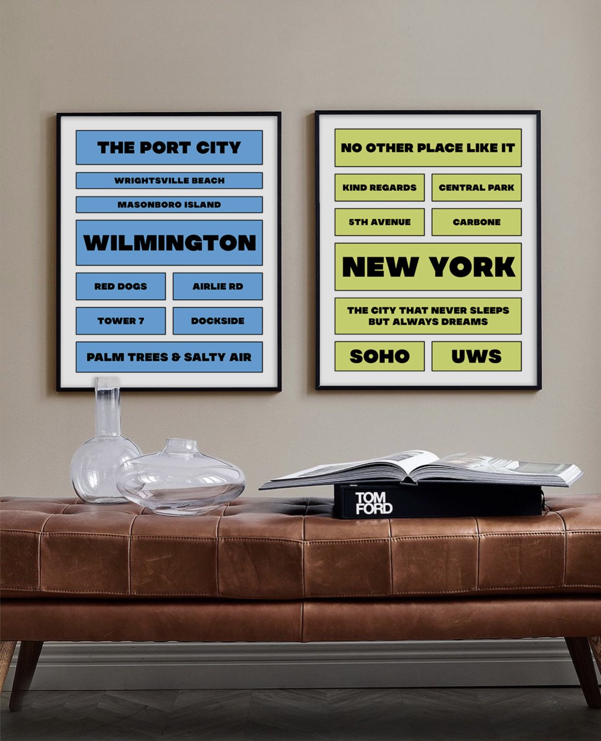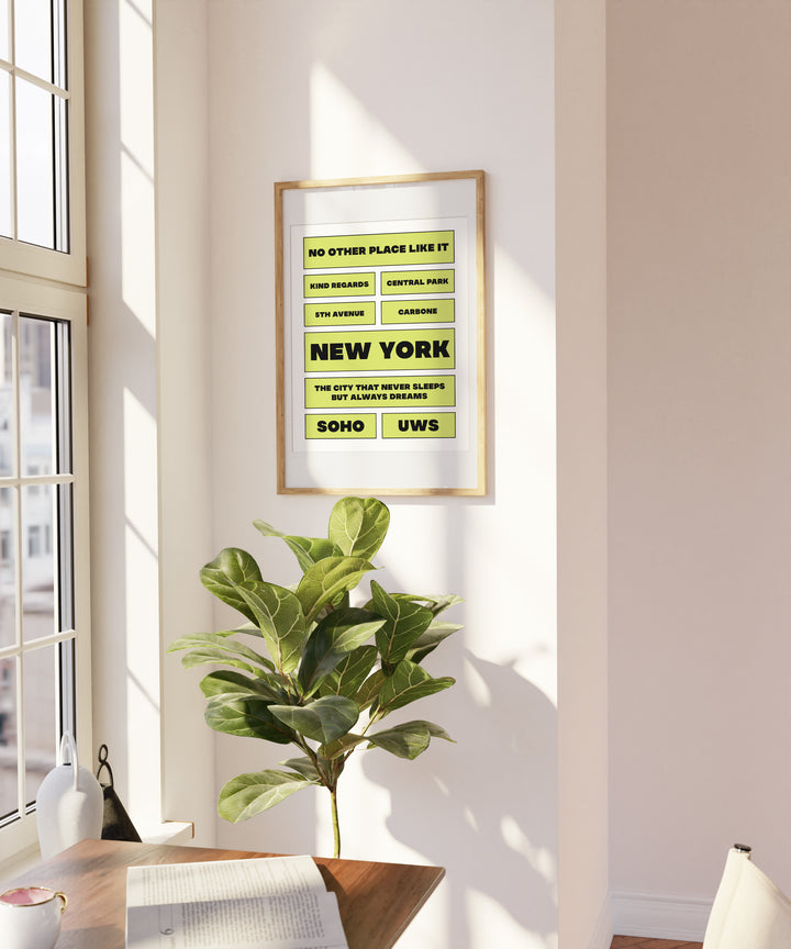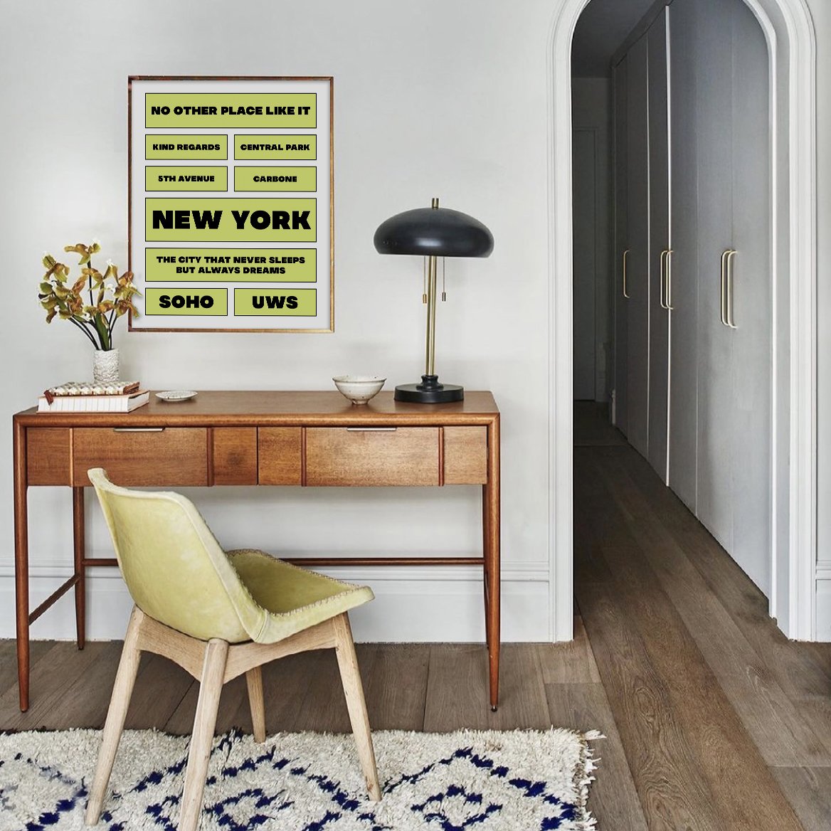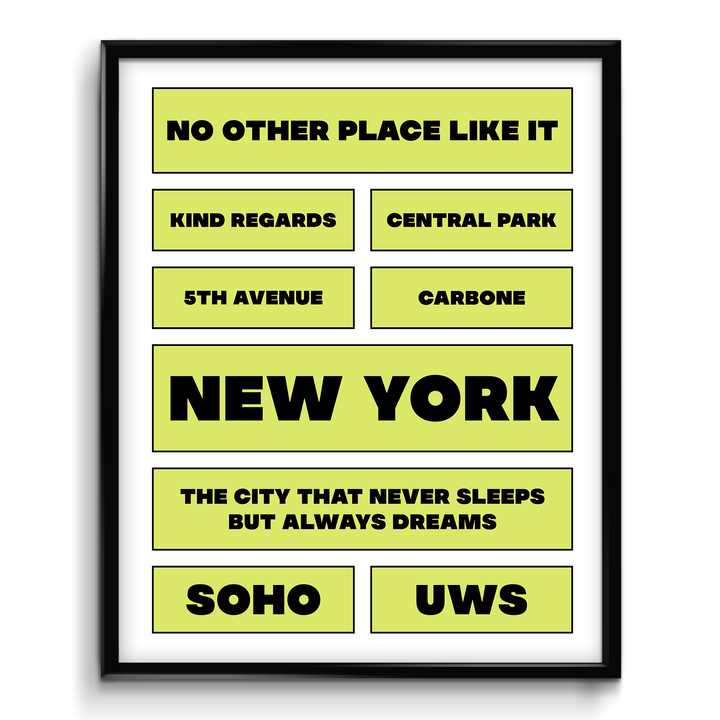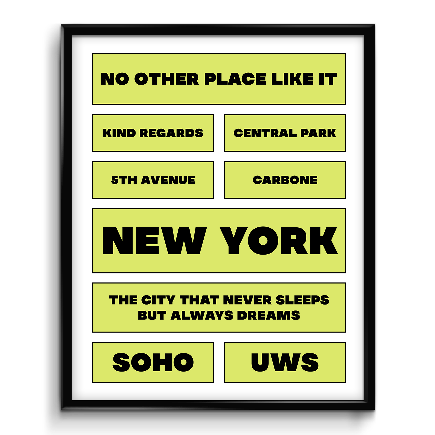 Inspired by retro concert posters, this graphic “New York City Poster” artwork pays homage to Manhattan’s most iconic and beloved spots. The lively green color is reminiscent of the buzzing energy on the streets of NYC, and the bold modern text captures the edgy urban aesthetic of city living. This print is the perfect piece for NYC lovers and urban dwellers. Highlights include: Kind Regards bar, Central Park, 5th Avenue, Carbone, neighborhoods like SoHo and the Upper West Side, as well as the iconic NYC nickname of “The city that never sleeps.”