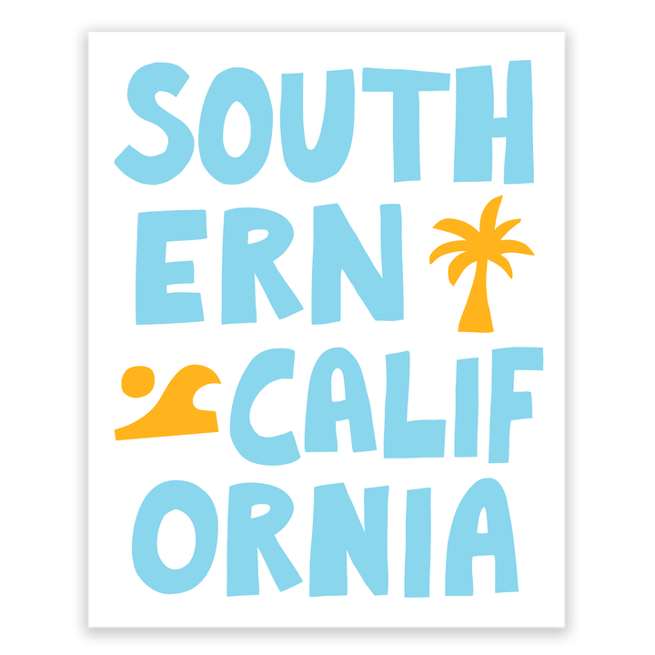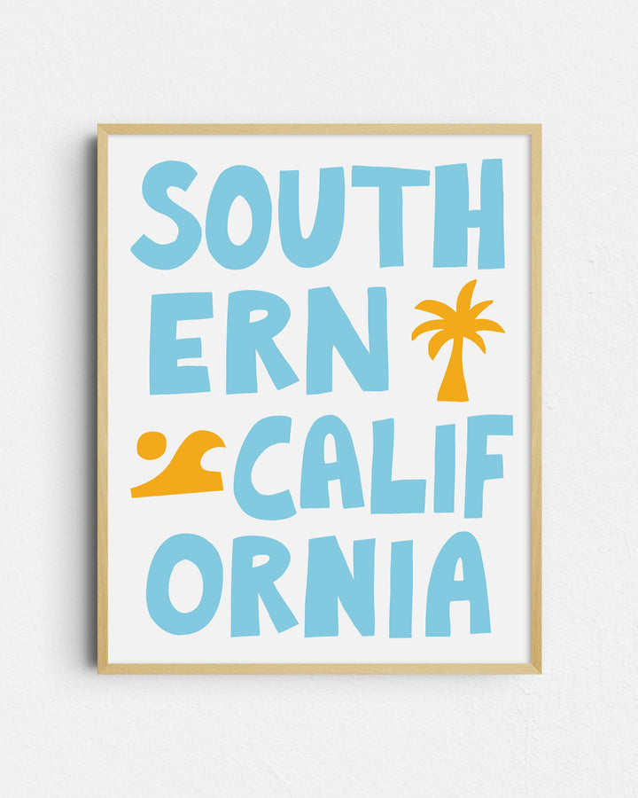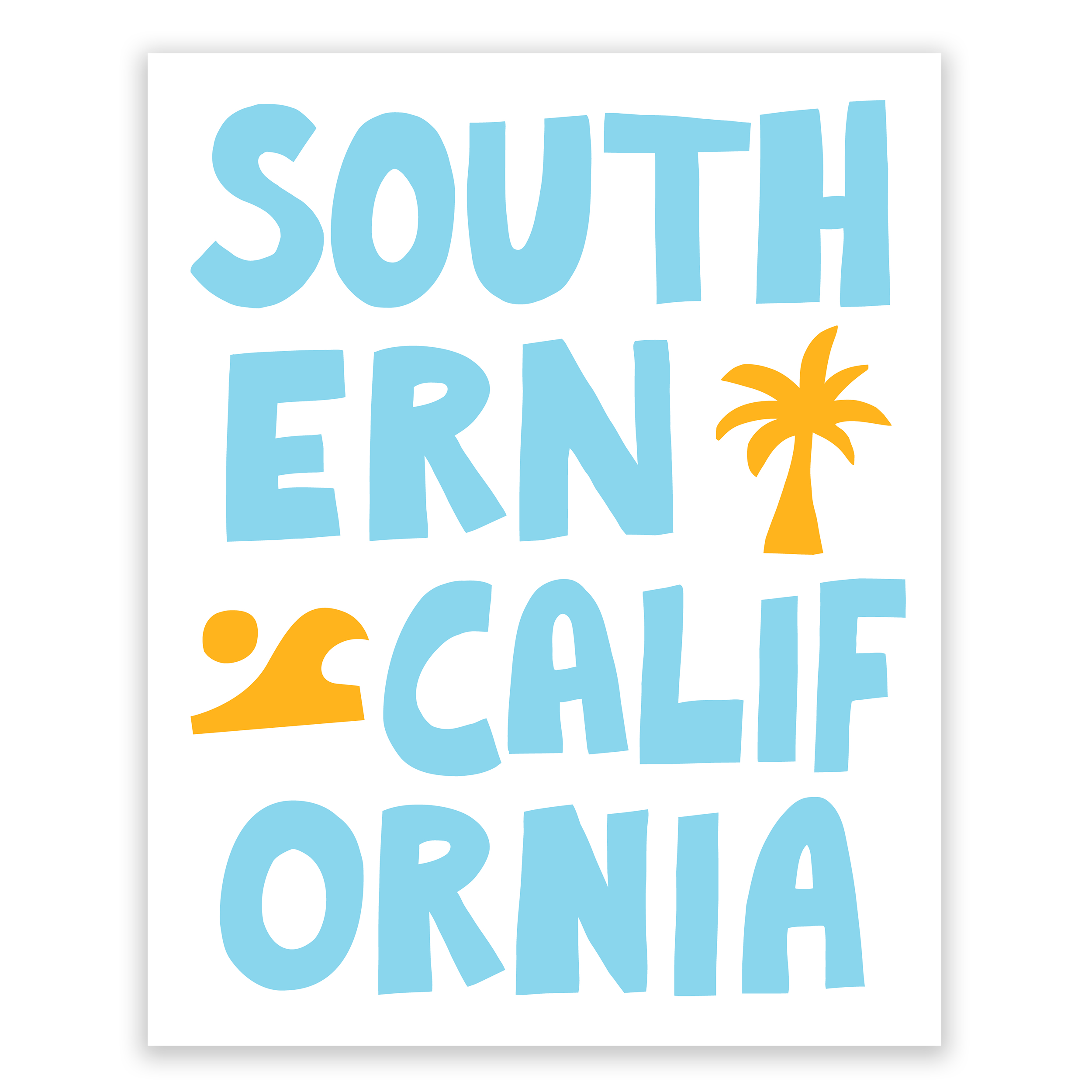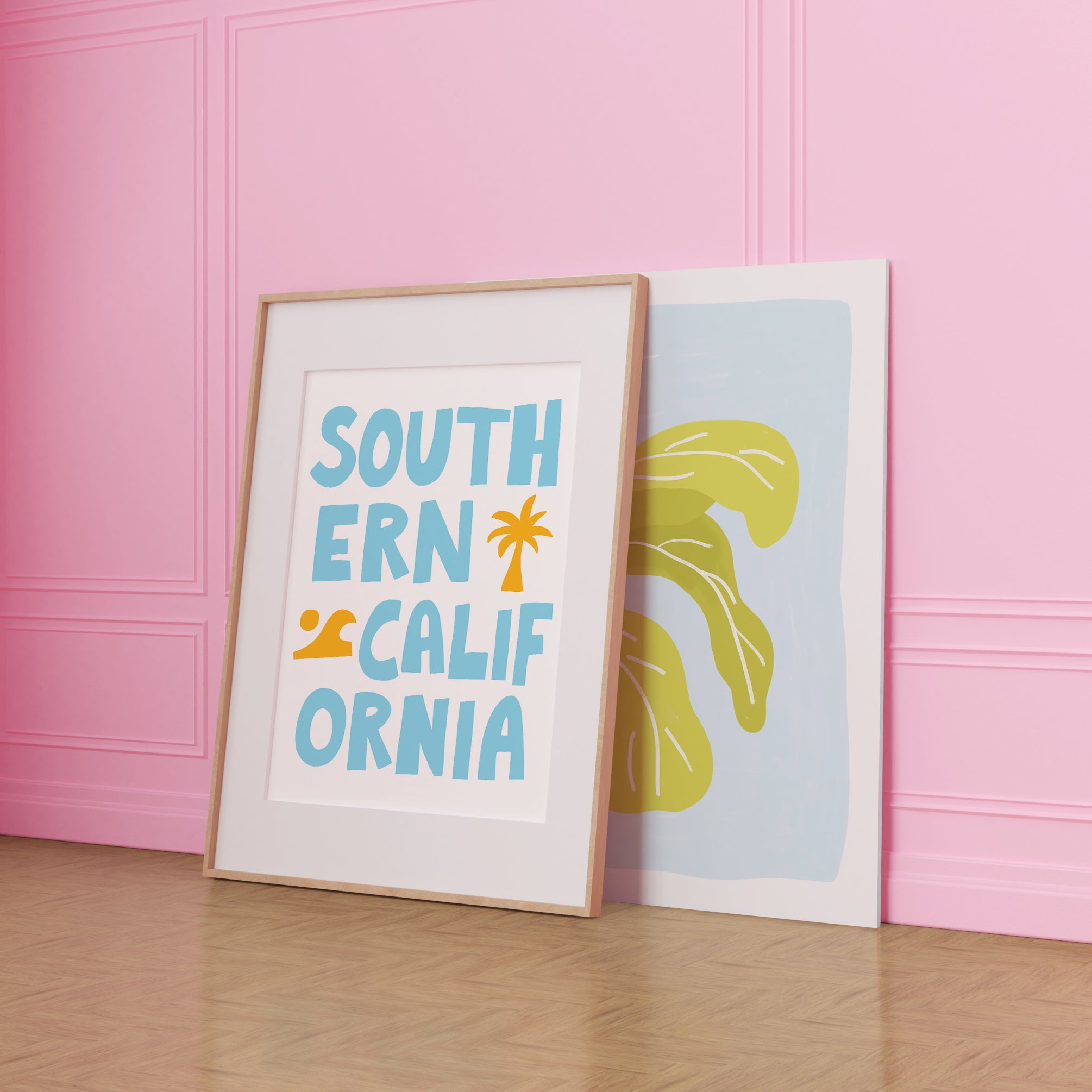 Experience the laid-back vibes of the Golden State with this 'Southern California' art print, a sunny addition to any space. Its bold, breezy typography and playful palm tree and sun graphics capture SoCal's endless summer. Perfect for California dreamers and beach lovers, this print is a vibrant homage to West Coast cool.