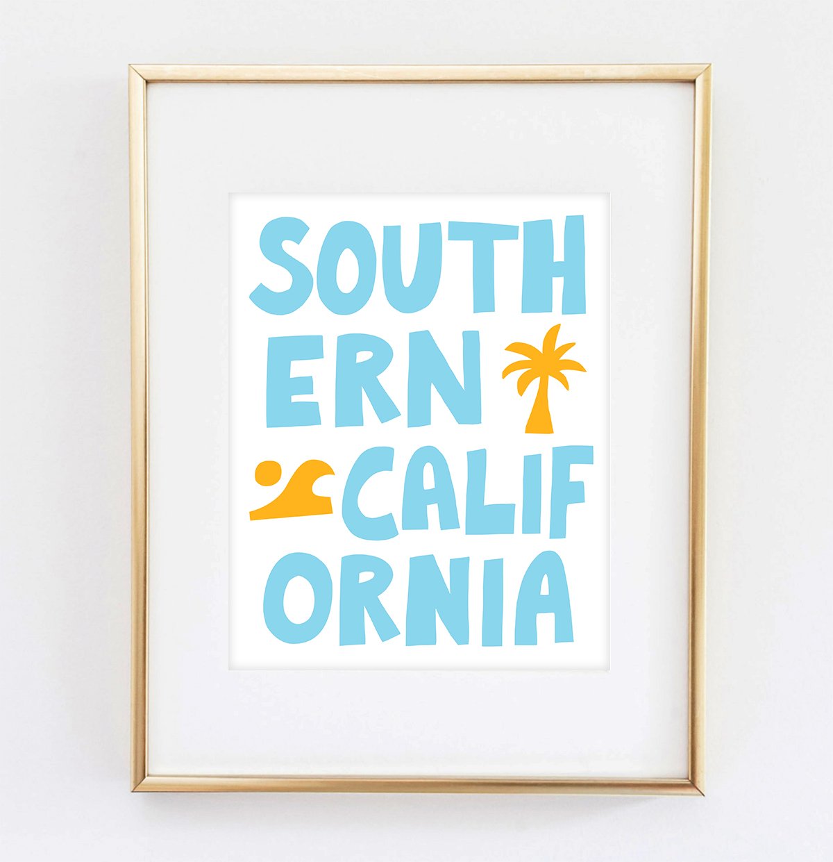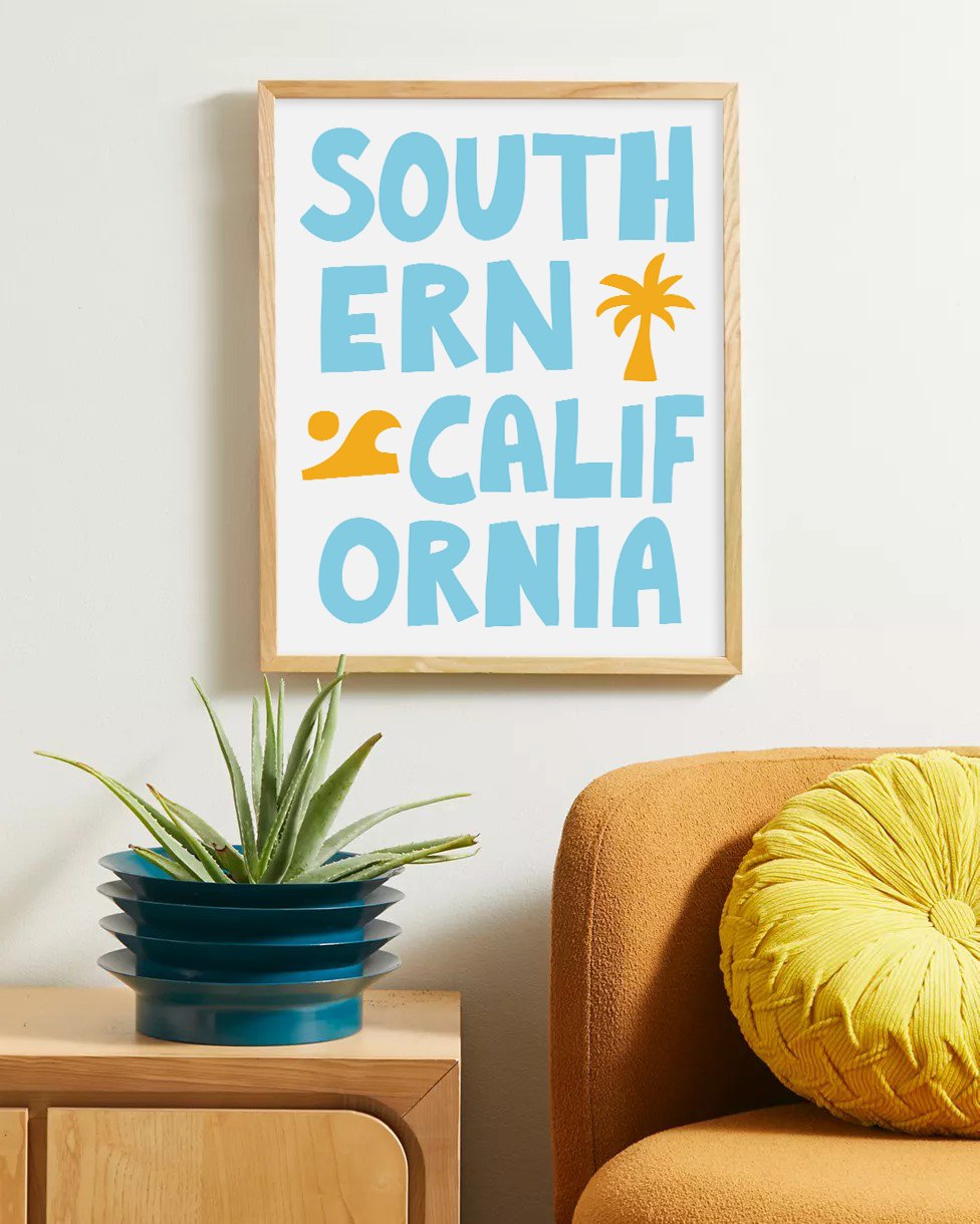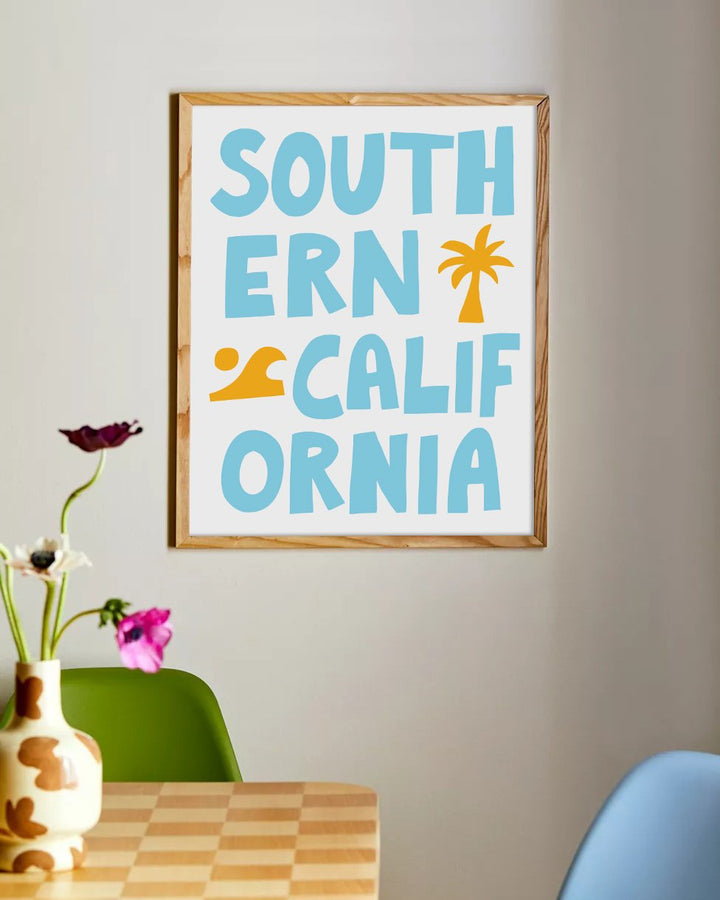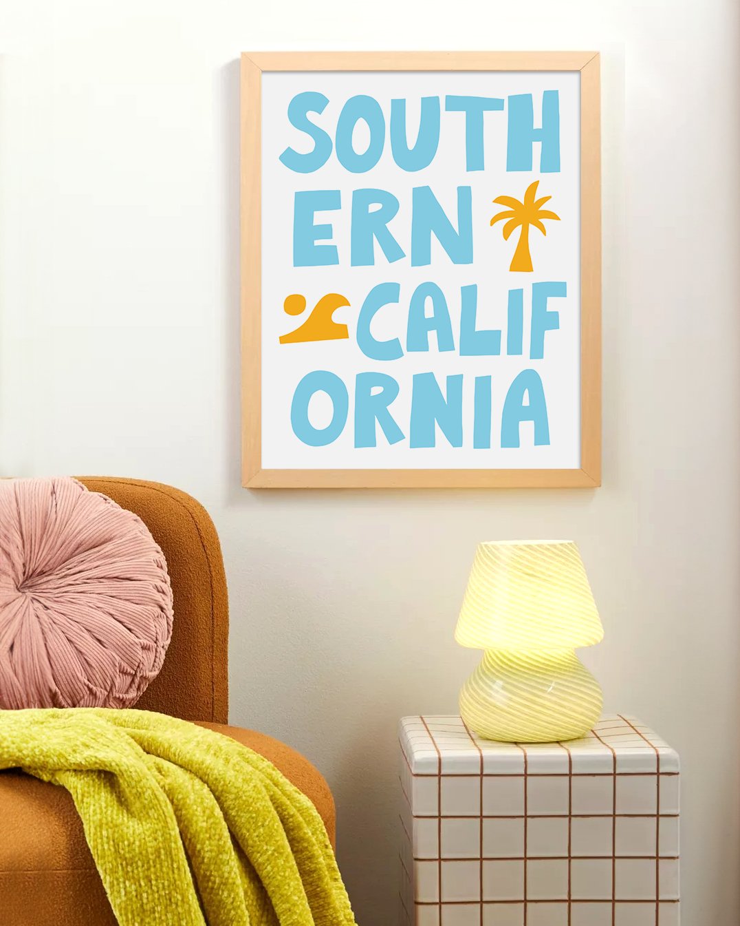 Experience the laid-back vibes of the Golden State with this 'Southern California' art print, a sunny addition to any space. Its bold, breezy typography and playful palm tree and sun graphics capture SoCal's endless summer. Perfect for California dreamers and beach lovers, this print is a vibrant homage to West Coast cool.
