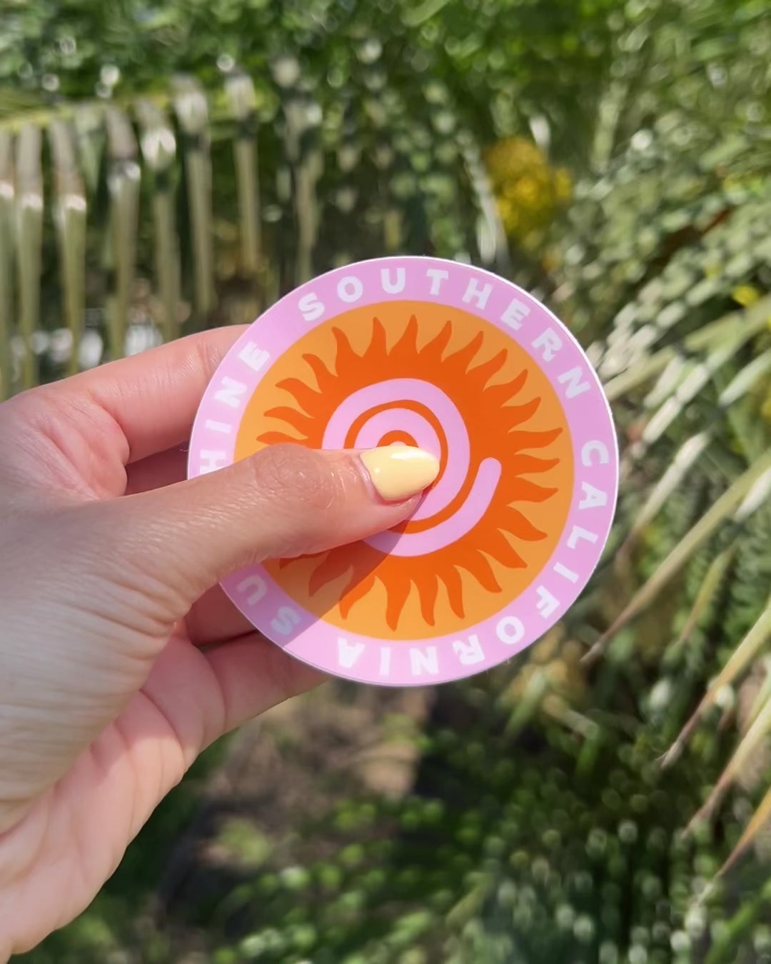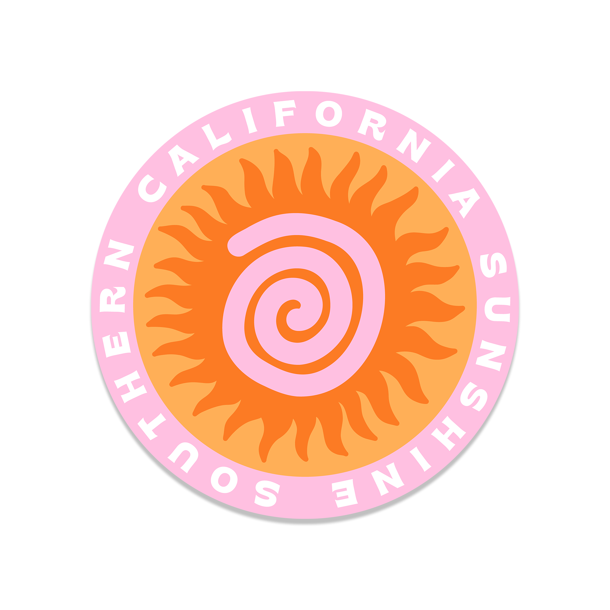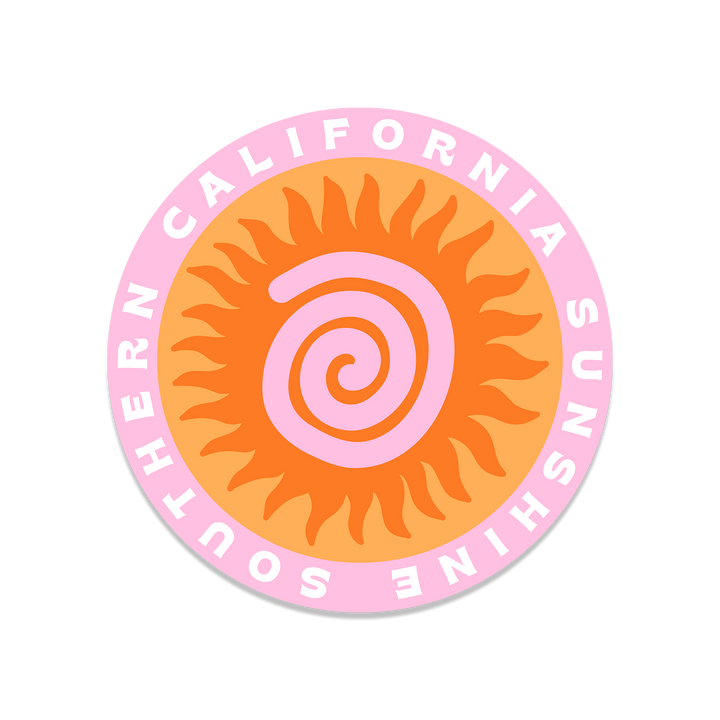 A colorful, funky, beachy sticker to celebrate the year-round Southern California sunshine. A bright pink and orange design with a whimsical sun illustration, a swirly icon in the middle, and text around the edge of the circle.