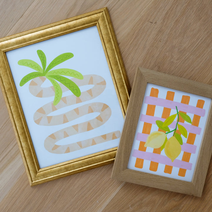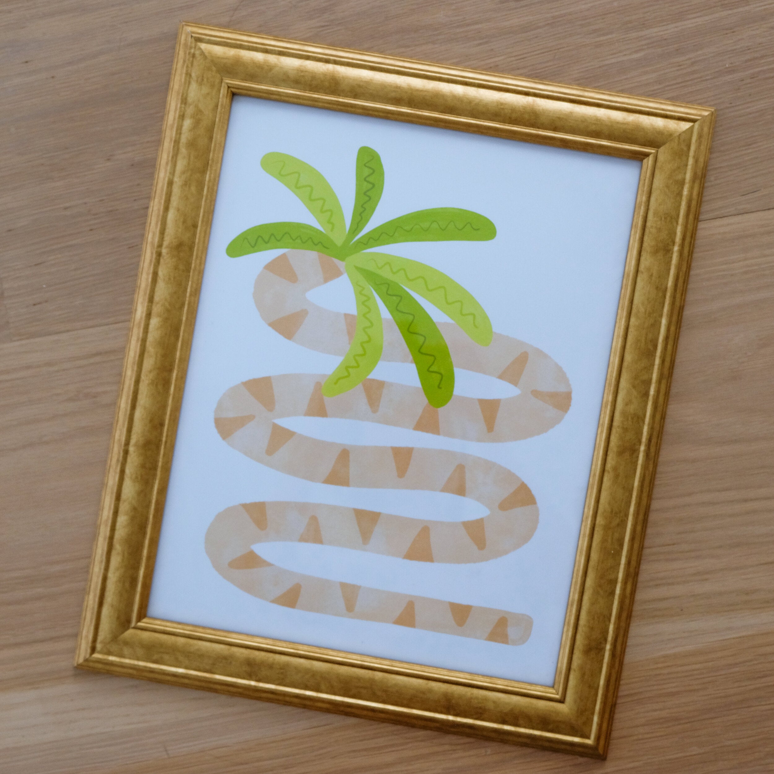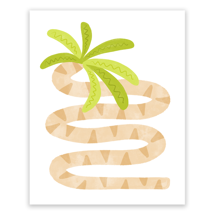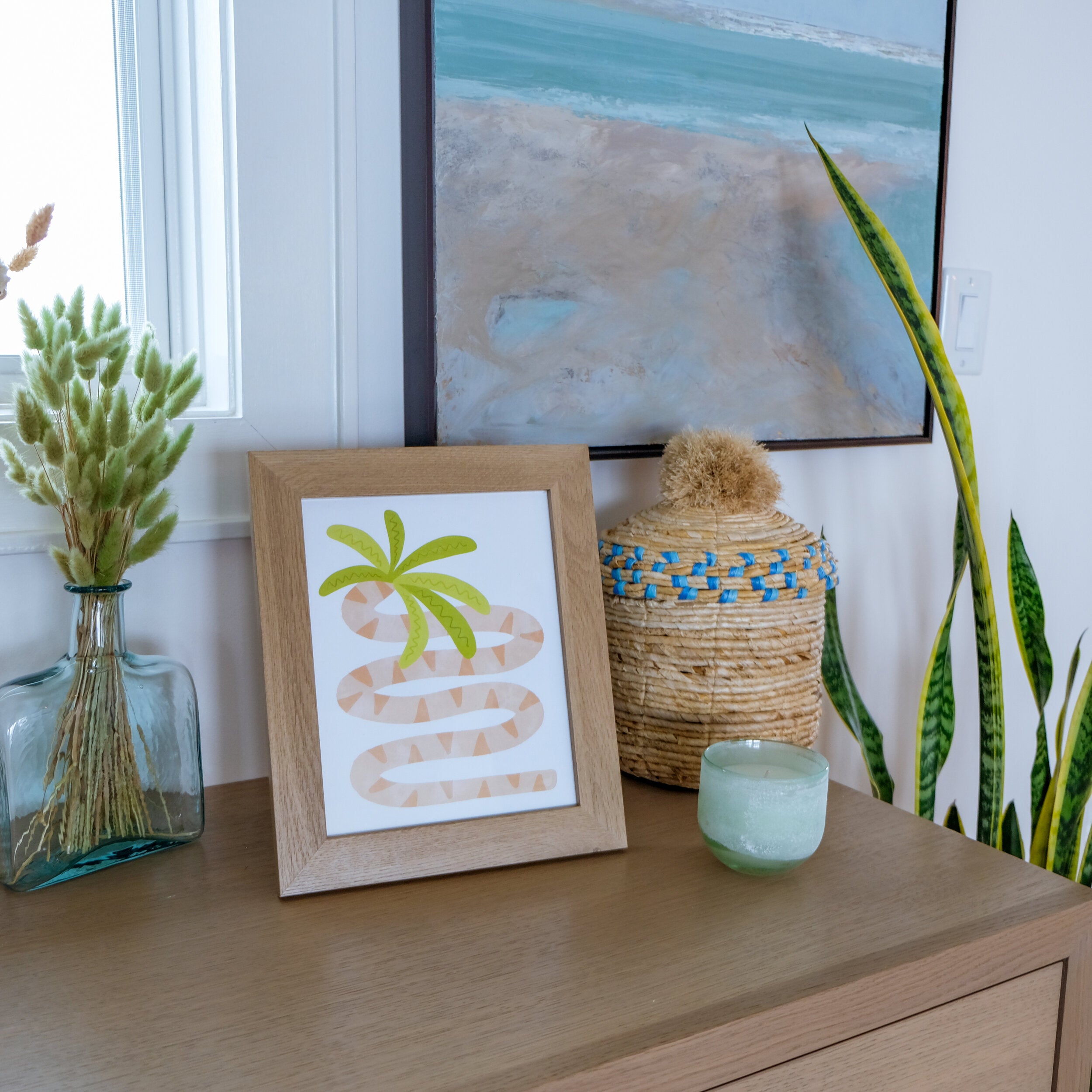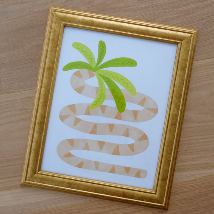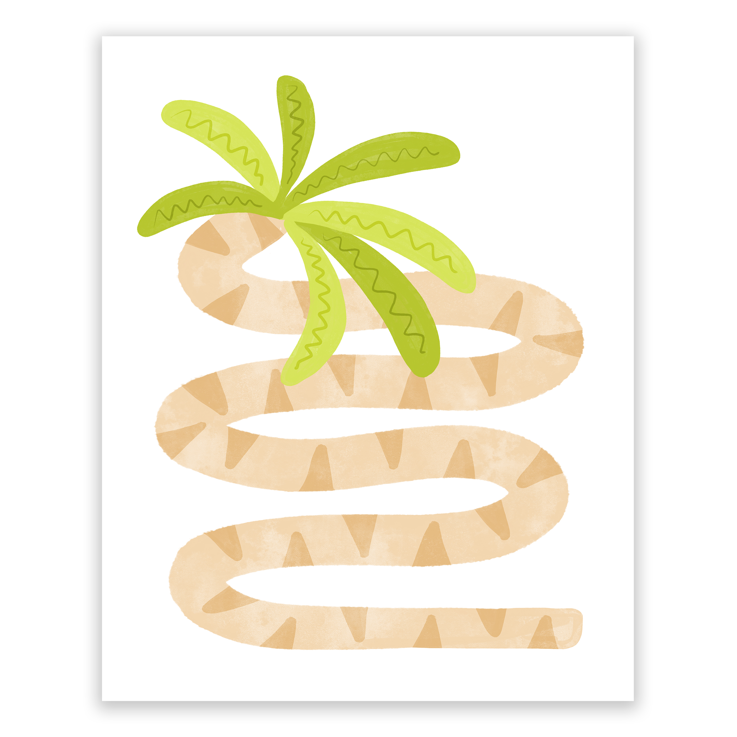 This botanical art print offers a funky, wavy reinterpretation of the classic palm tree, blending whimsical lines with a splash of bright green. Its abstract design infuses a modern twist into any space, making it ideal for minimalist or eclectic interiors. Crafted with quality, it stands as a unique and stylish focal point for any wall.