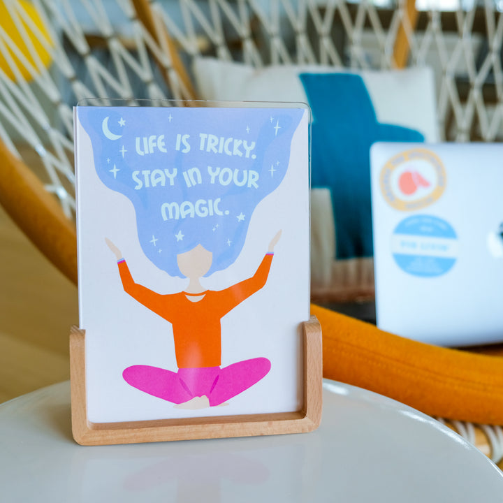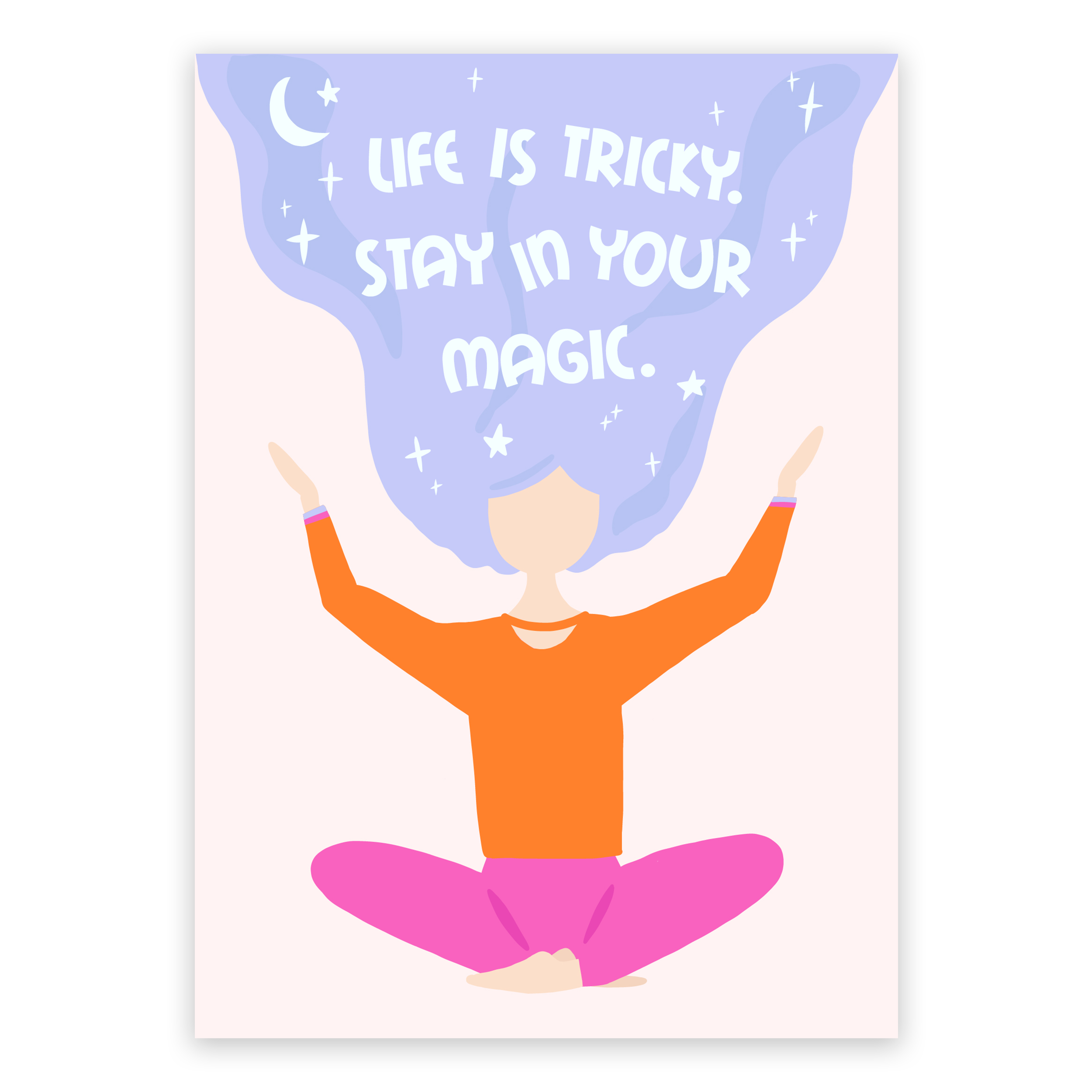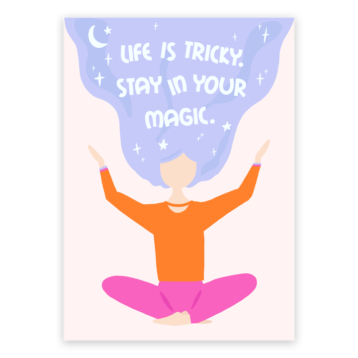 This mini 5x7 art print is a tranquil tribute to finding peace amidst the daily grind. Featuring a woman meditating with her hair flowing into a galaxy of motivational words, "Life is tricky. Stay in your magic." It's a daily dose of inspiration for your home office, desk, or wherever you've set up shop for the day. Part of the "Work From Home" collection with Mandy Ansari, a lifestyle influencer and mental health advocate. This piece is designed to keep you centered and remind you of your unique magic, even through the busiest workdays.
