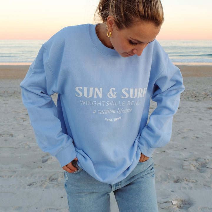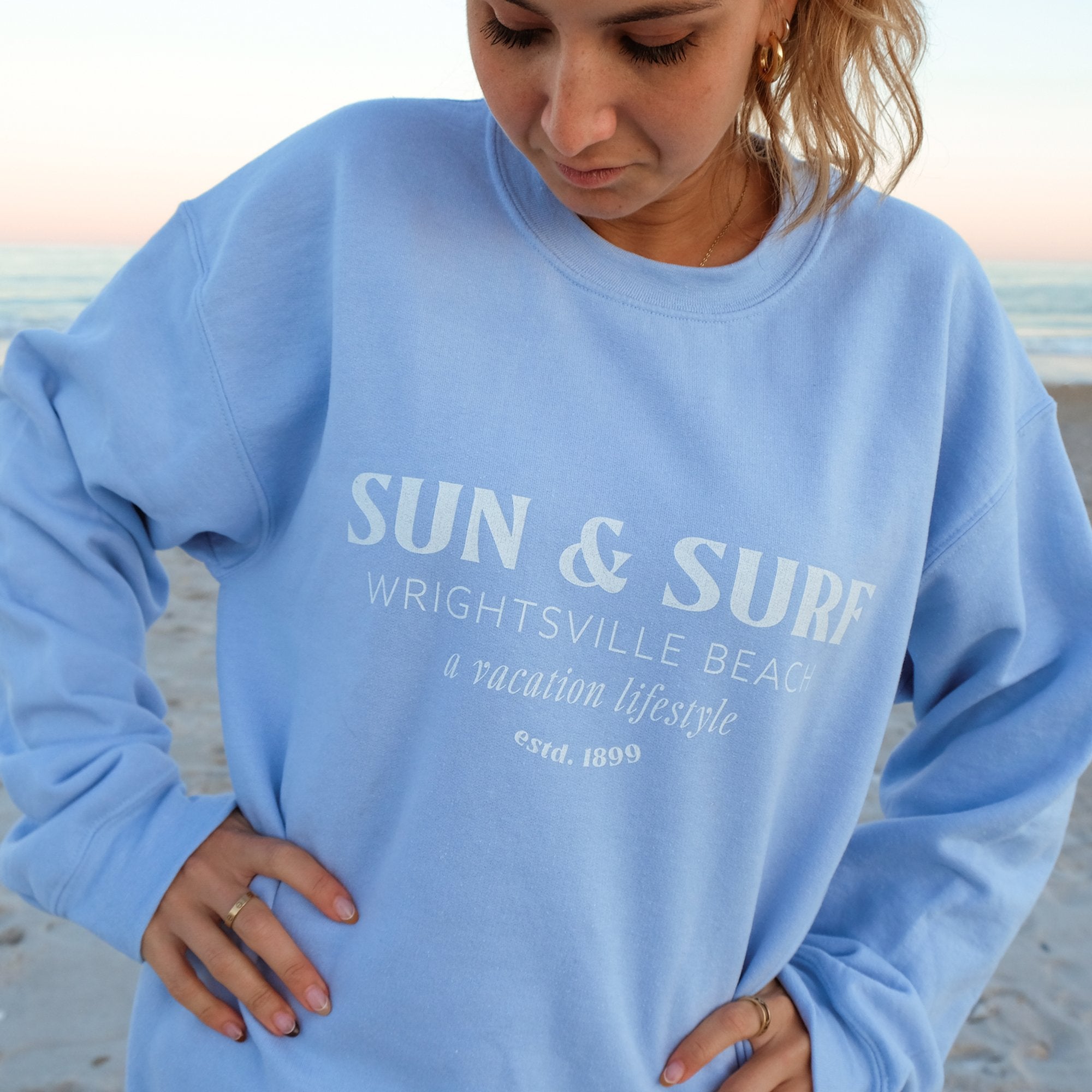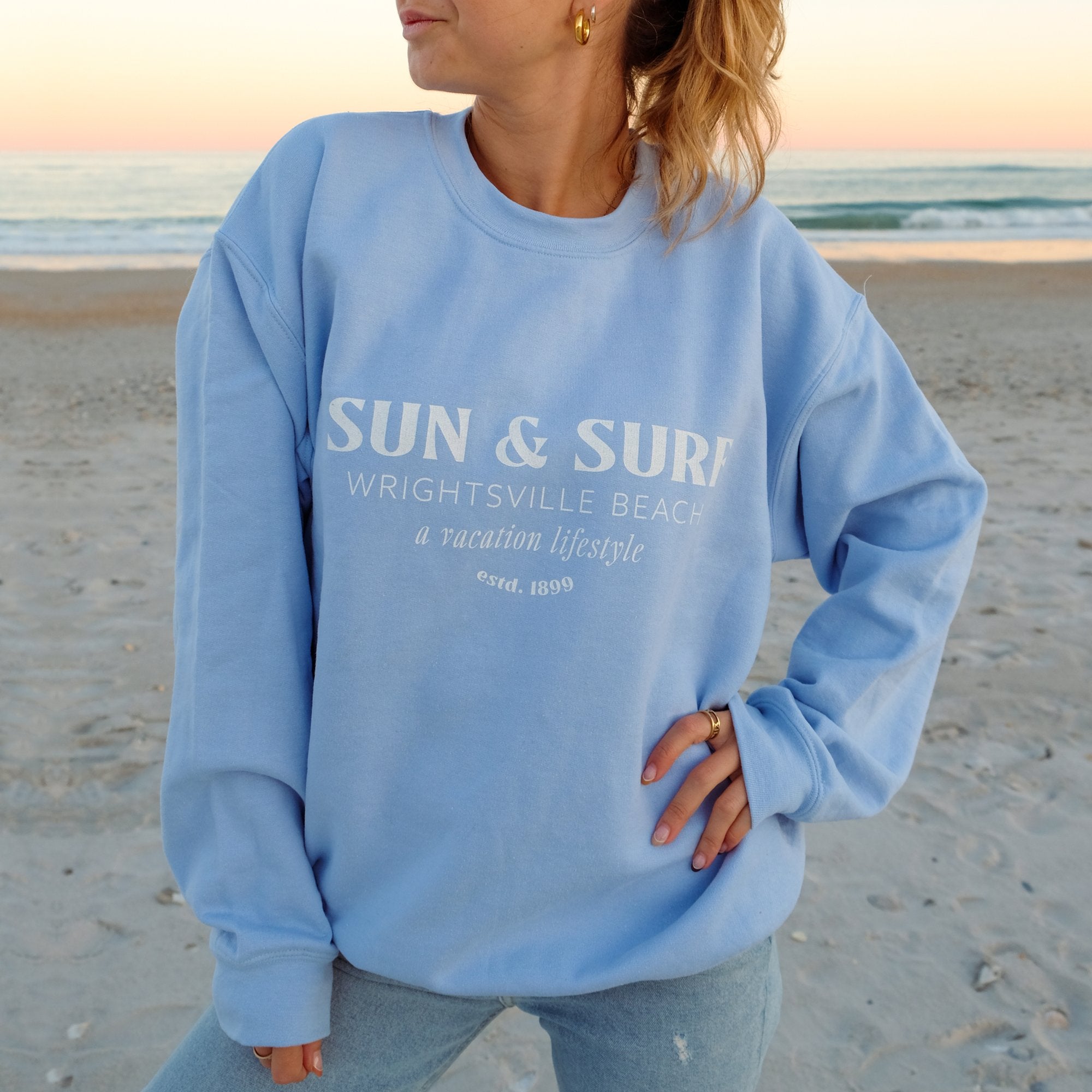 Embrace the endless summer vibes with this "Sun & Surf Wrightsville Beach" crewneck sweatshirt. Designed by a Wrightsville Beach native, this cozy sweatshirt will be your go-to for channeling that relaxed, vacation lifestyle, no matter where you are. With its soft fabric and retro-inspired design, it's perfect for chilly evenings after a day in the waves or just dreaming about your next beach escape.