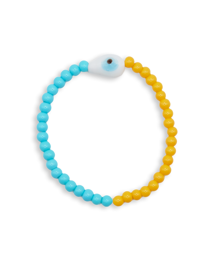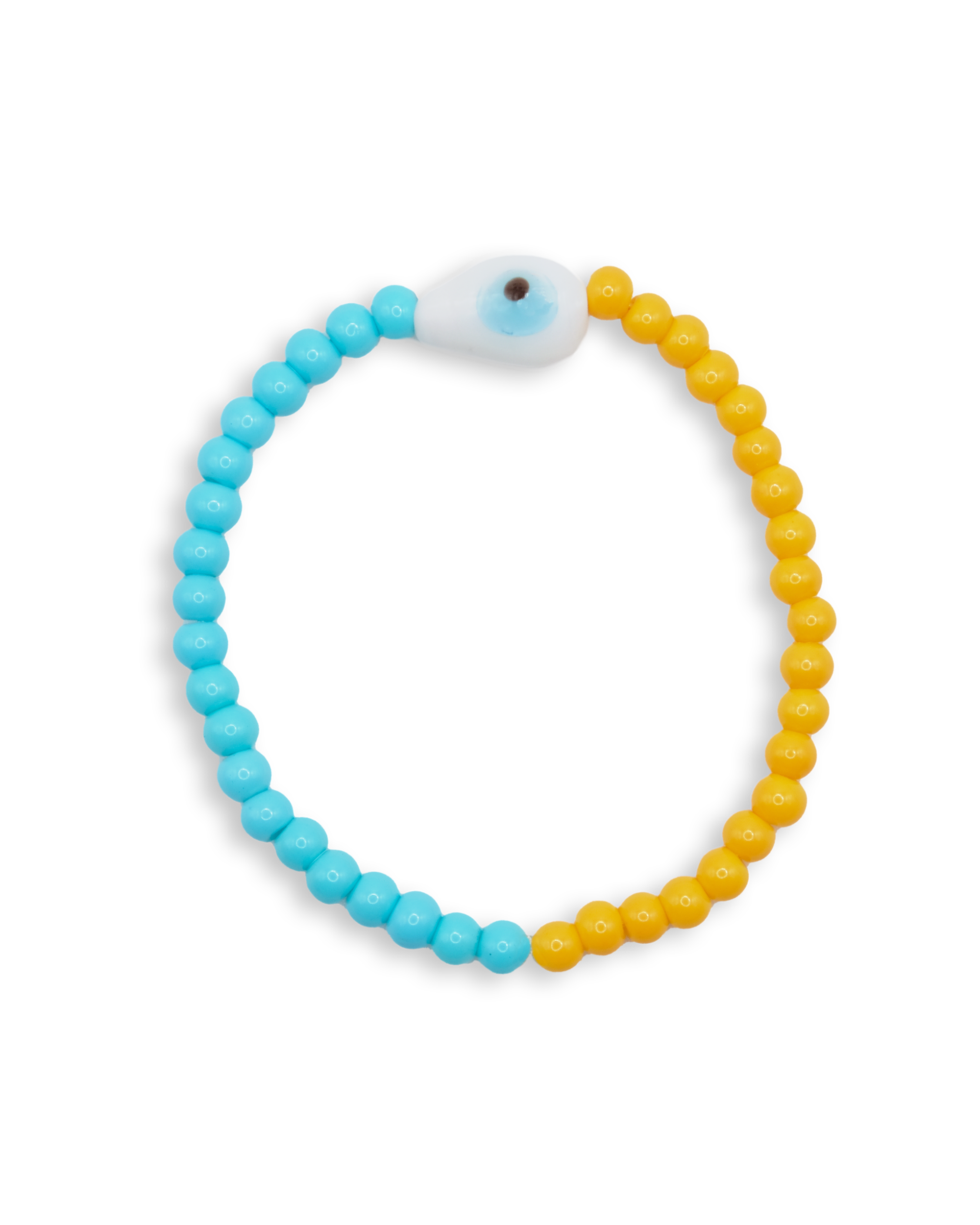 Elevate your stack anddd keep the bad vibes away with this cheerful bracelet. Featuring vibrant blue and yellow glass beads with a ceramic evil eye detail, this bracelet brings a pop of sunshine to your wrist. Offered in two sizes so those with smaller wrists can enjoy as well!