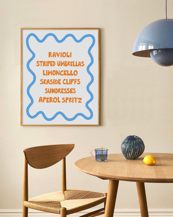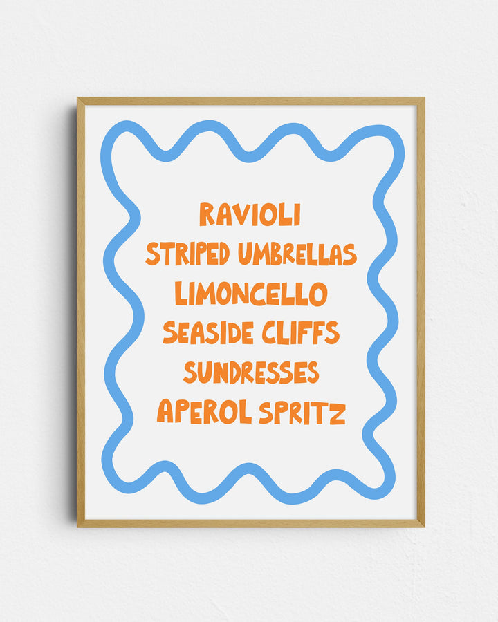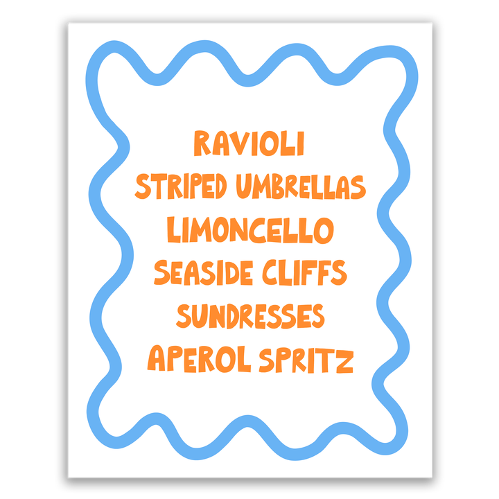 Experience the charm of Italy with this playful art print that captures the vibrant essence of this dreamy travel destination. Through the different senses, it’s designed to mentally transport you to the picturesque Amalfi Coast, where Aperol Spritz’ flow like water and pasta is an acceptable meal for breakfast, lunch, and dinner. This artwork features bold hand-written typography and a whimsical squiggle border that frame the spirit of Italian summers. Hang it in your kitchen or living room and it’ll have you singing “That’s Amore!”