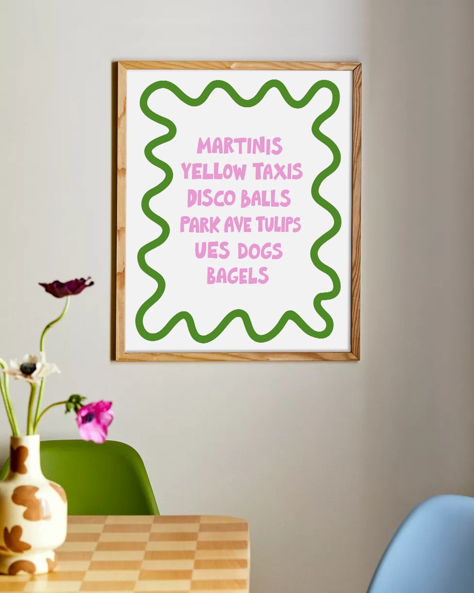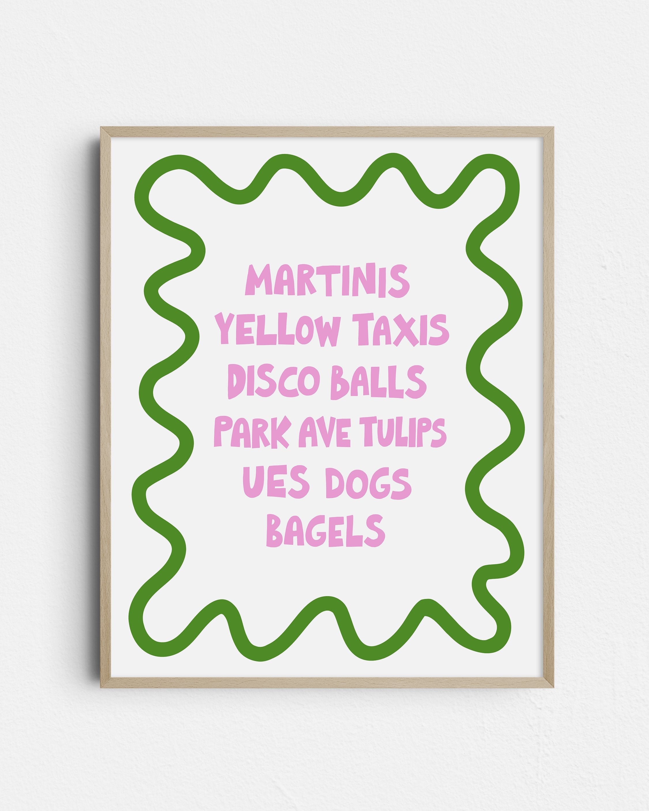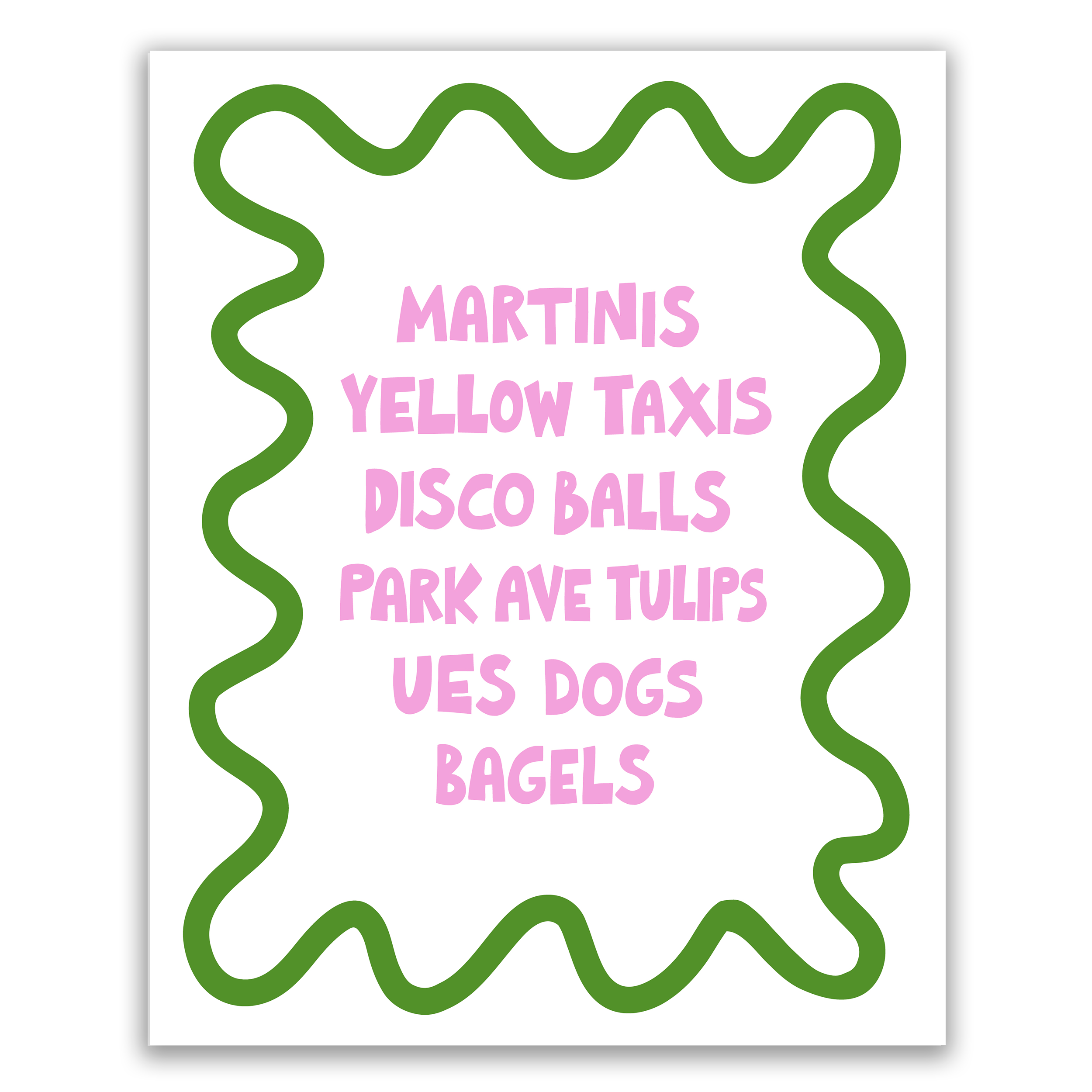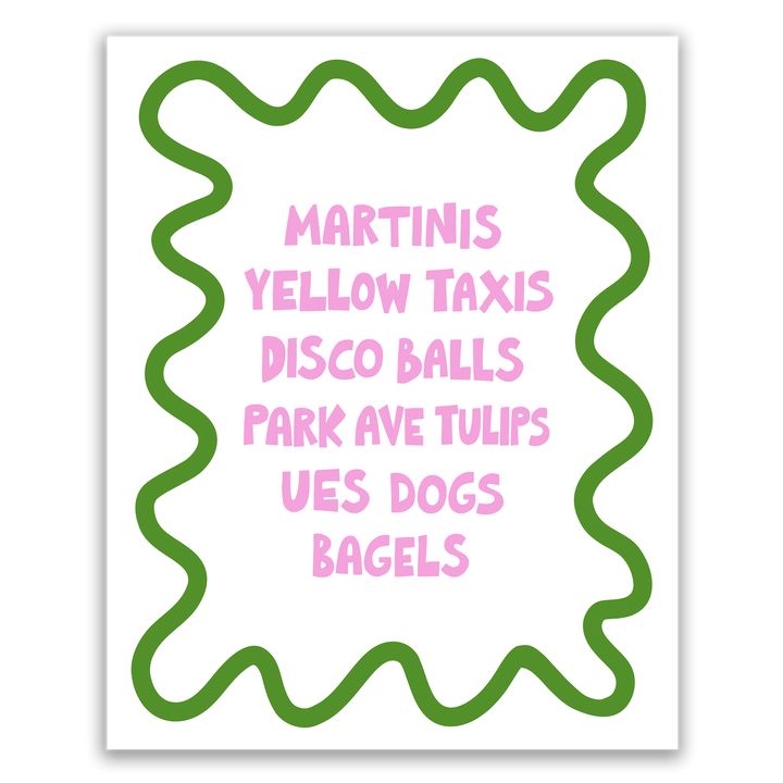 Channel the vibrant energy of New York City with this colorful and playful art print! It captures the essence of the city that never sleeps with style and whimsical flair. From the classic martini to the rush of yellow taxis, each item is a tribute to the Big Apple. Perfect for NYC enthusiasts and city lovers, this art print adds a burst of color and metropolitan charm to any urban dweller’s home.