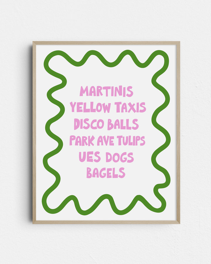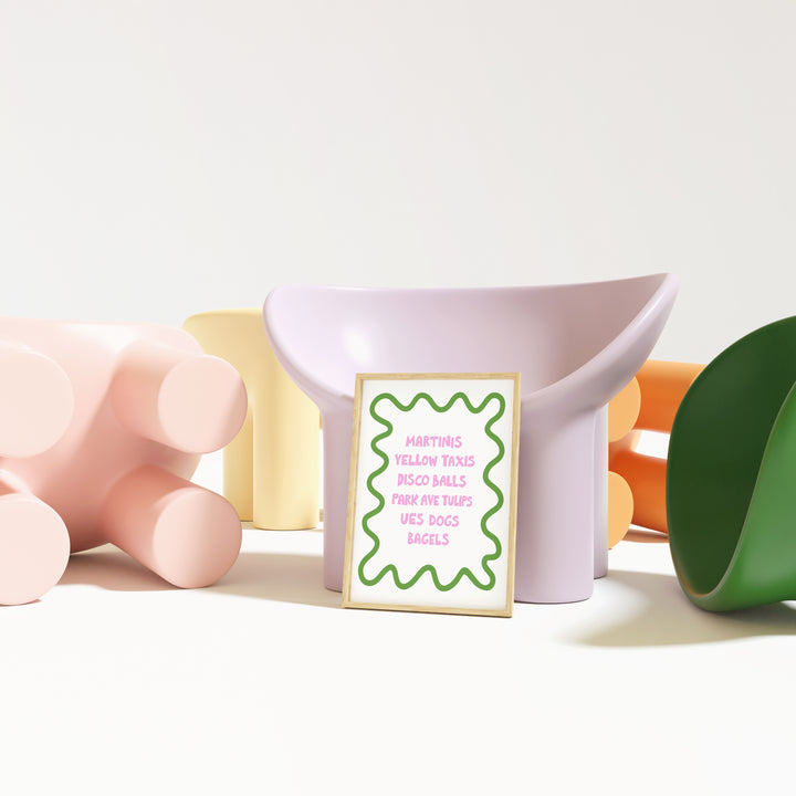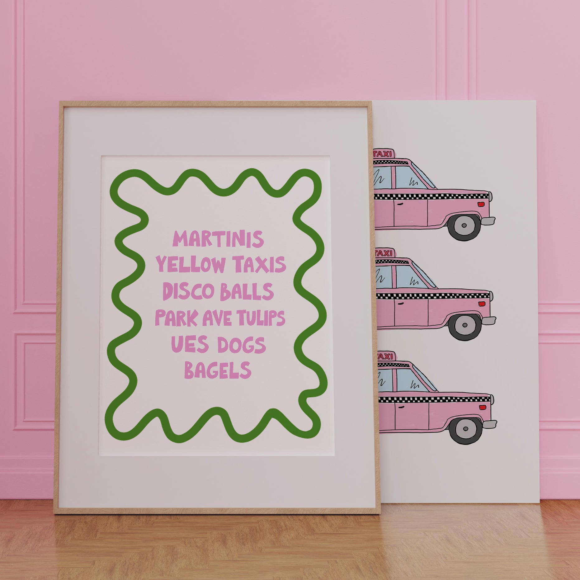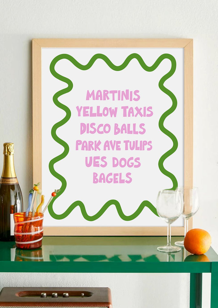 Channel the vibrant energy of New York City with this colorful and playful art print! It captures the essence of the city that never sleeps with style and whimsical flair. From the classic martini to the rush of yellow taxis, each item is a tribute to the Big Apple. Perfect for NYC enthusiasts and city lovers, this art print adds a burst of color and metropolitan charm to any urban dweller’s home.
