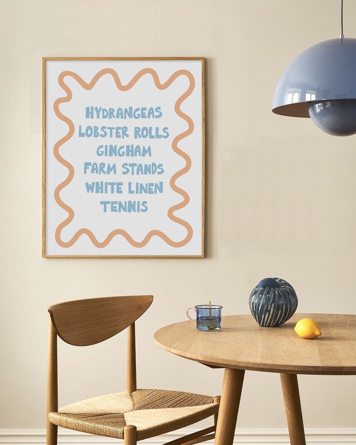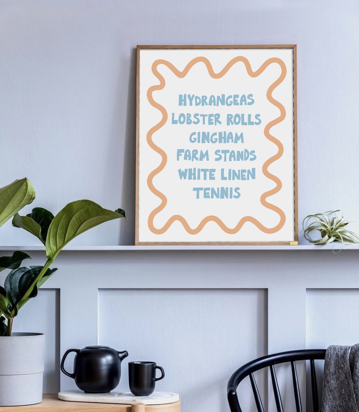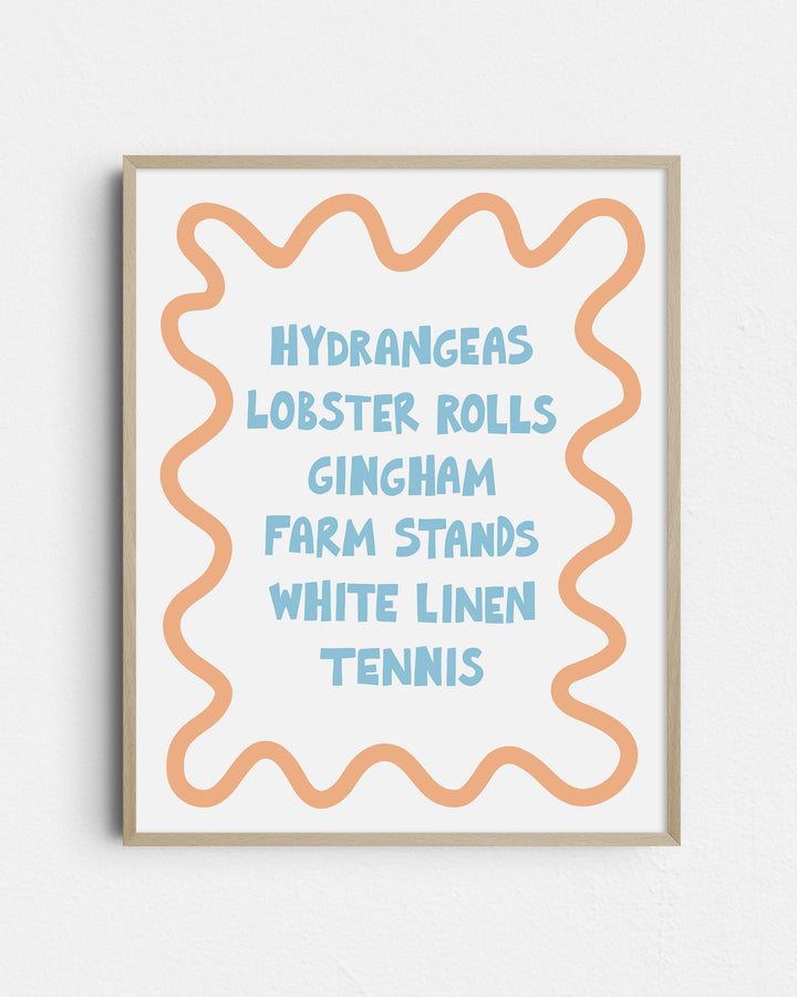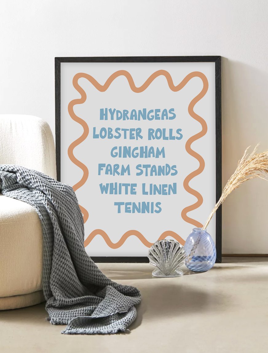 Capture the chic elegance of the Hamptons with this stylish and bold typography art print. Perfect for adding a touch of coastal sophistication and fun to any room, this wall art is a must-have for those who love to summer in the Hamptons. Elevate any space with this on-trend piece, that highlights the quiet luxury of summer tennis and farm stand freshness.
