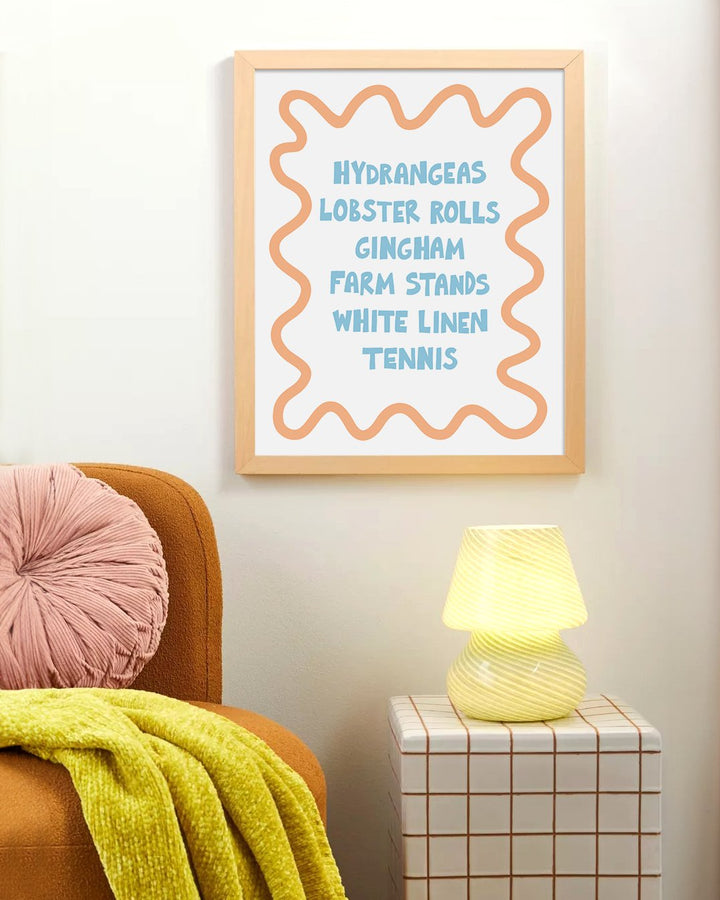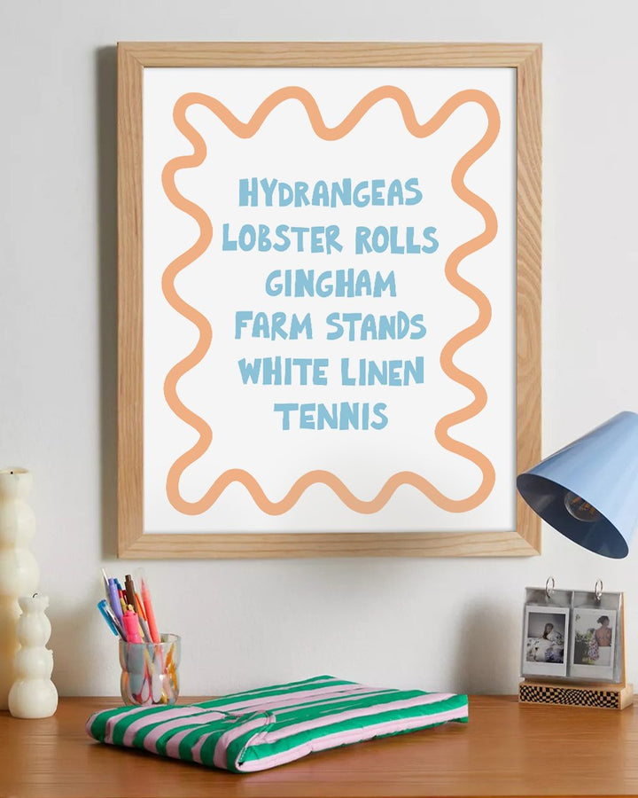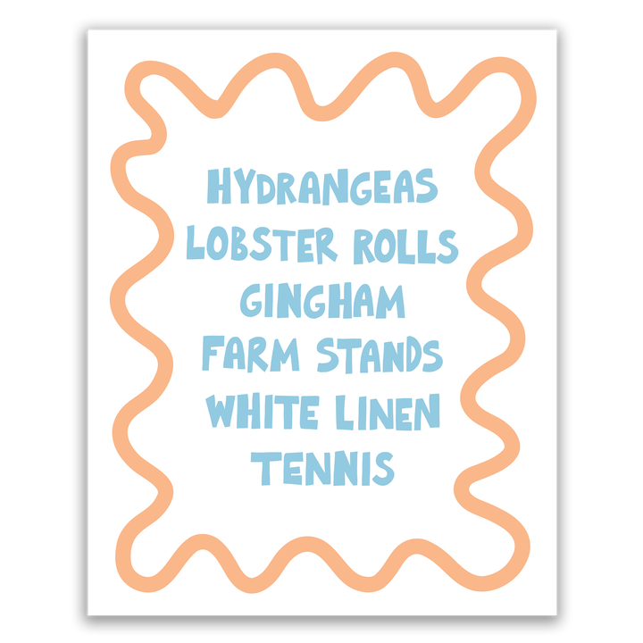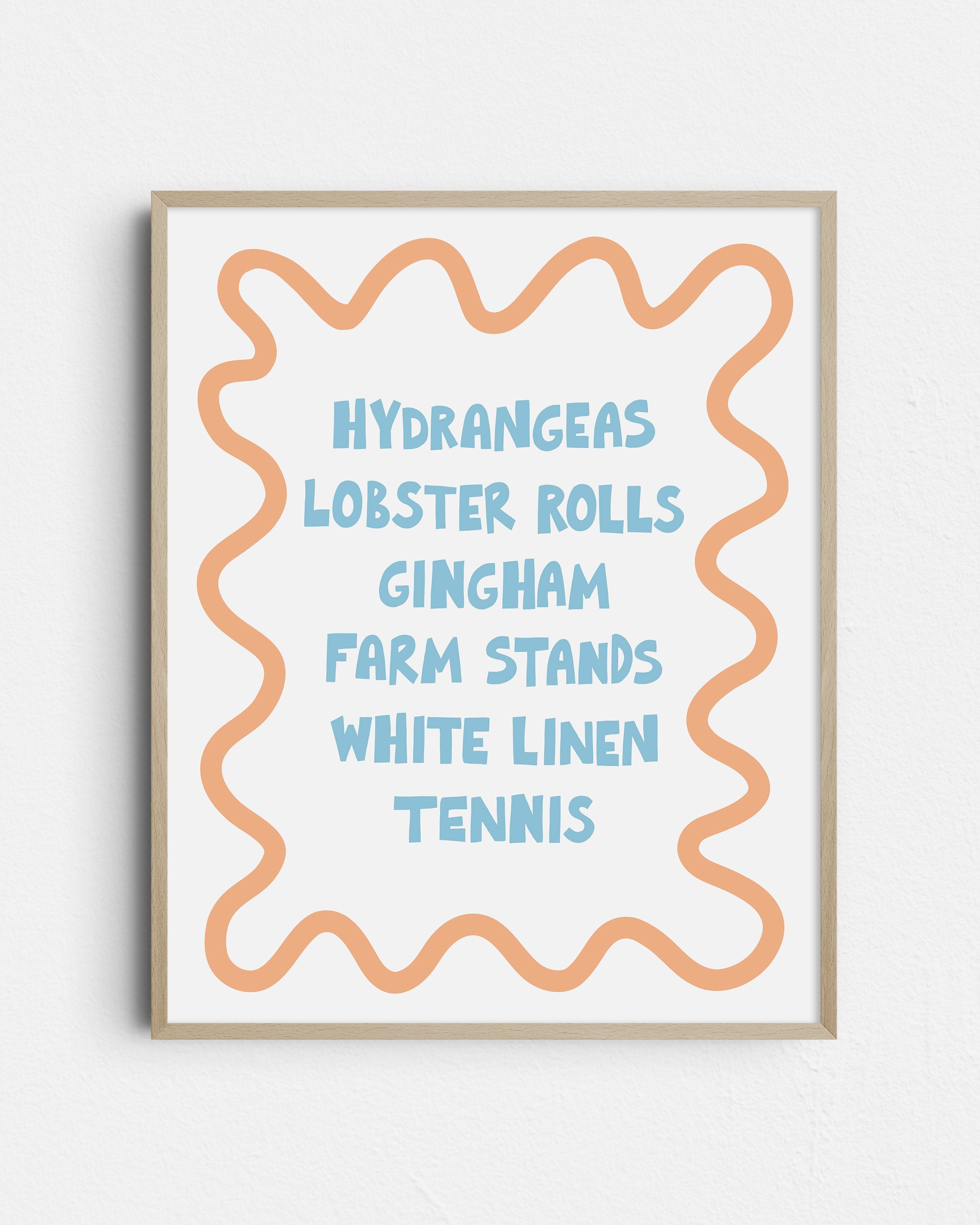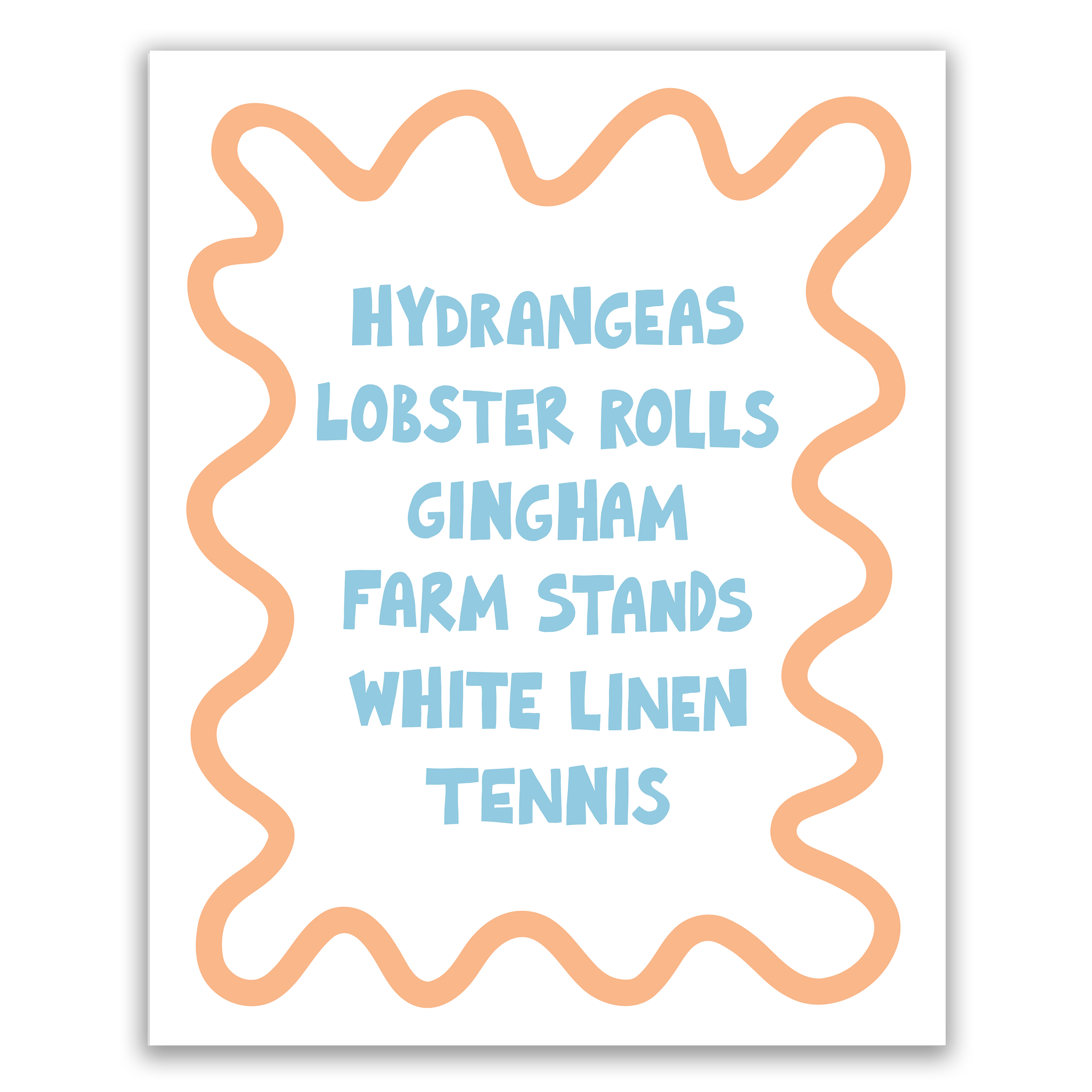 Capture the chic elegance of the Hamptons with this stylish and bold typography art print. Perfect for adding a touch of coastal sophistication and fun to any room, this wall art is a must-have for those who love to summer in the Hamptons. Elevate any space with this on-trend piece, that highlights the quiet luxury of summer tennis and farm stand freshness.