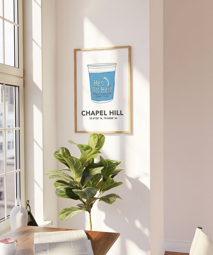 One of the most iconic tokens of Chapel Hill is easily the Blue Cup from UNC’s famous bar, He’s Not Here. This print features a whimsical take on the cup and the coordinates of Chapel Hill, NC. It is perfect for any Carolina fan looking to cheer on or commemorate their time as a Tar Heel!