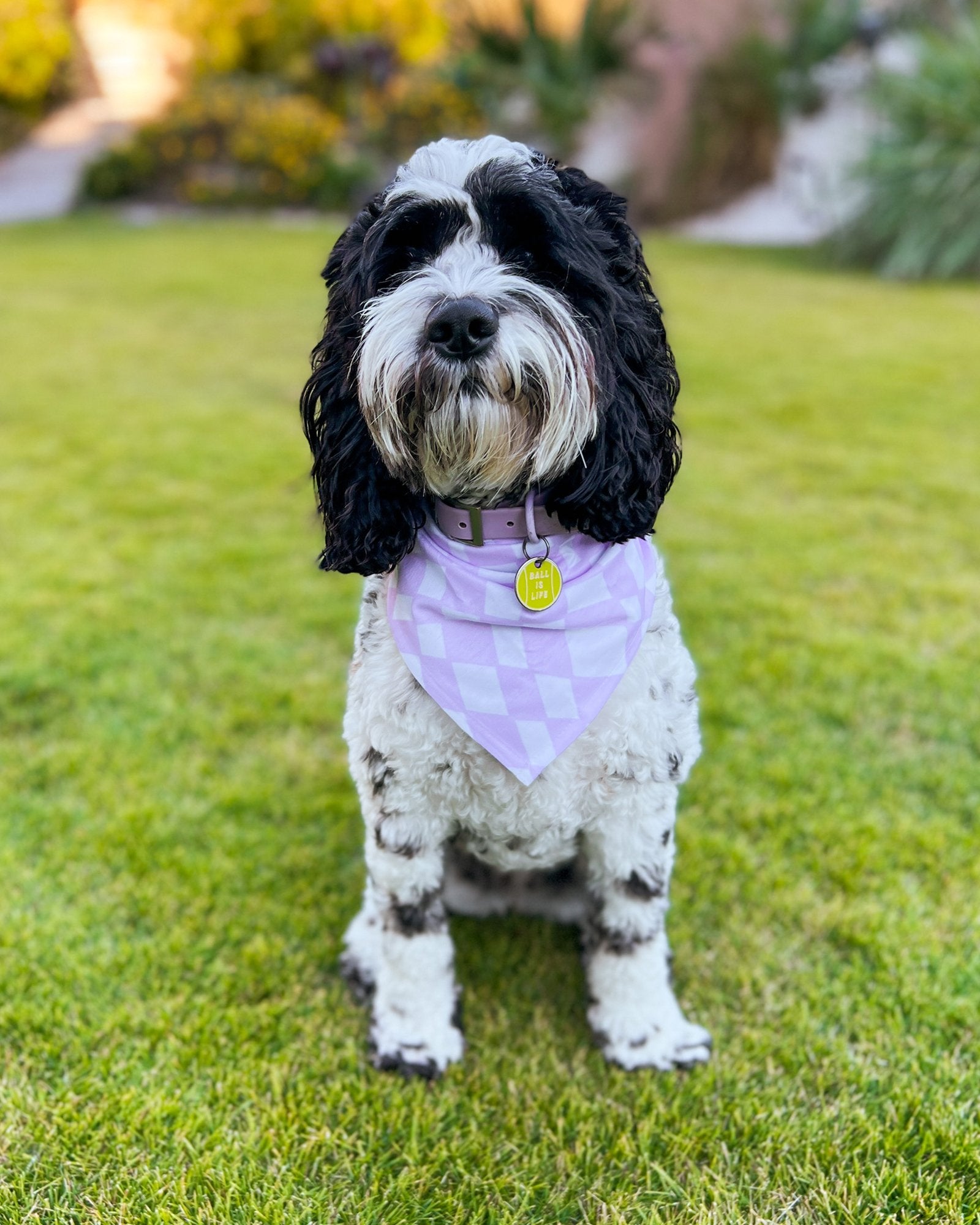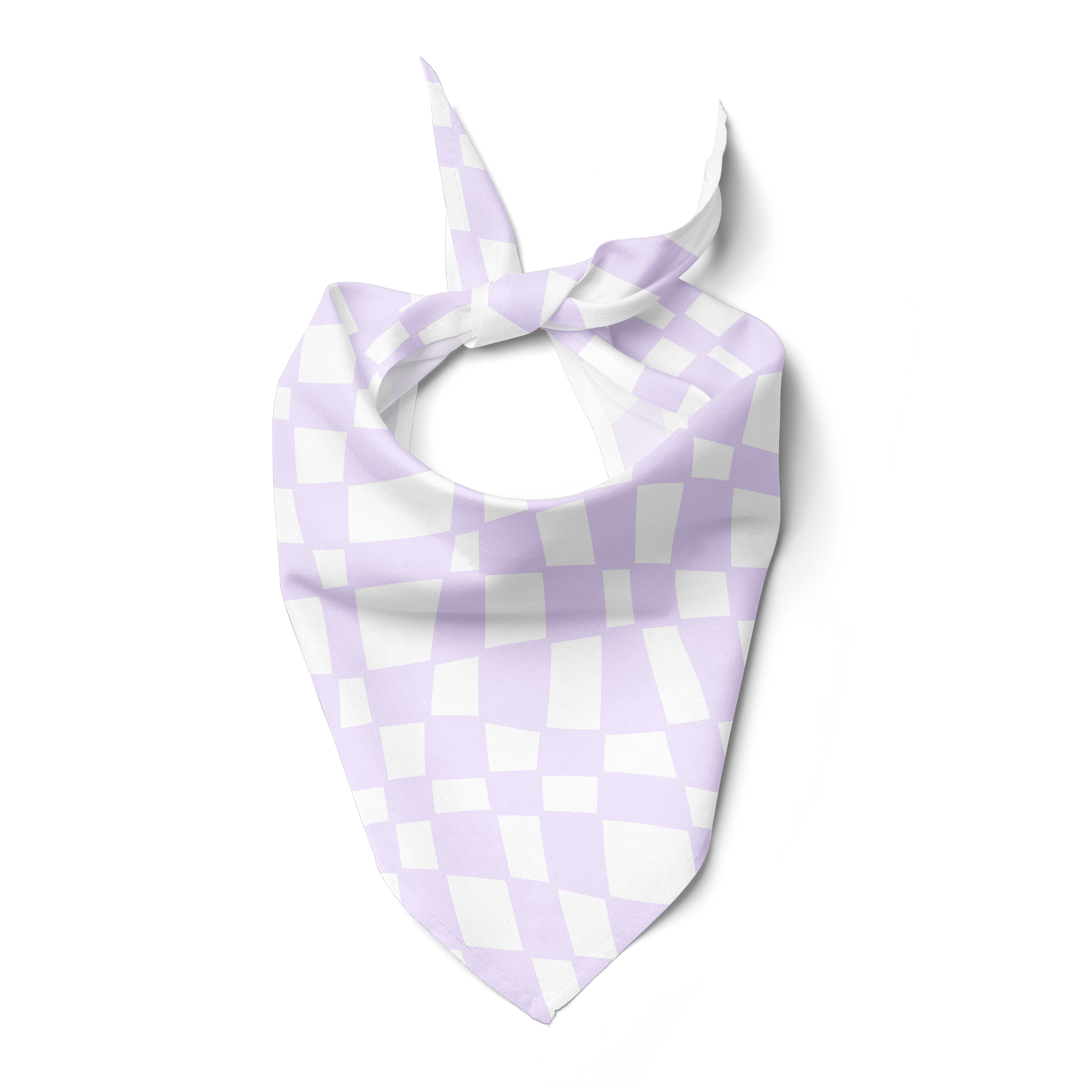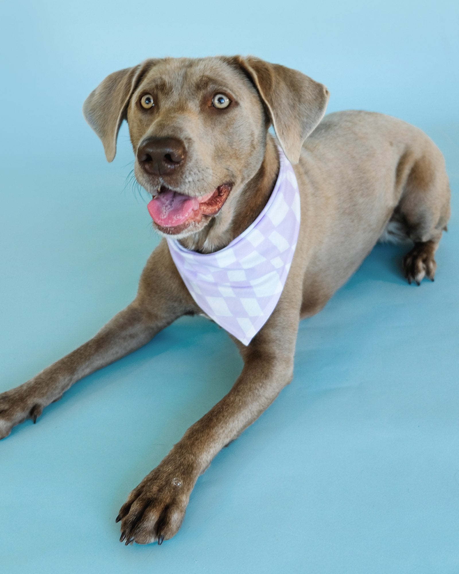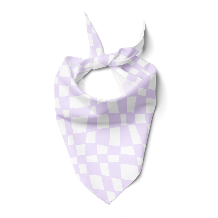 Elevate your dog’s wardrobe with this fashionable and funky lilac checkered bandana. It's the ultimate accessory for your stylish pup looking to stand out and turn heads at the dog park or on the sidewalk. With its soft fabric and easy-tie design, your pup will not only look the part but feel comfortable being the trendsetter they were born to be. It’s the perfect blend of function and fashion for the playful and spirited canine companion.
