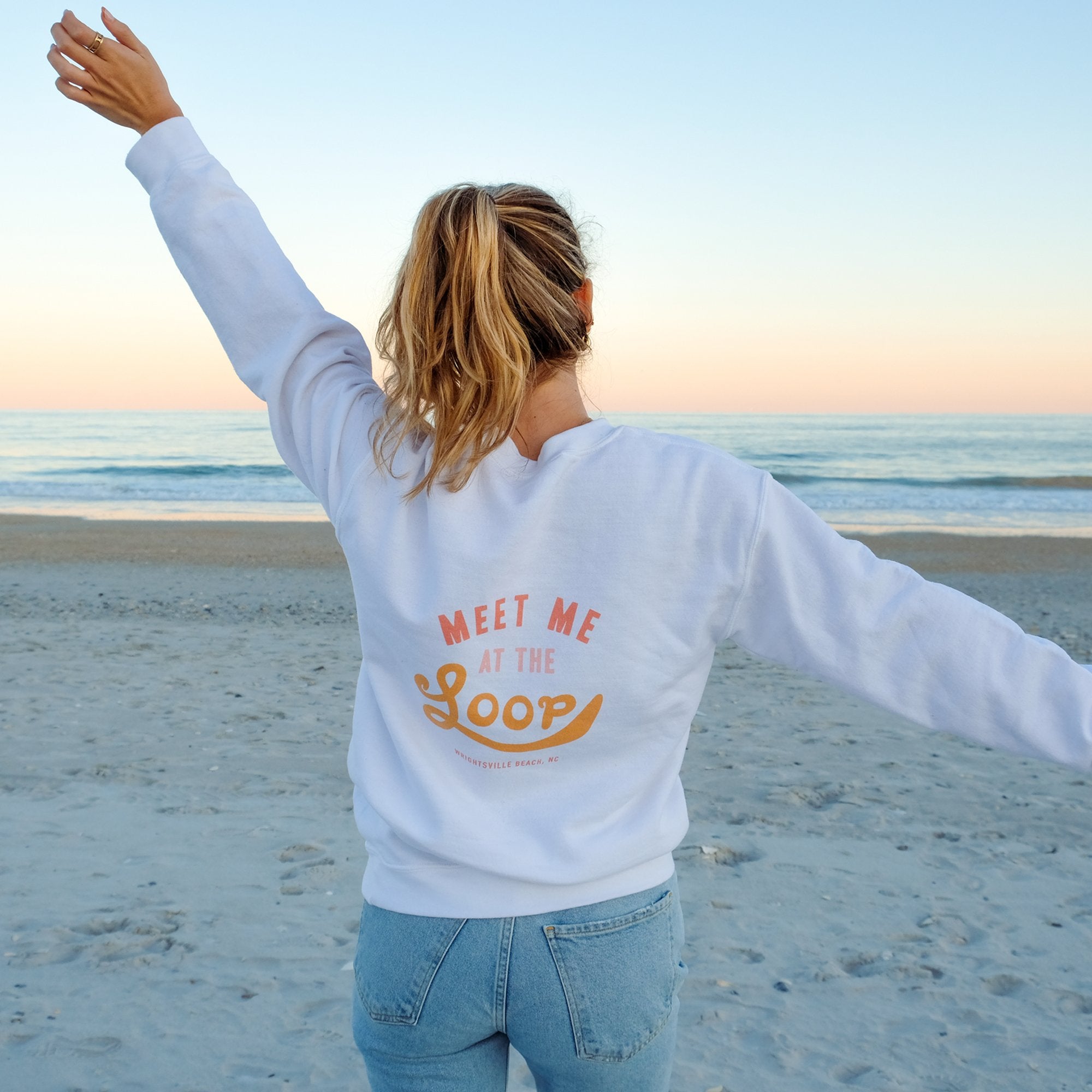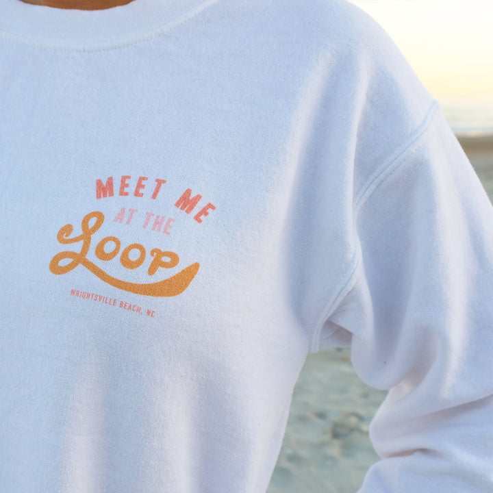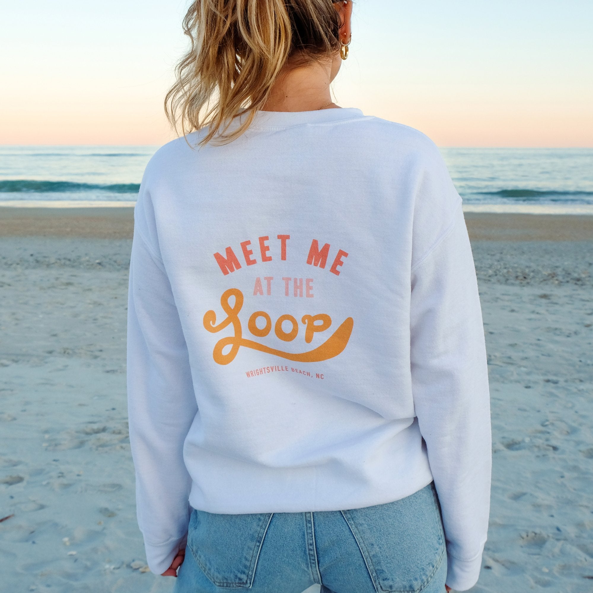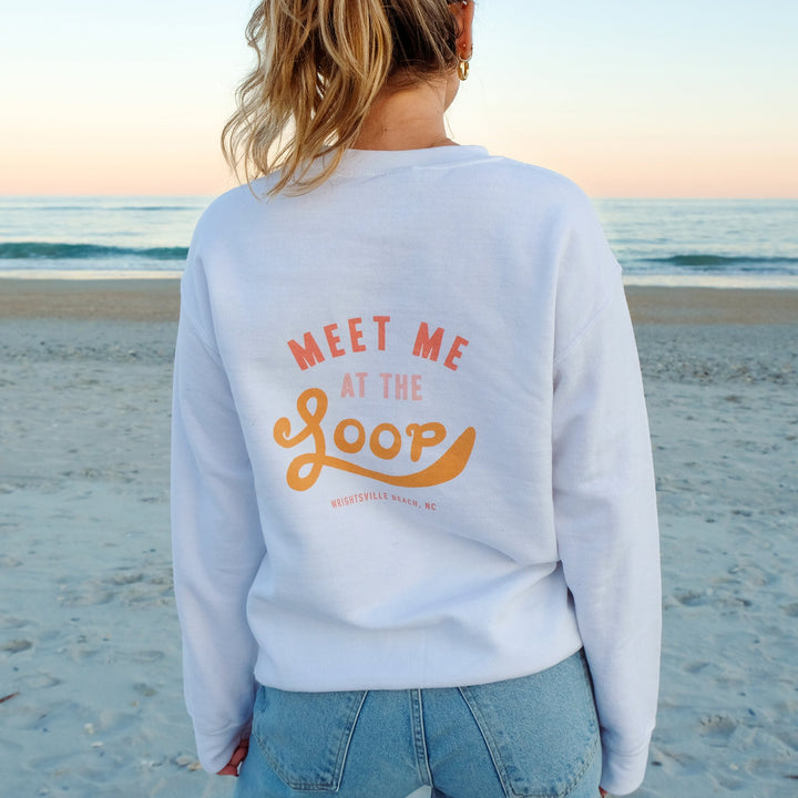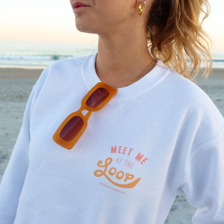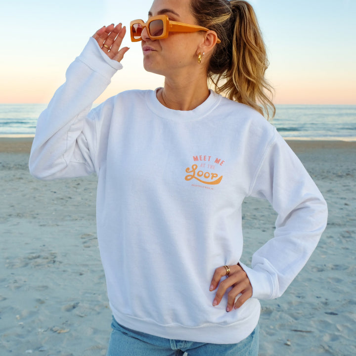 Ditch your tacky touristy Wrightsvile Beach apparel for this cute and trendy Loop crewneck sweatshirt! Represent Wrightsville Beach and Wilmington, NC in style with this ultra cozy, adorable sweatshirt designed by a WB native. “The Loop” is a popular 2.5 mile walk that circles around the heart of Wrightsville Beach. It is a beloved workout and pastime activities that is always filled with joggers, dogs, bikers, and familiar faces.