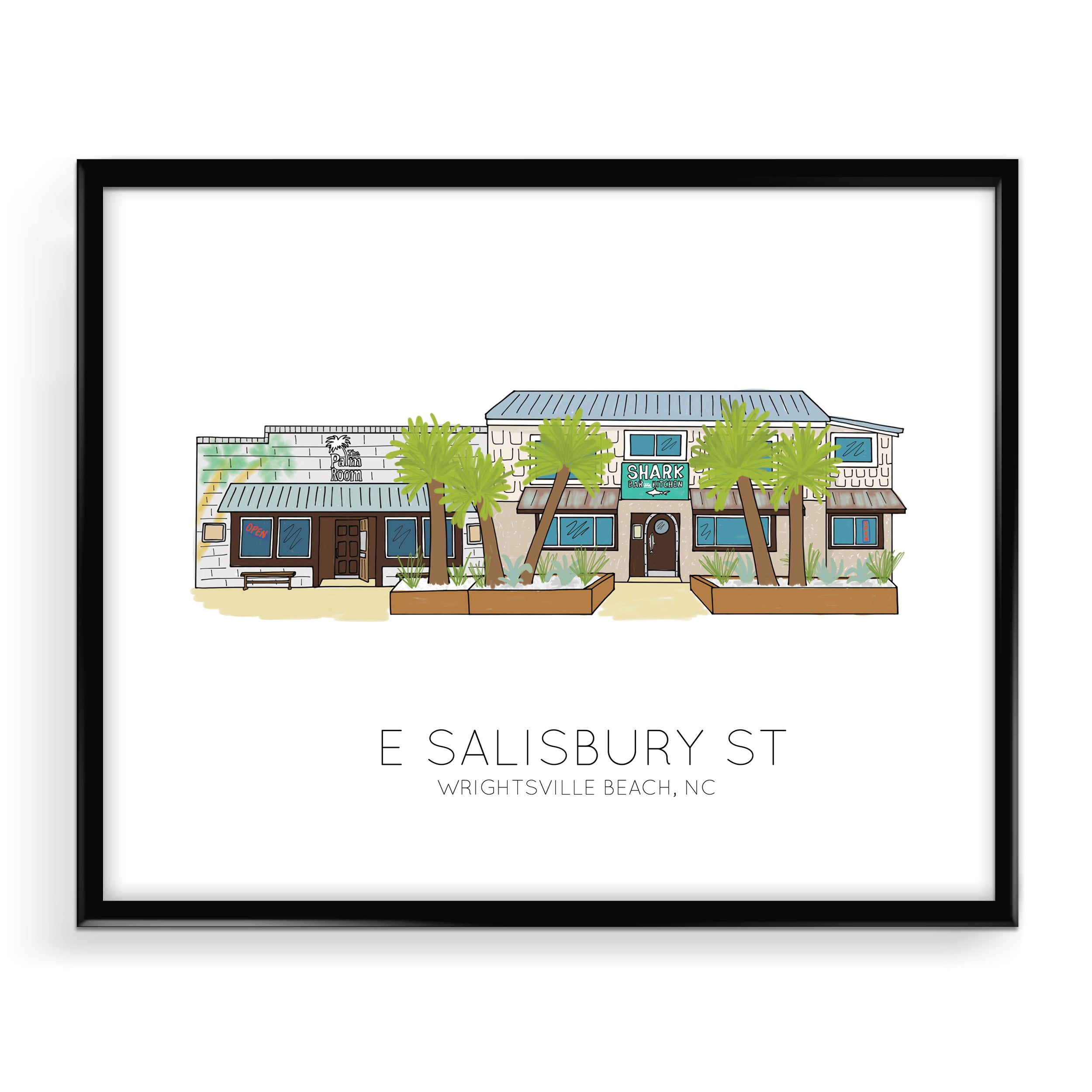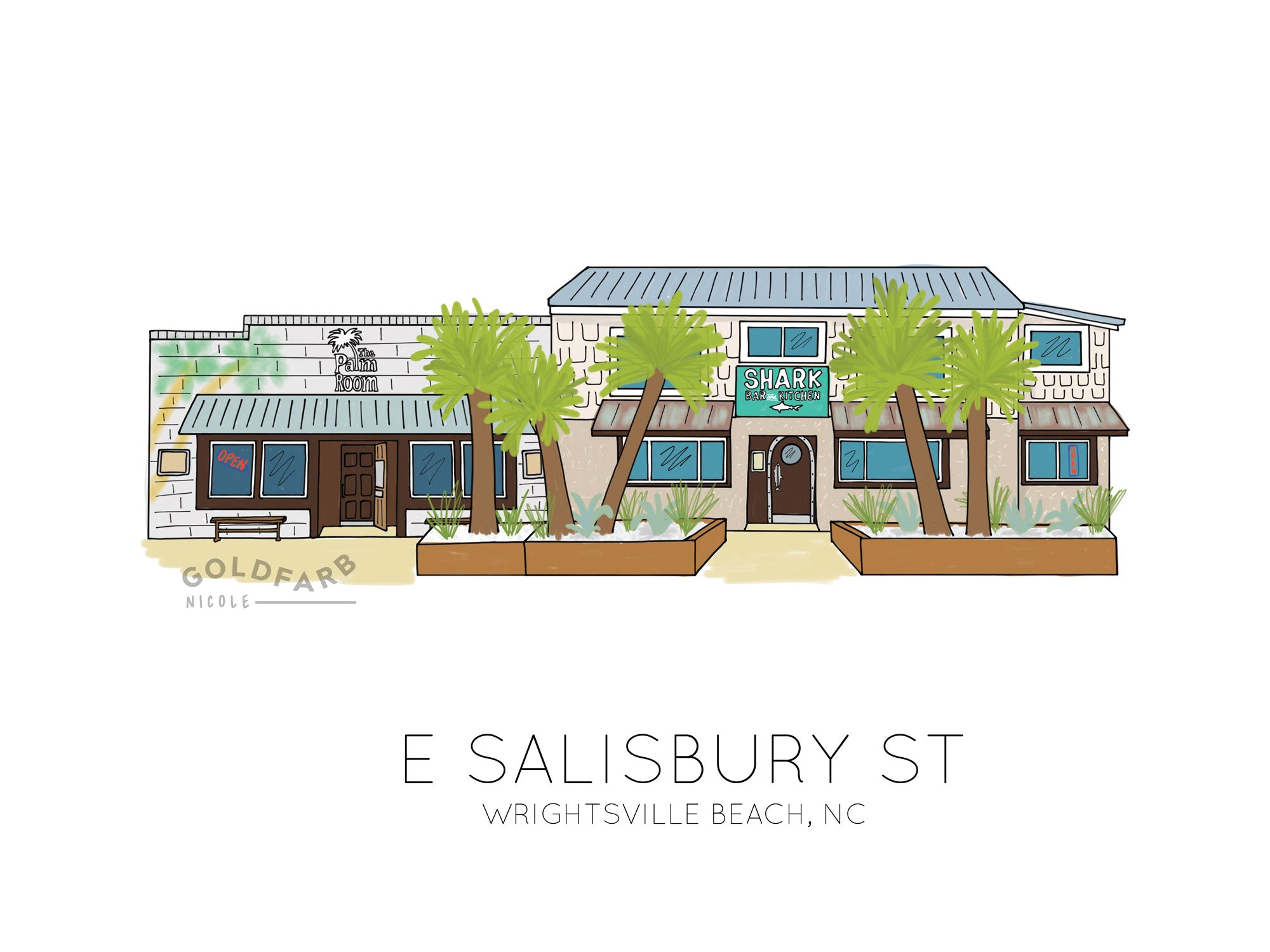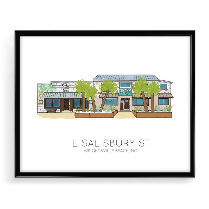 Illustrated art print featuring the iconic Palm Room bar and Shark Bar restaurant located in Wrightsville Beach, North Carolina.