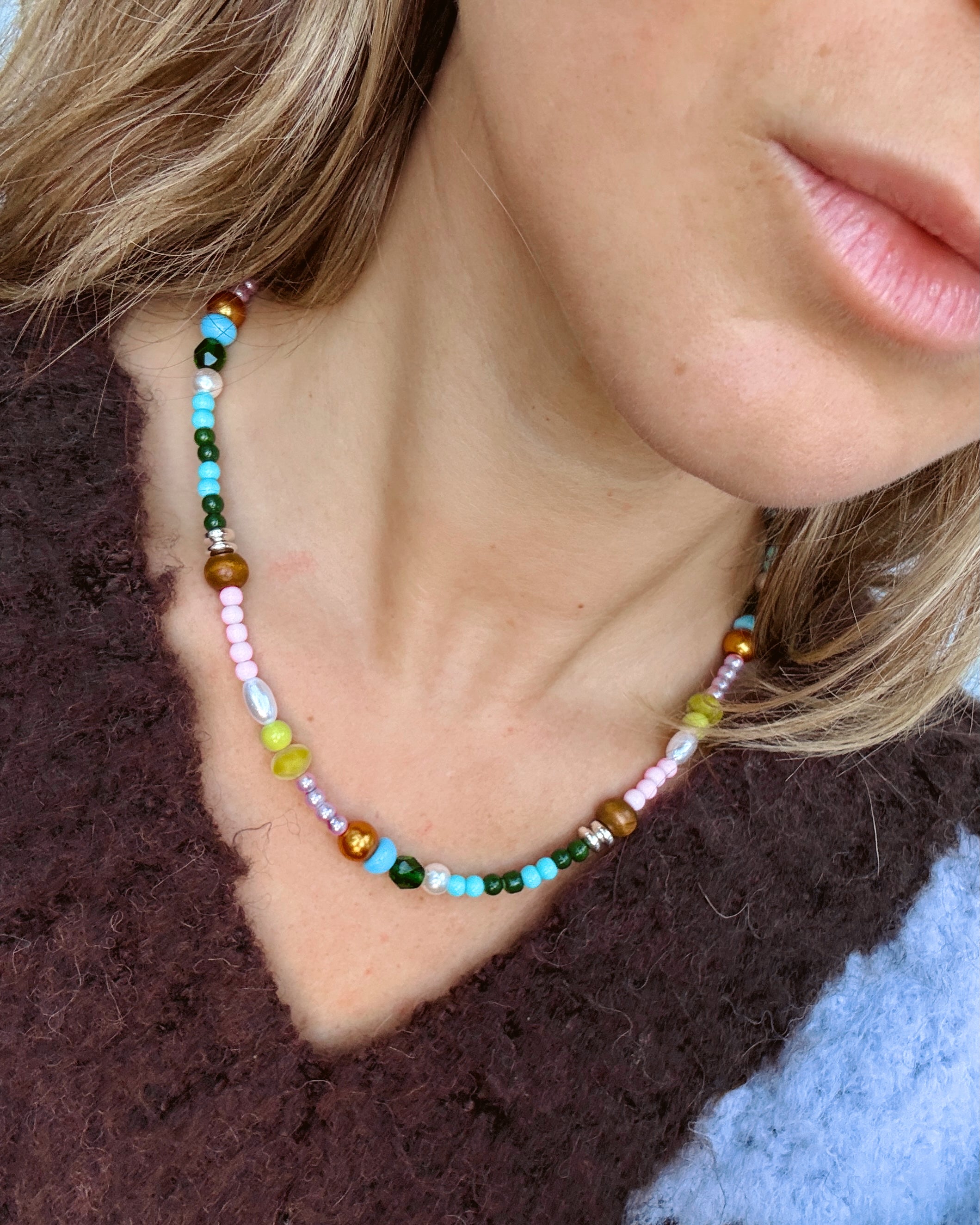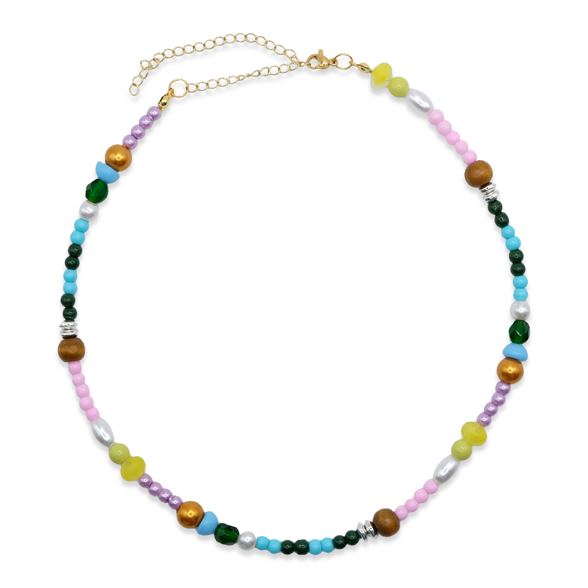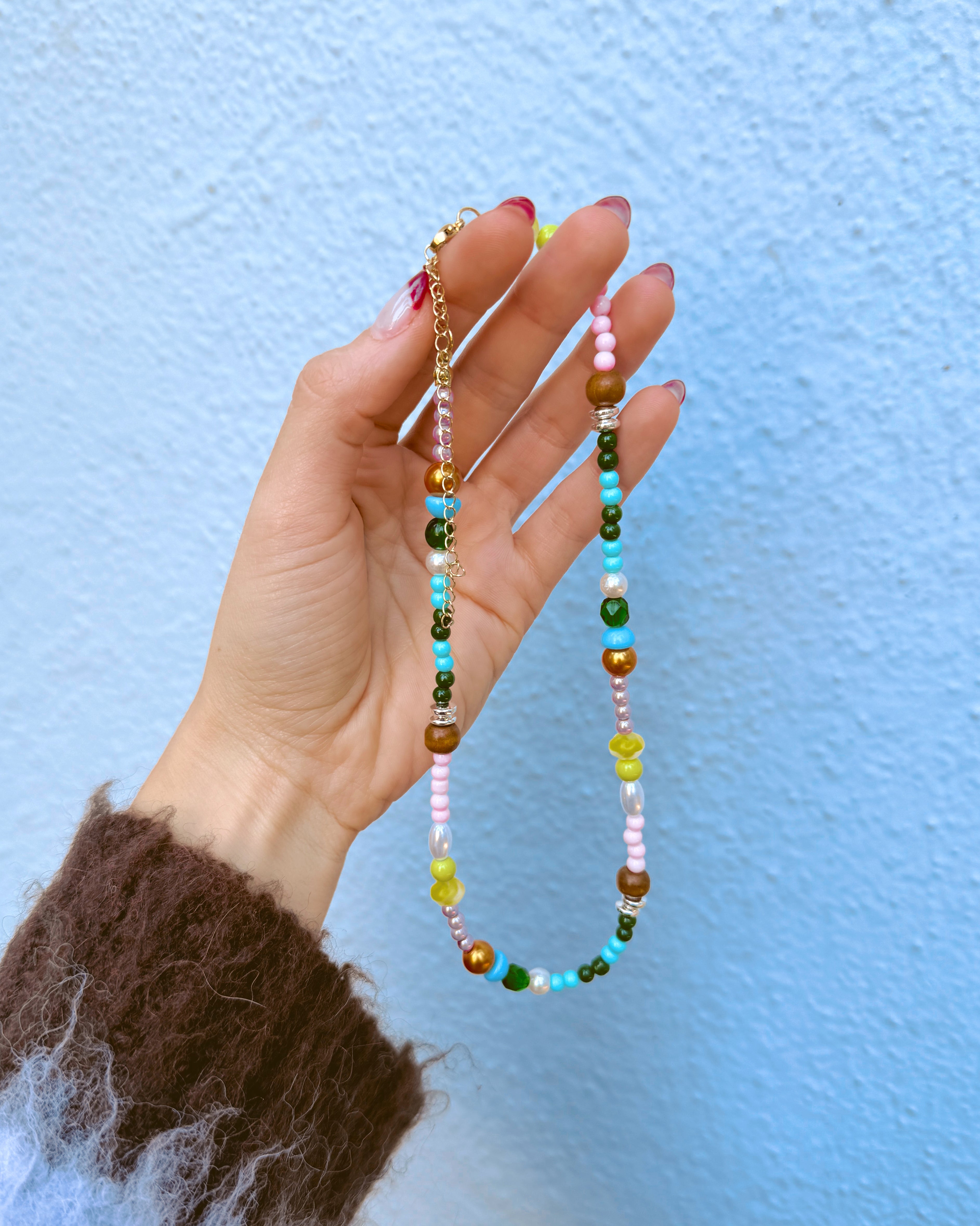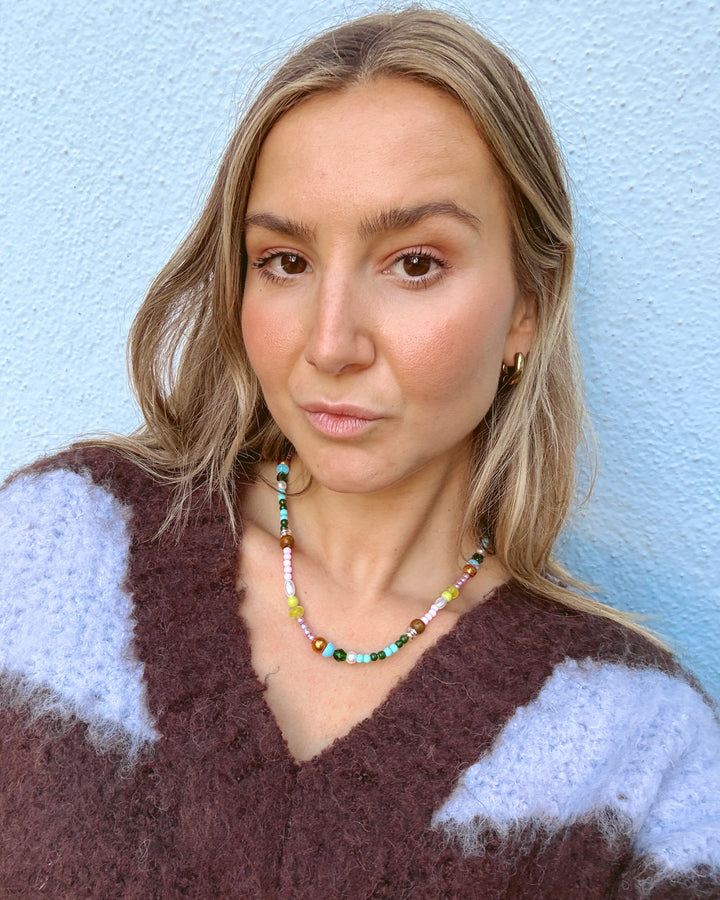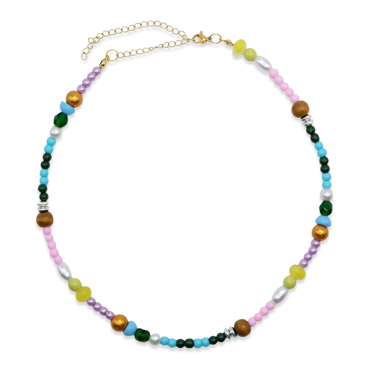 It's giving free-spirited, yet chic. This necklace has a unique mix of beads in different colors, shapes, and textures. Inspired by wildflowers in a field, this necklace is a cute additional to any outfit and is great on its own or stacked with other gold or silver jewelry.