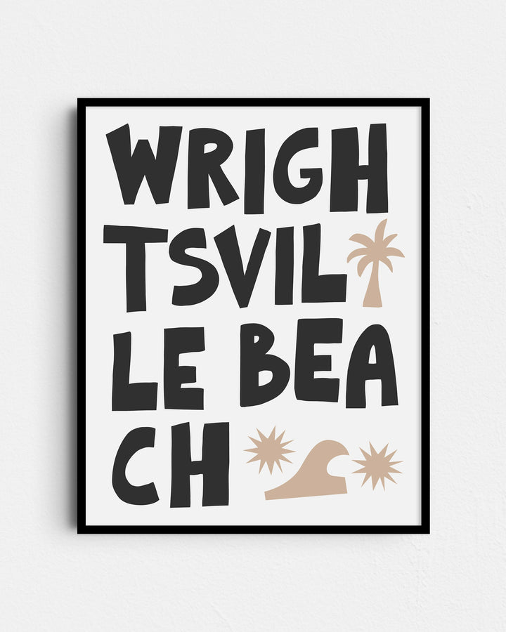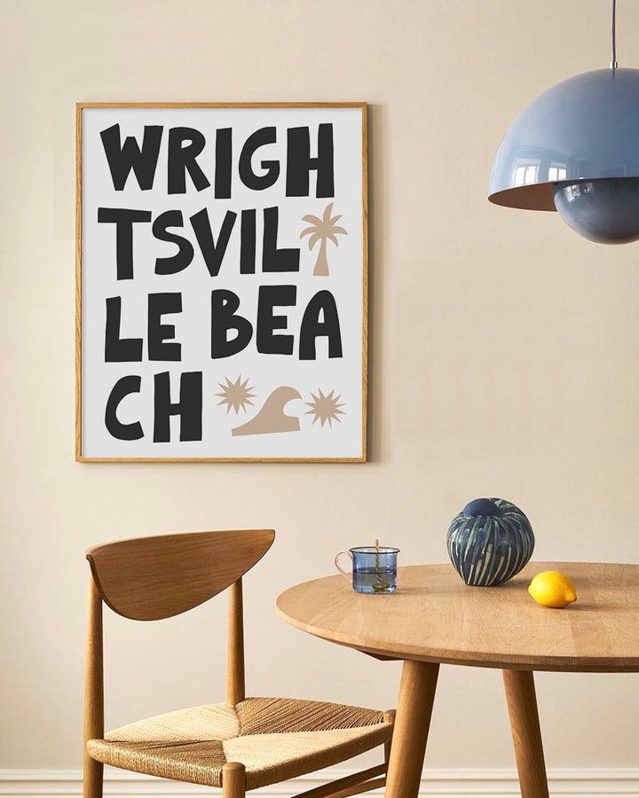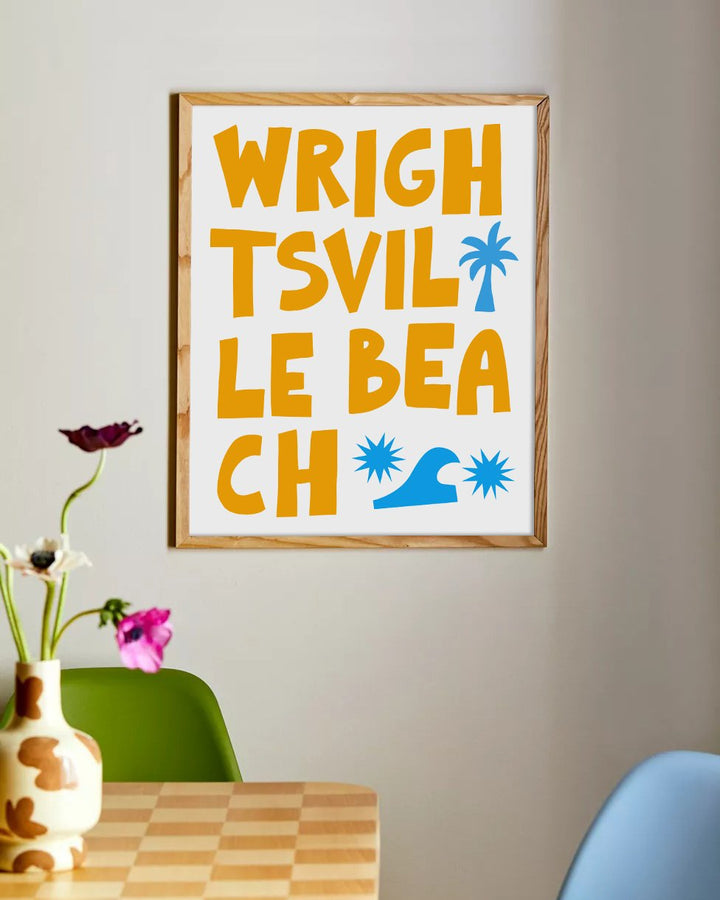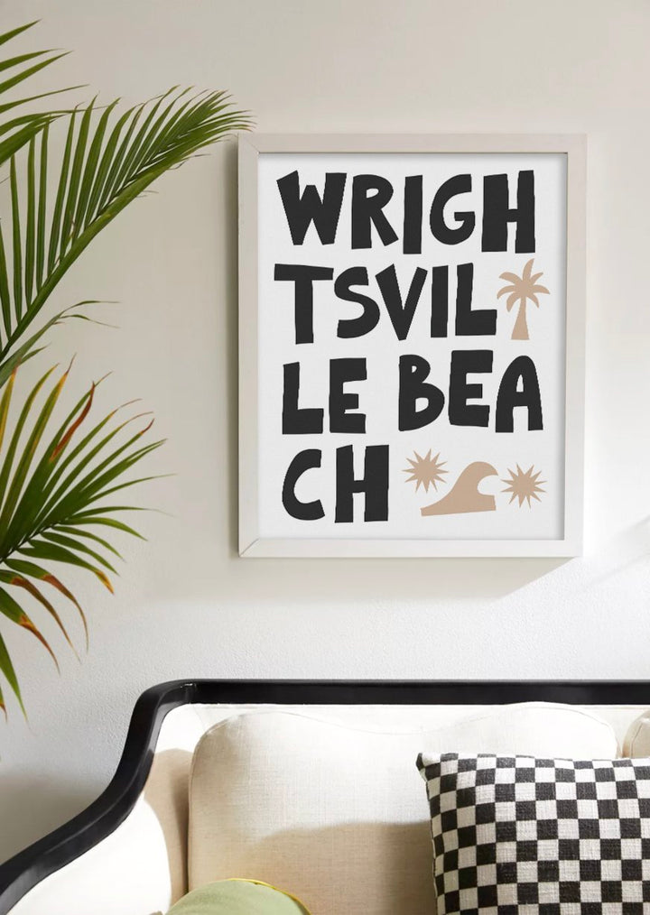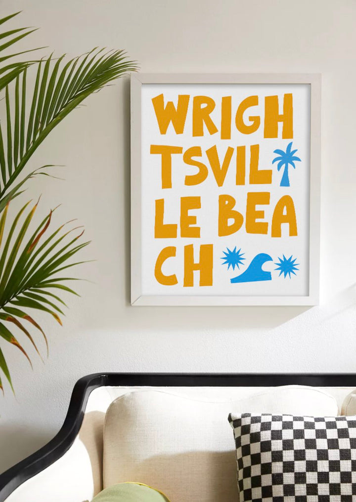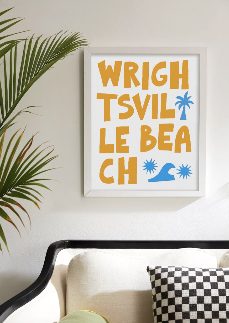 Capture the laid-back essence of coastal living with this striking 'Wrightsville Beach' art print. Its bold, block typography and whimsical graphic icons of palm trees and waves embody the energy of this beloved North Carolina beach town. The clean, modern design makes it a versatile addition to any room, inviting the lively spirit of the seaside into your home. Ideal for beach enthusiasts or as a memento of seaside escapes, this print is a stylish nod to Wrightsville Beach’s sandy shores and sunny days.