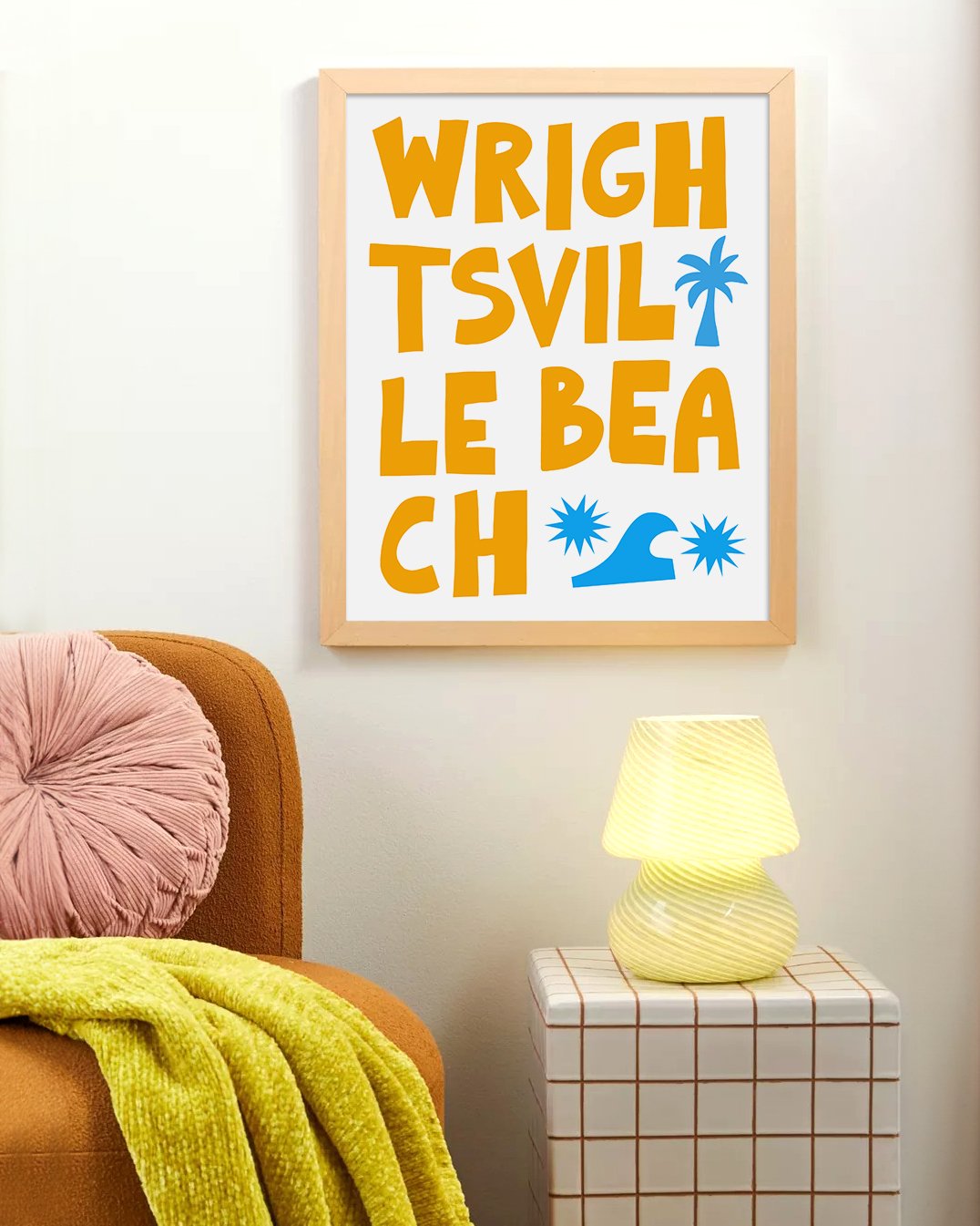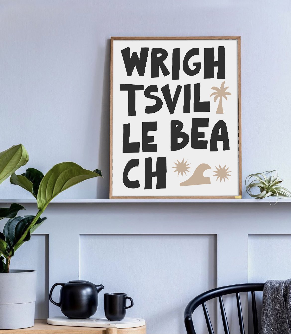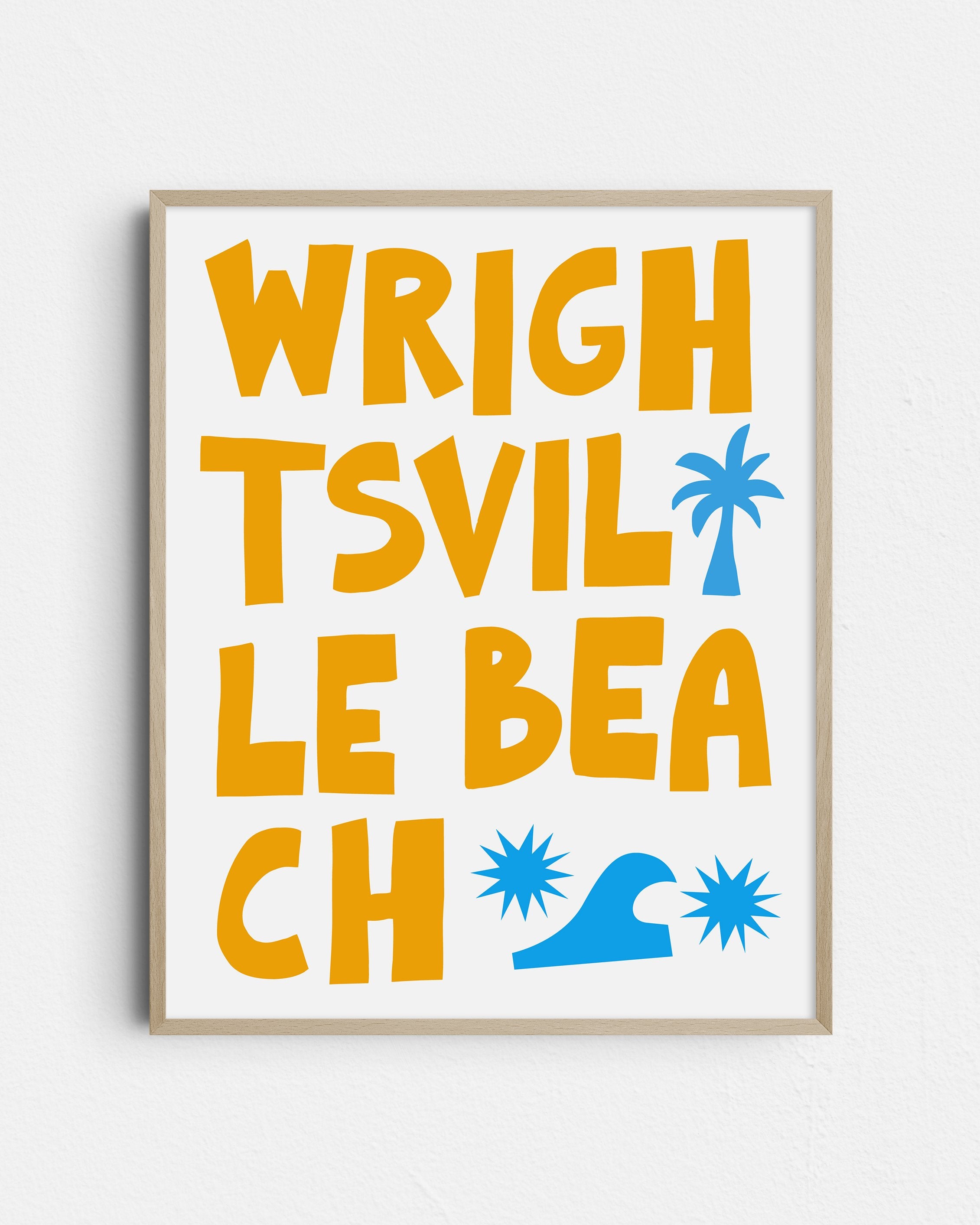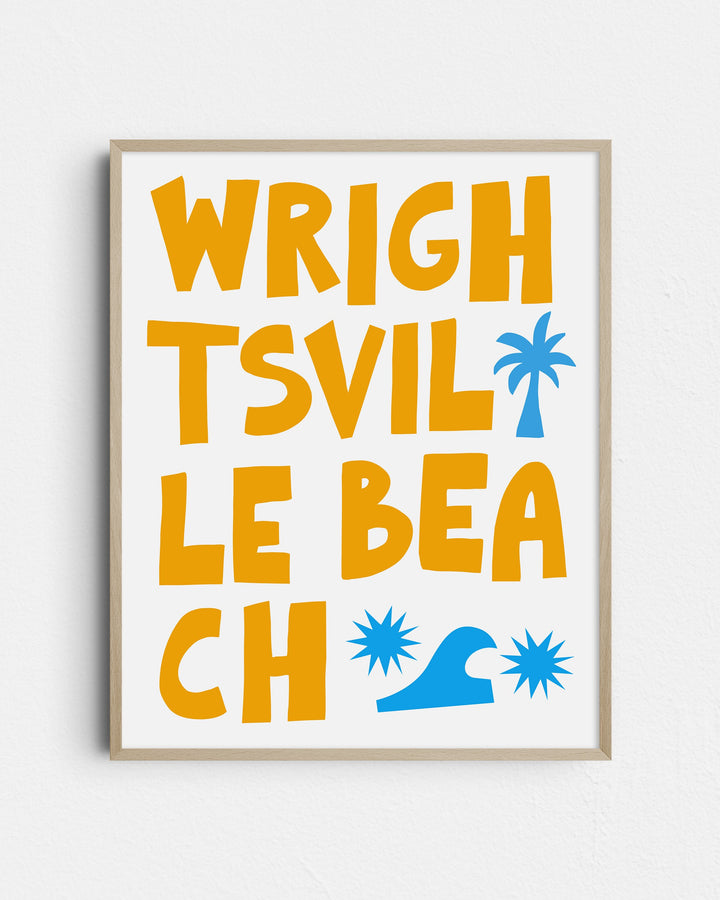 Capture the laid-back essence of coastal living with this striking 'Wrightsville Beach' art print. Its bold, block typography and whimsical graphic icons of palm trees and waves embody the energy of this beloved North Carolina beach town. The clean, modern design makes it a versatile addition to any room, inviting the lively spirit of the seaside into your home. Ideal for beach enthusiasts or as a memento of seaside escapes, this print is a stylish nod to Wrightsville Beach’s sandy shores and sunny days.