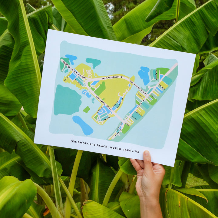 Colorful and whimsical map art of Wrightsville Beach, North Carolina in a cheerful green. This wall art features the iconic Wrightsville Beach Loop, Stone Street, N. Lumina Ave and so much more. Hang this art in your beach house or display it as a reminder of all the fun times had in this tropical, sunny paradise!