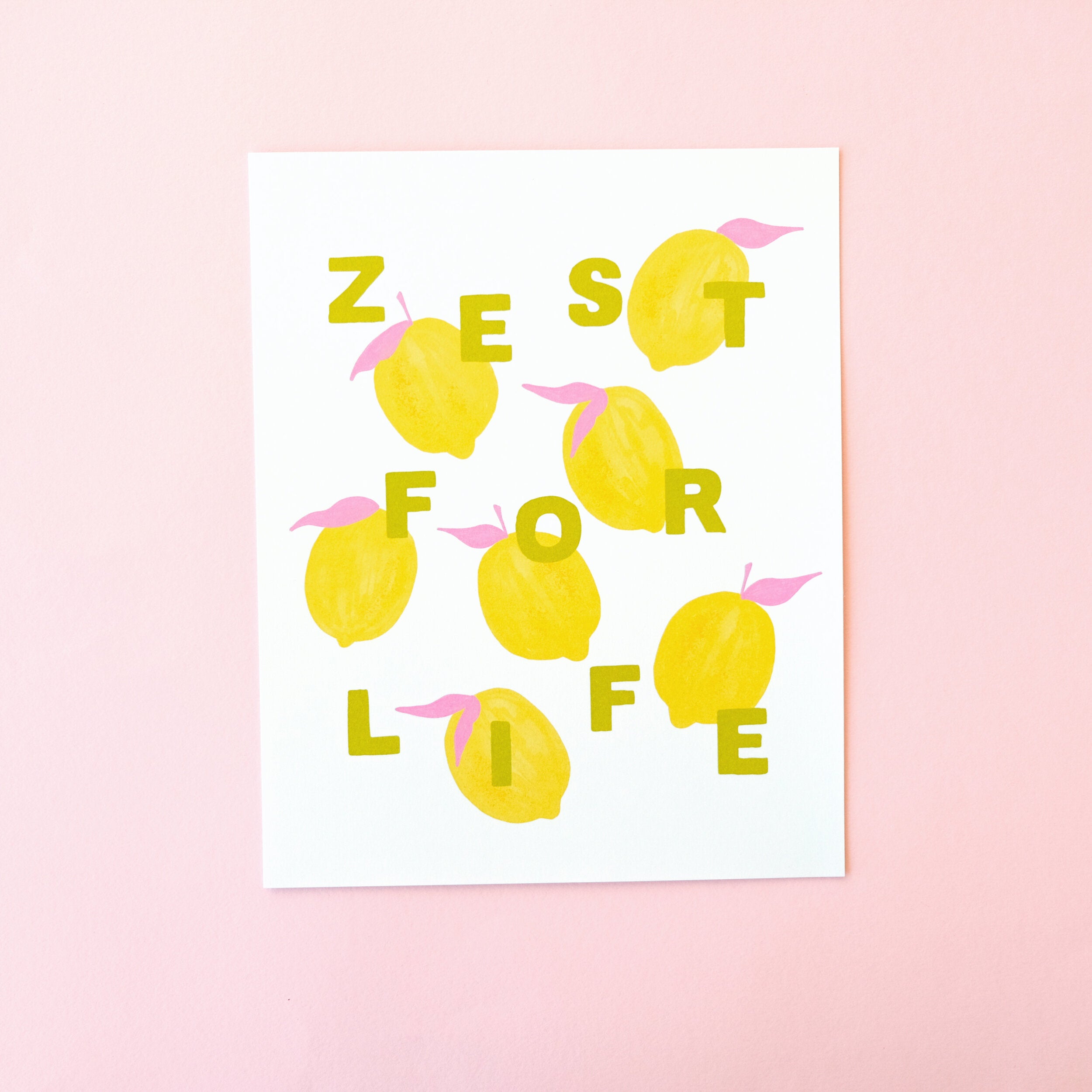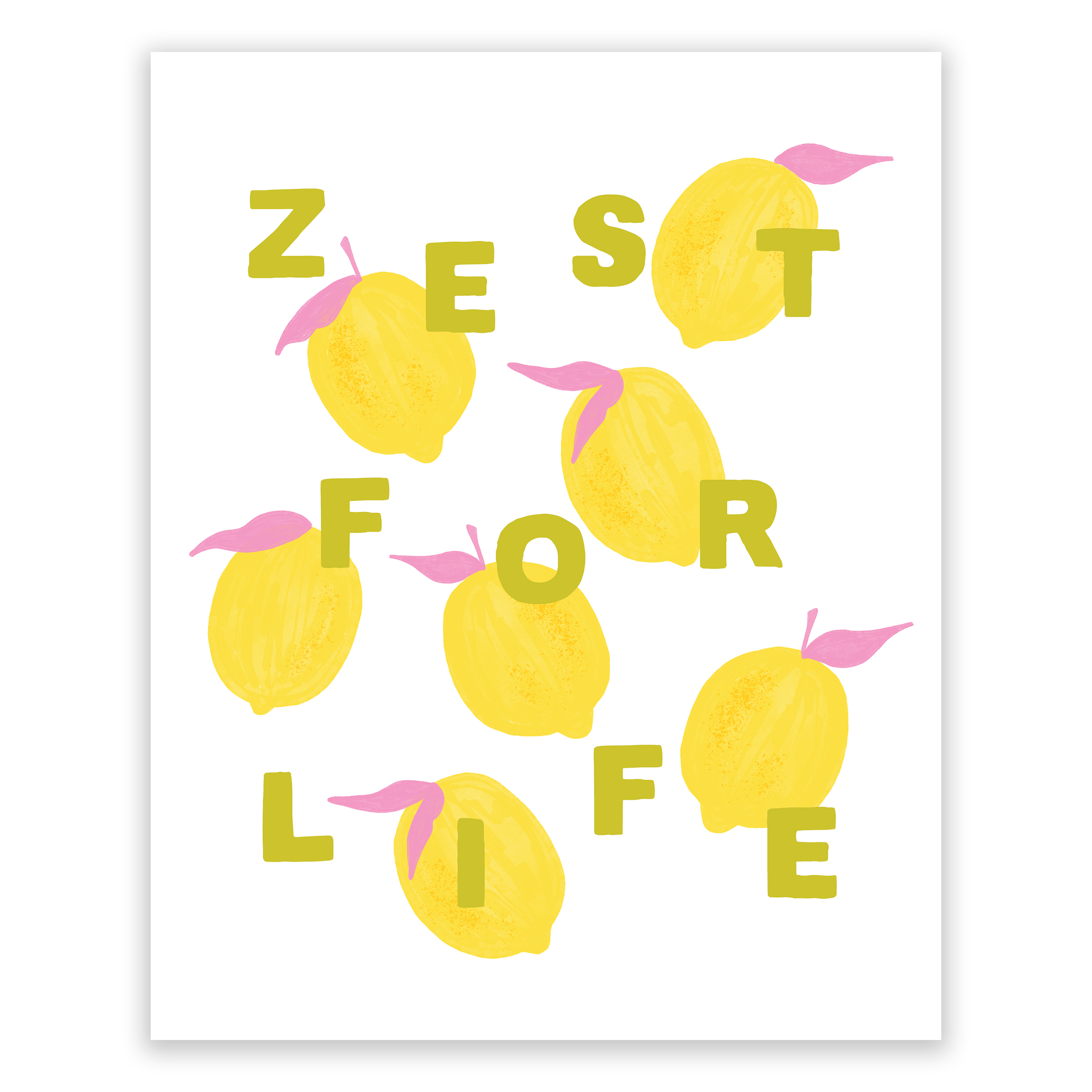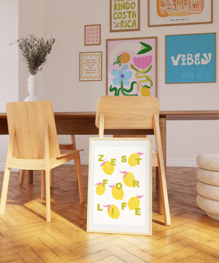 Add some cheer to your kitchen or dining room with this lemon-themed art print that playfully spells out "Zest for Life" among vibrant citrus illustrations. This piece is a perfect slice of inspiration for your home, infusing it with a fresh, lively spirit. It's an adorable reminder to embrace the day with enthusiasm, ideal for hanging in spaces that could use a burst of positivity and color.